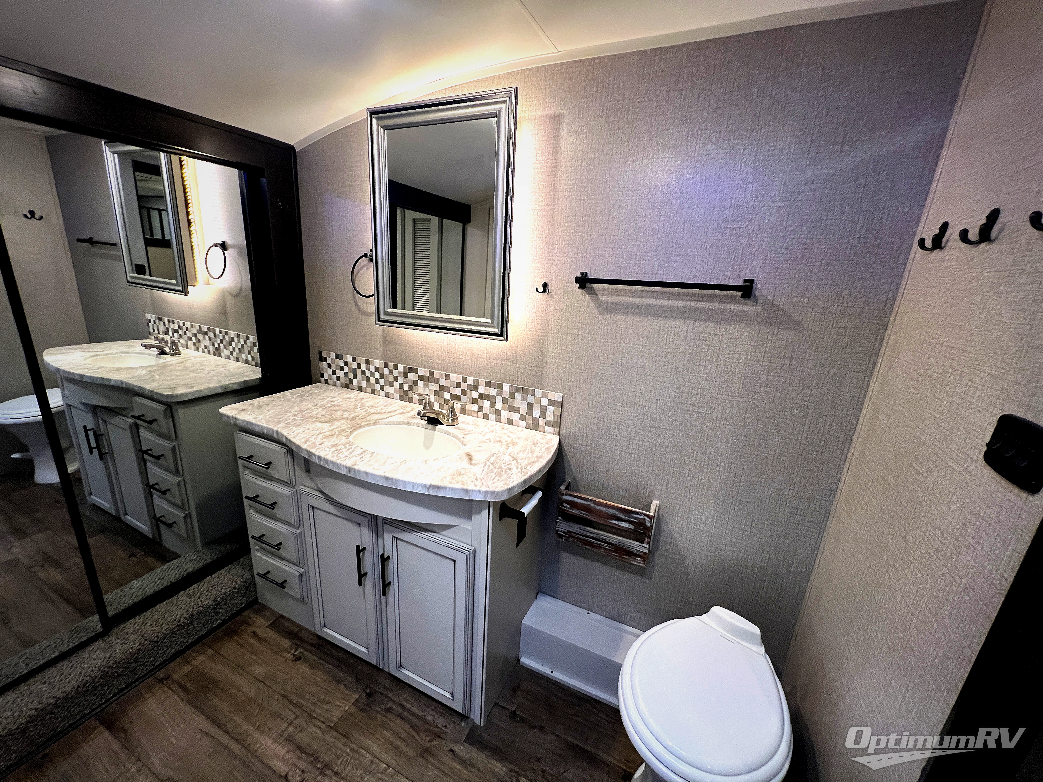 Check out the industry's first front full bathroom and half bathroom with a loft above it in this fifth wheel! Inside the front bathroom is a shower with a seat and a walk-in closet with an area prepped to add the optional washer and dryer, plus it leads right into the private bedroom that has a queen bed but can be switched out for the optional king Serta mattress. The kitchen island will make meal prepping easy and the free standing dinette is a great place to enjoy your meals then play a card game or two. The rear living area features a tri-fold sofa that can be used for seating during the day and a sleeping space at night, and theater seating across from the entertainment center with a fireplace and 50" HDTV with a JBL sound system. Outside you will find many handy features like the two electric awnings, the electric auto-leveling, the JAY COMMAND Smart RV technology, and the pass-through storage area!