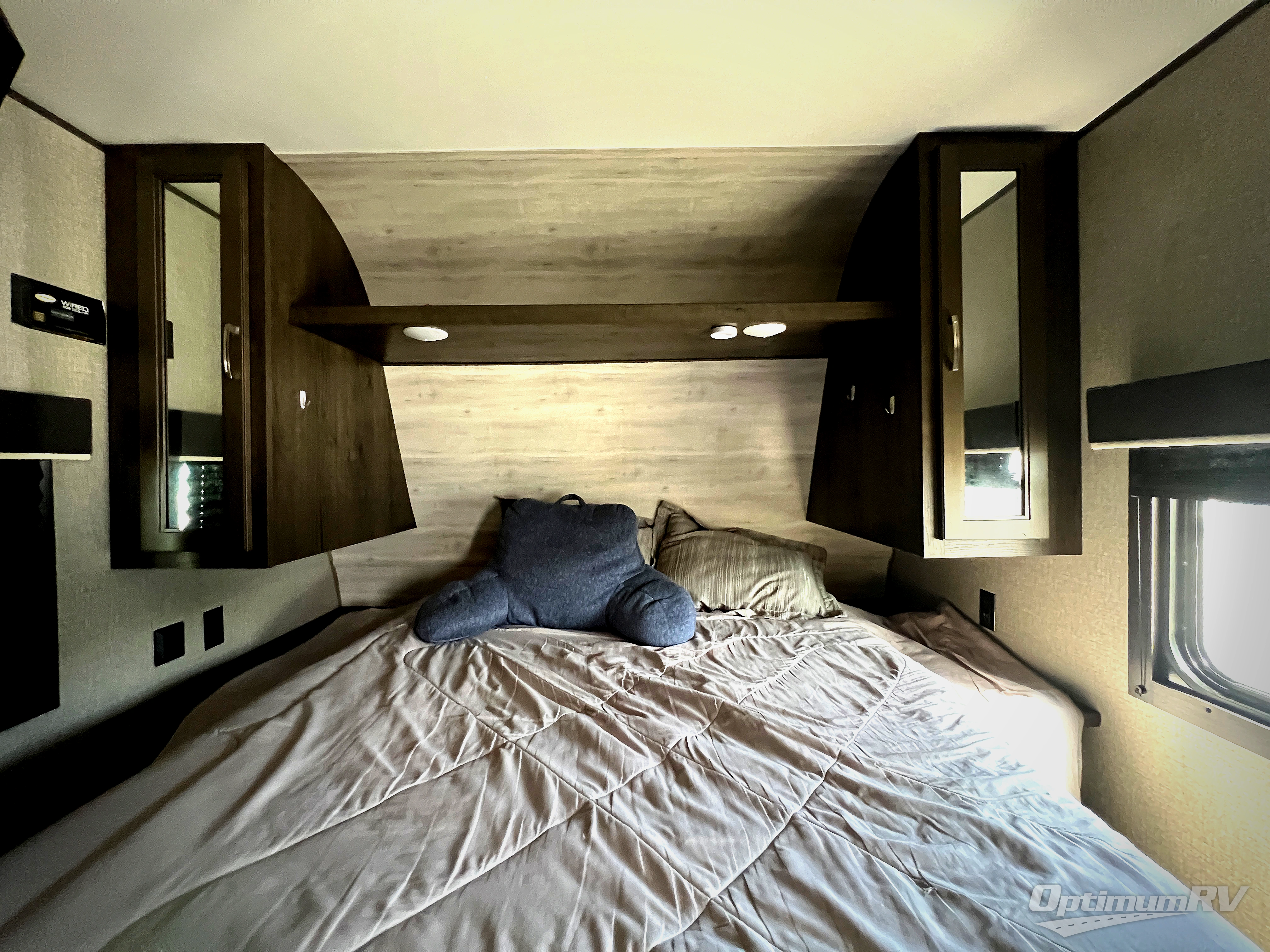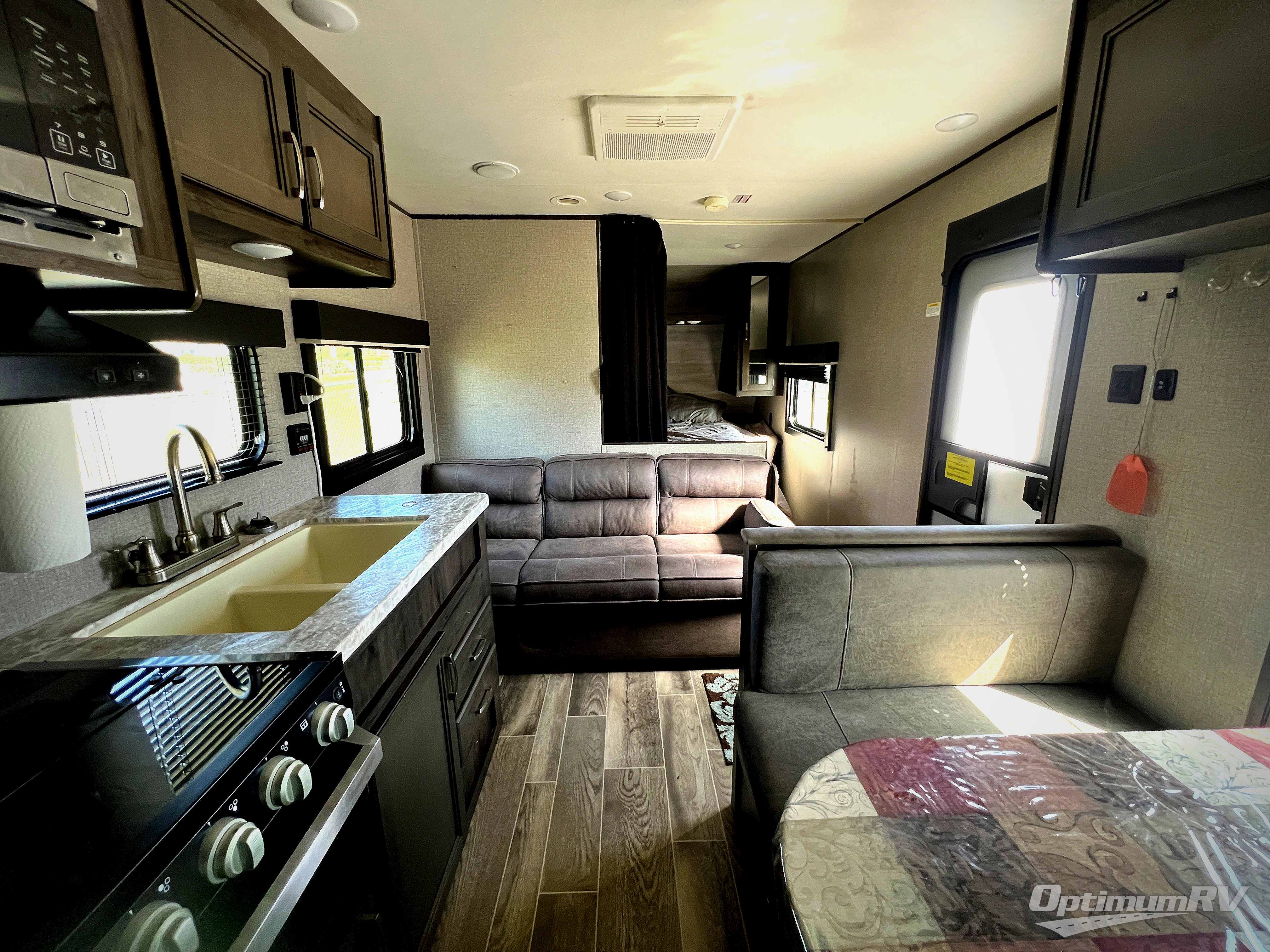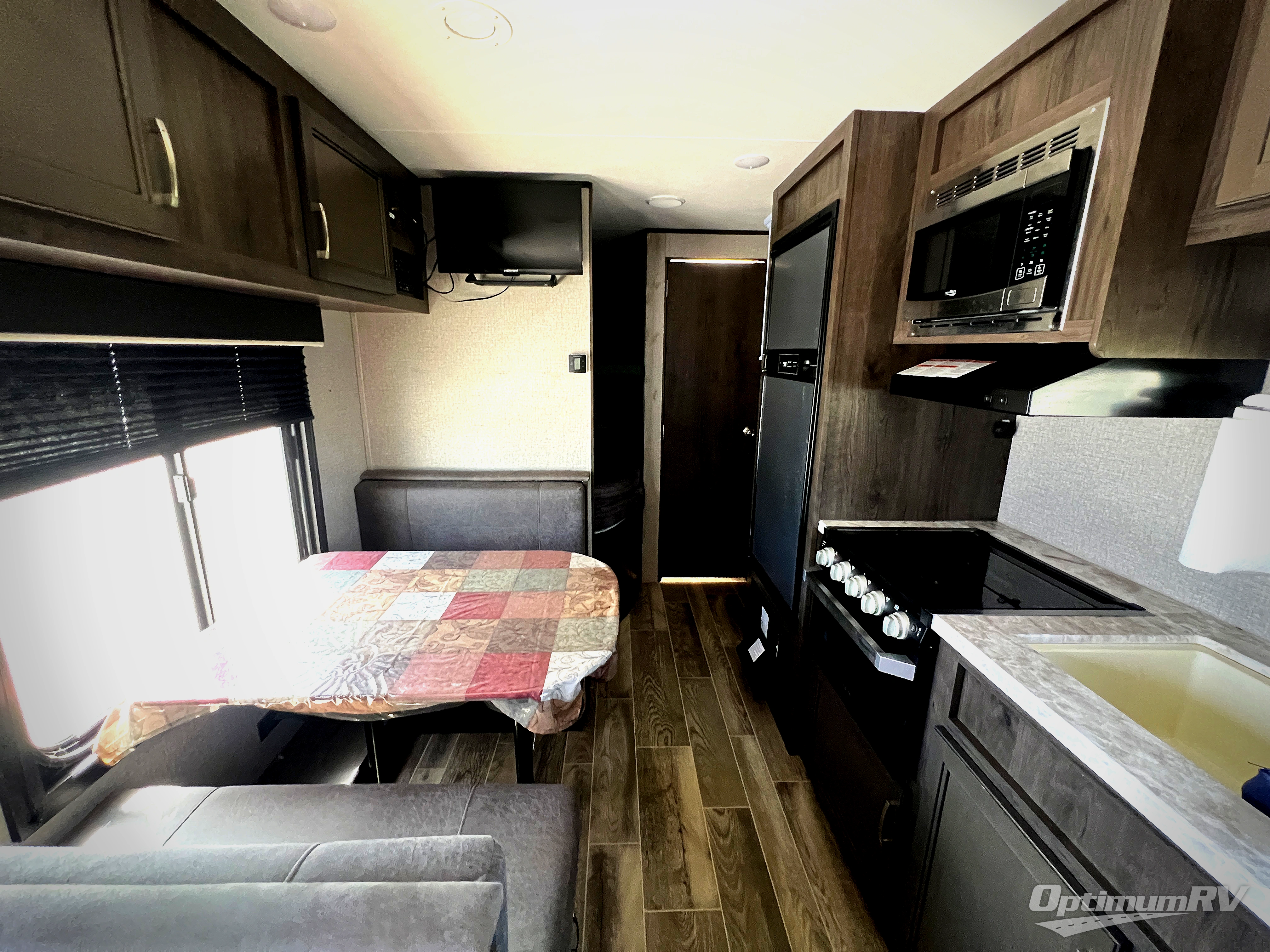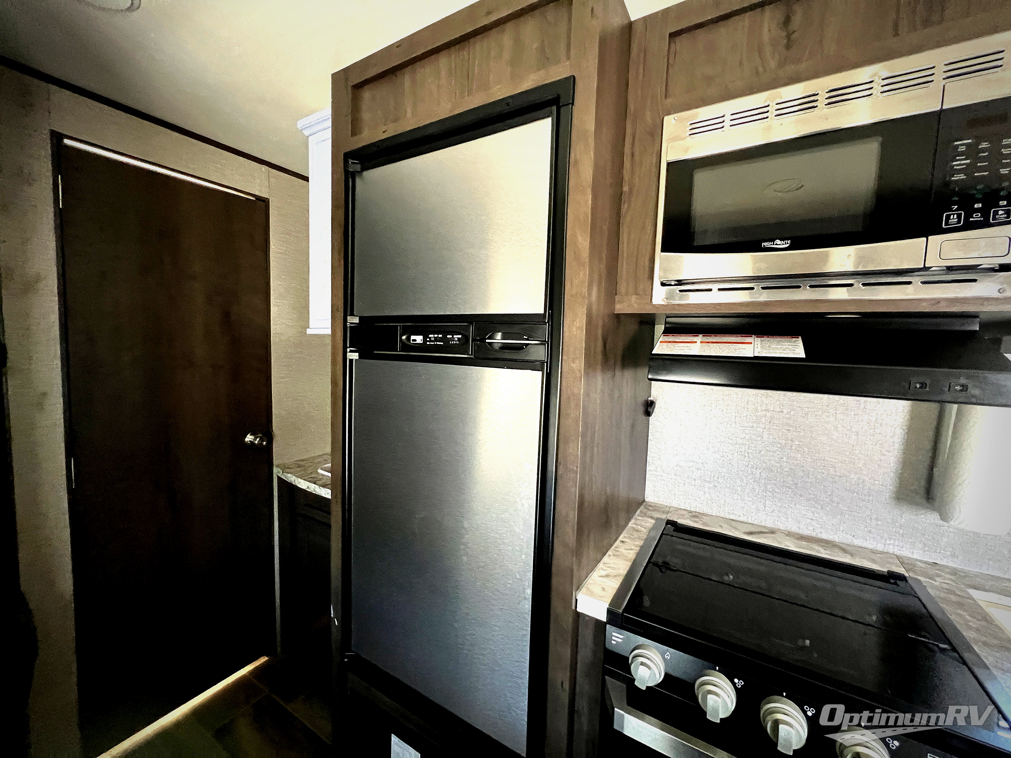 The whole family can head to the campground with this travel trailer! Everyone will start each day feeling re-charged and ready to go after sleeping on the rear corner double bunk beds and the front queen bed, plus the sofa and the booth dinette can also transform into extra sleeping spaces for any friends that want to tag along. The rear corner bathroom comes with a tub/shower that has a skylight above for natural lighting and a wood trimmed mirror to make you feel more at home. There is plenty of storage inside and out between the overhead cabinets, the wardrobes, and the exterior pass-through storage area. You can also add the optional Chil N' Stor feature to the exterior so that you can enjoy a nice, cold beverage without having to go inside to get one!