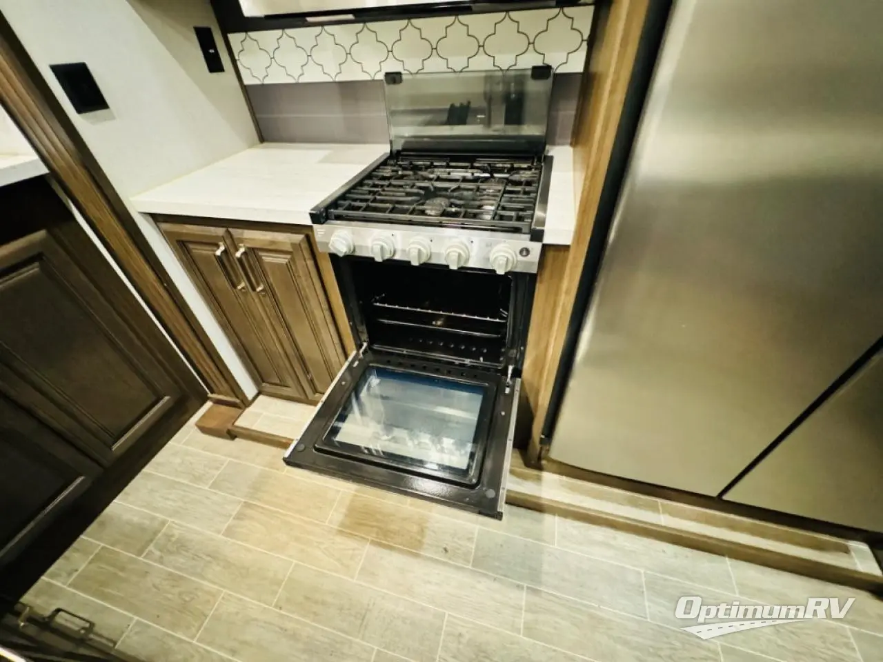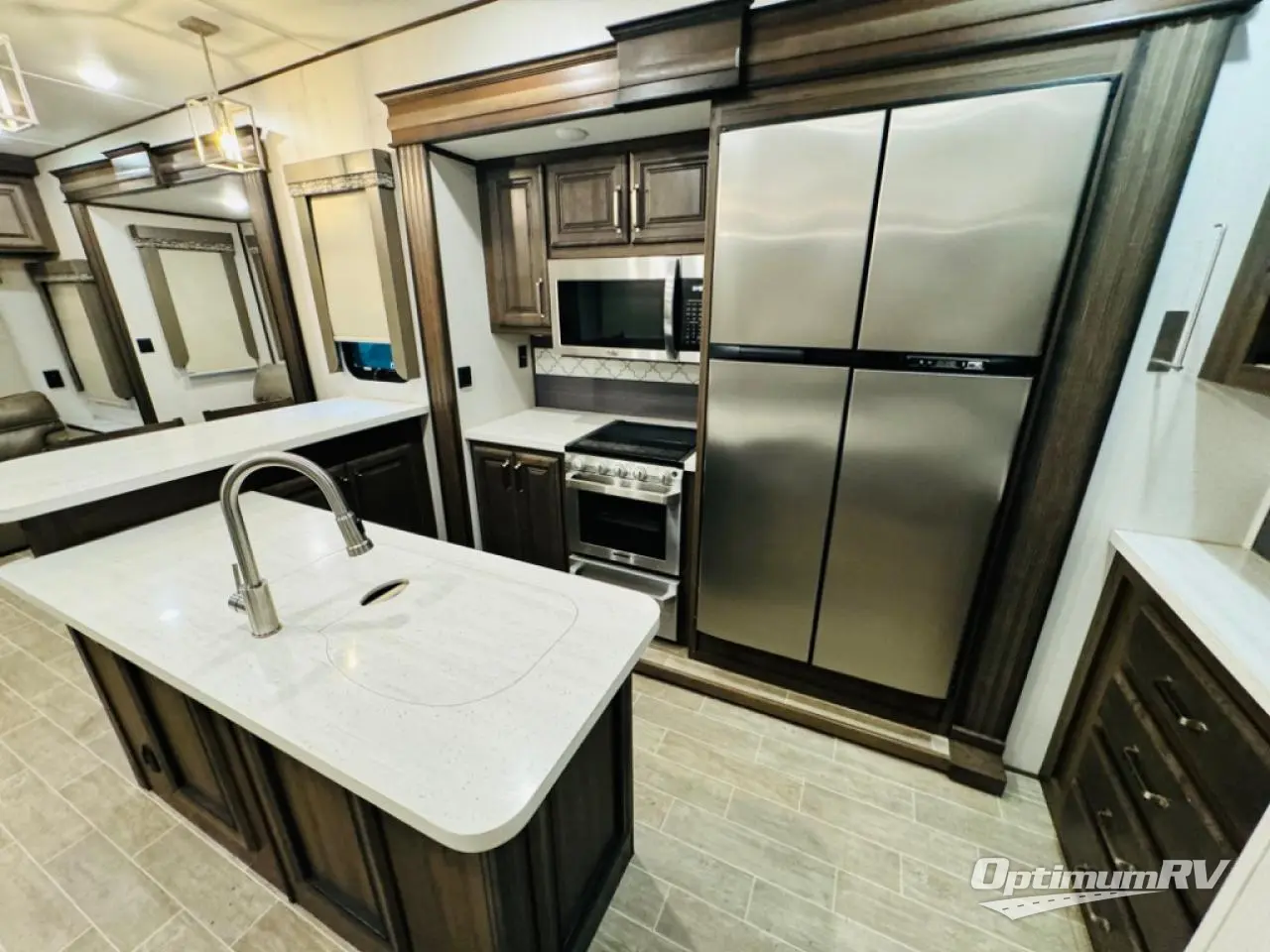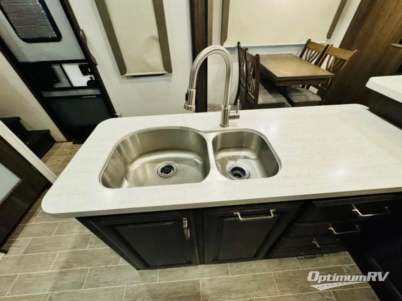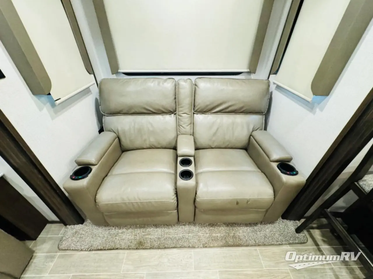 This grand kitchen offers the cook their own space to prepare and serve meals from the large L-shaped counter peninsula bar with stools, and the large pantry and curio will come in handy as well. Dining is also available at the free standing dinette with four chairs and some might even enjoy sitting on the hide-a-bed sofa sleeper, and theater seats that are equipped with heat, massage, LED lights and USB charging. The master bedroom offers a king bed with storage underneath and lots of storage plus a space prepped for a washer/dryer option. Having a separate living area from the kitchen gives everyone their space and outside there are two power awnings offering an outdoor living area protected from the elements. The cook will enjoy the outside kitchen amenities, and if you need more cold storage, add the optional residential refrigerator.