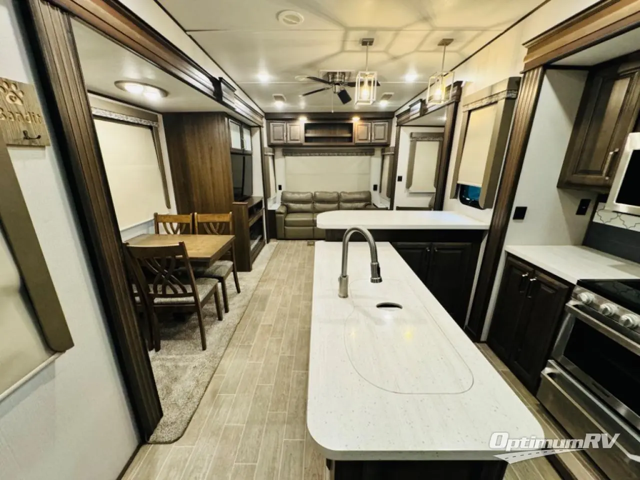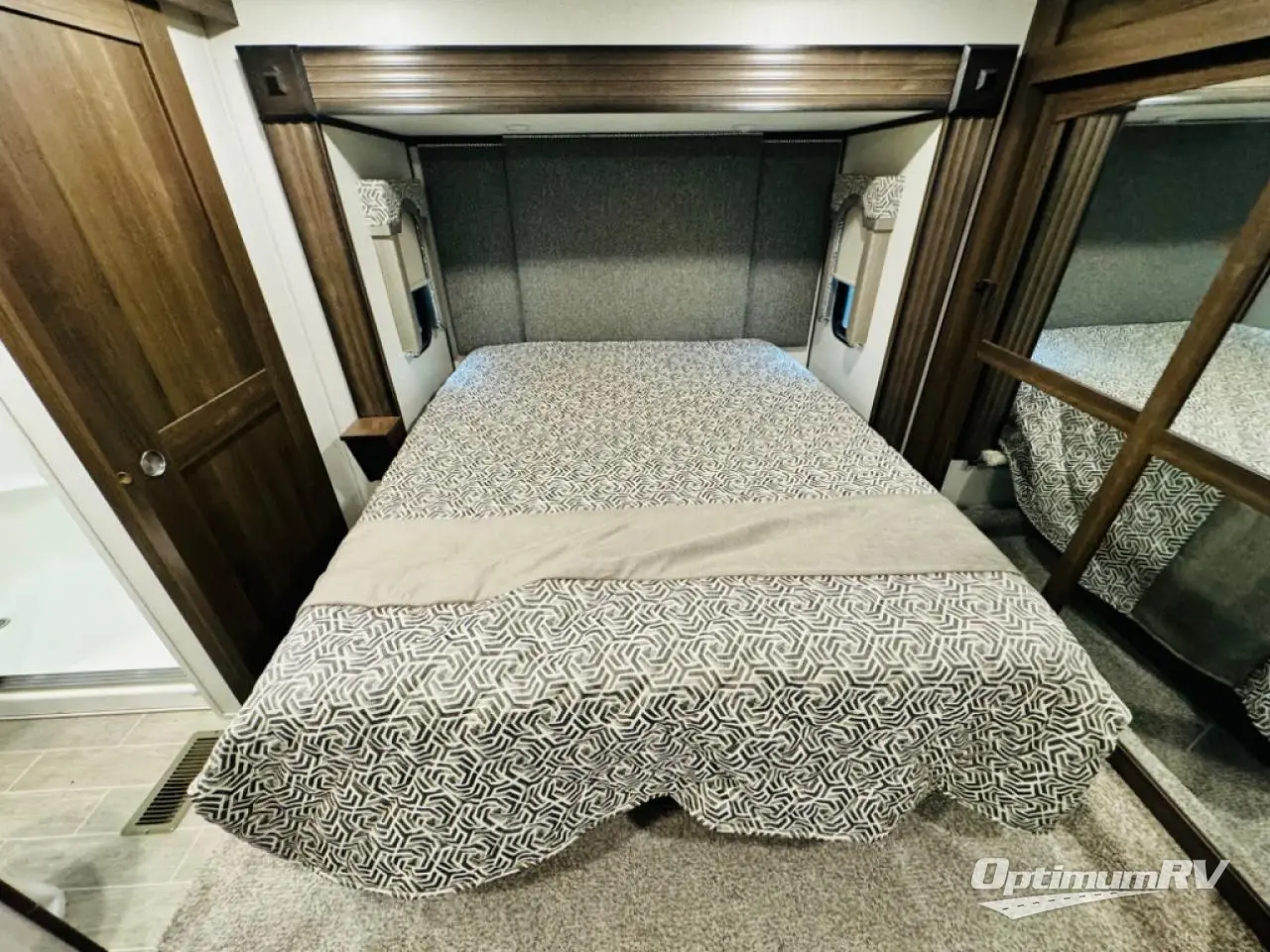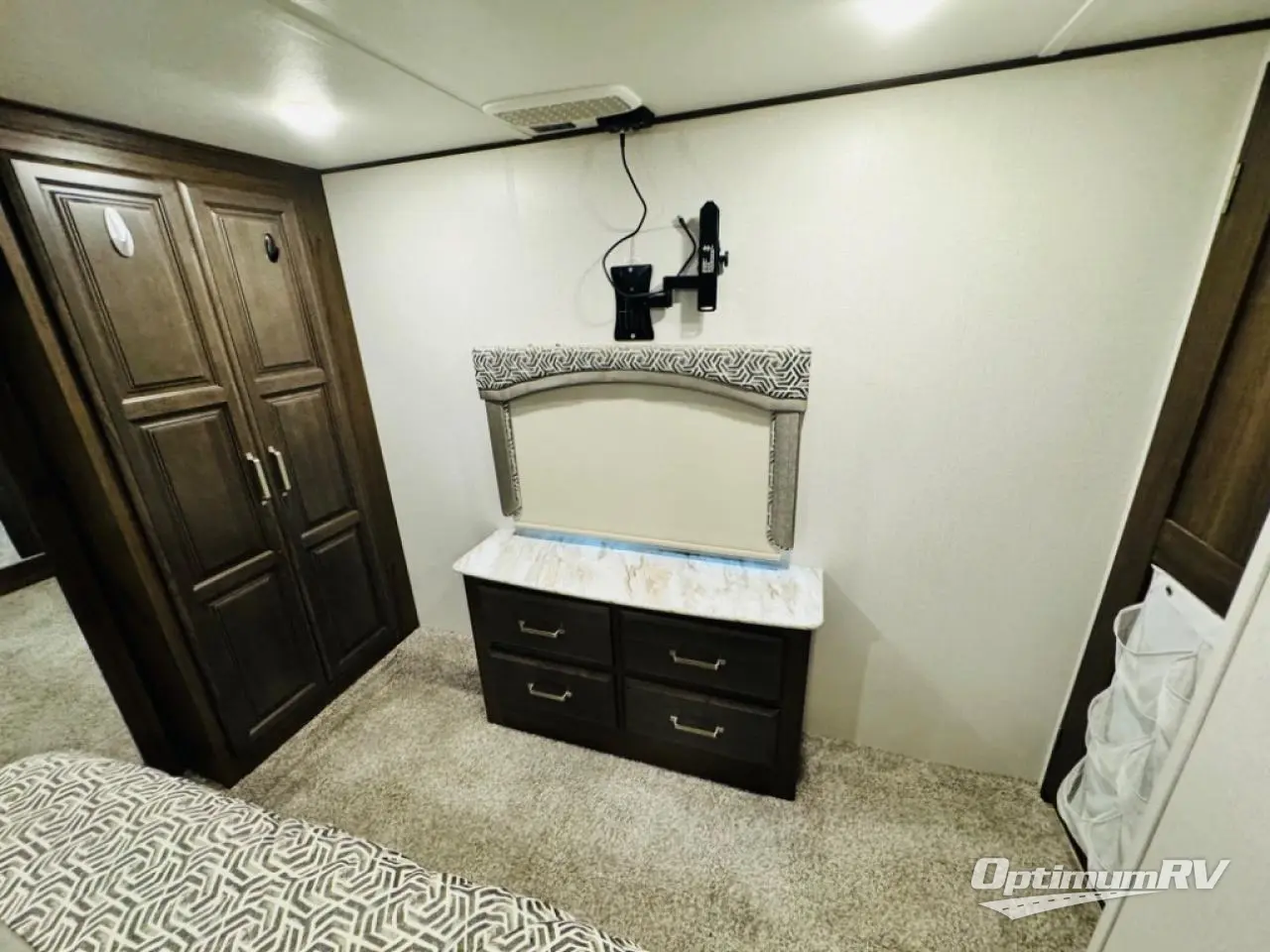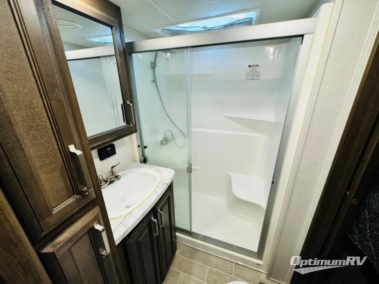 This grand kitchen offers the cook their own space to prepare and serve meals from the large L-shaped counter peninsula bar with stools, and the large pantry and curio will come in handy as well. Dining is also available at the free standing dinette with four chairs and some might even enjoy sitting on the hide-a-bed sofa sleeper, and theater seats that are equipped with heat, massage, LED lights and USB charging. The master bedroom offers a king bed with storage underneath and lots of storage plus a space prepped for a washer/dryer option. Having a separate living area from the kitchen gives everyone their space and outside there are two power awnings offering an outdoor living area protected from the elements. The cook will enjoy the outside kitchen amenities, and if you need more cold storage, add the optional residential refrigerator.
