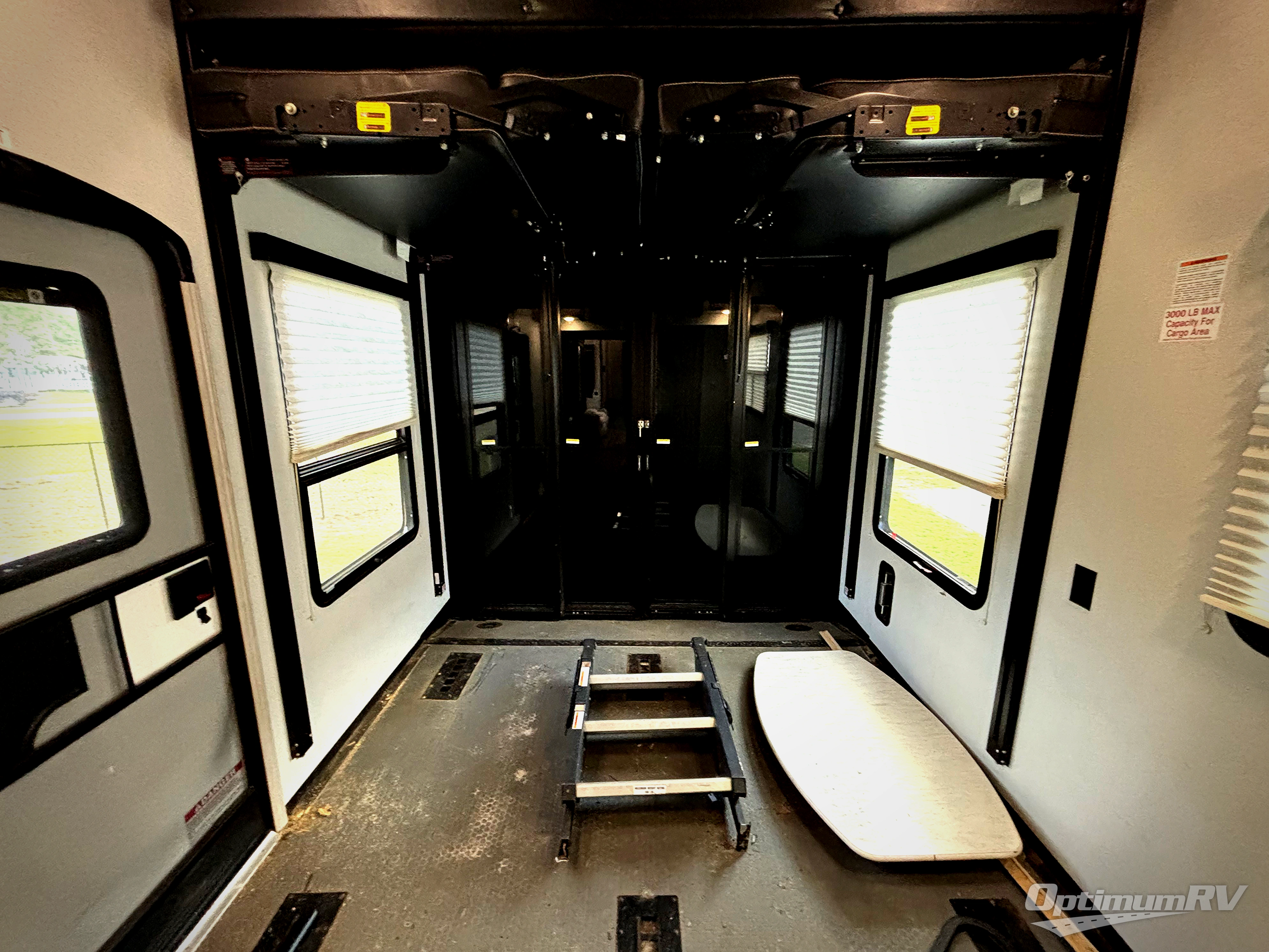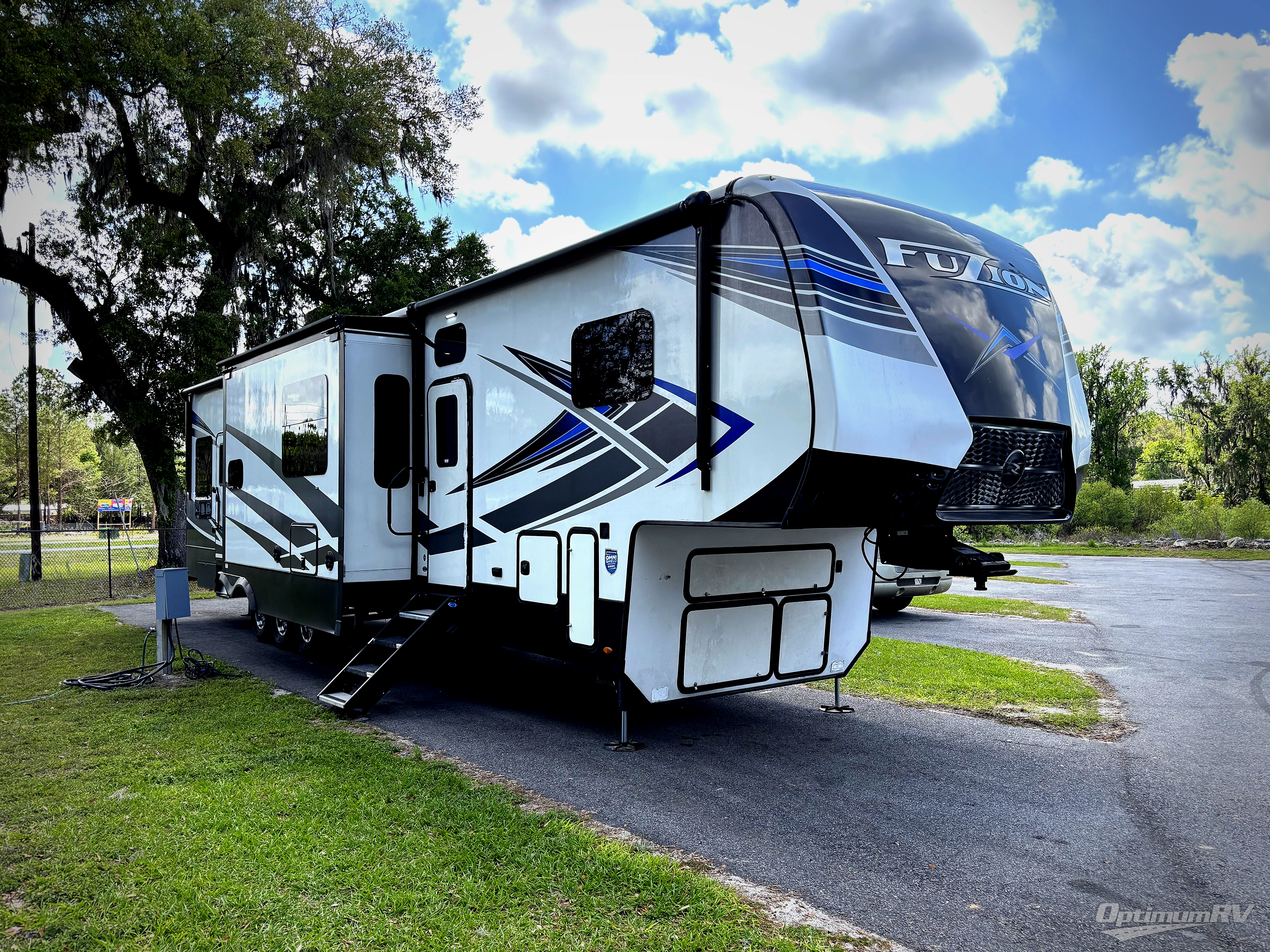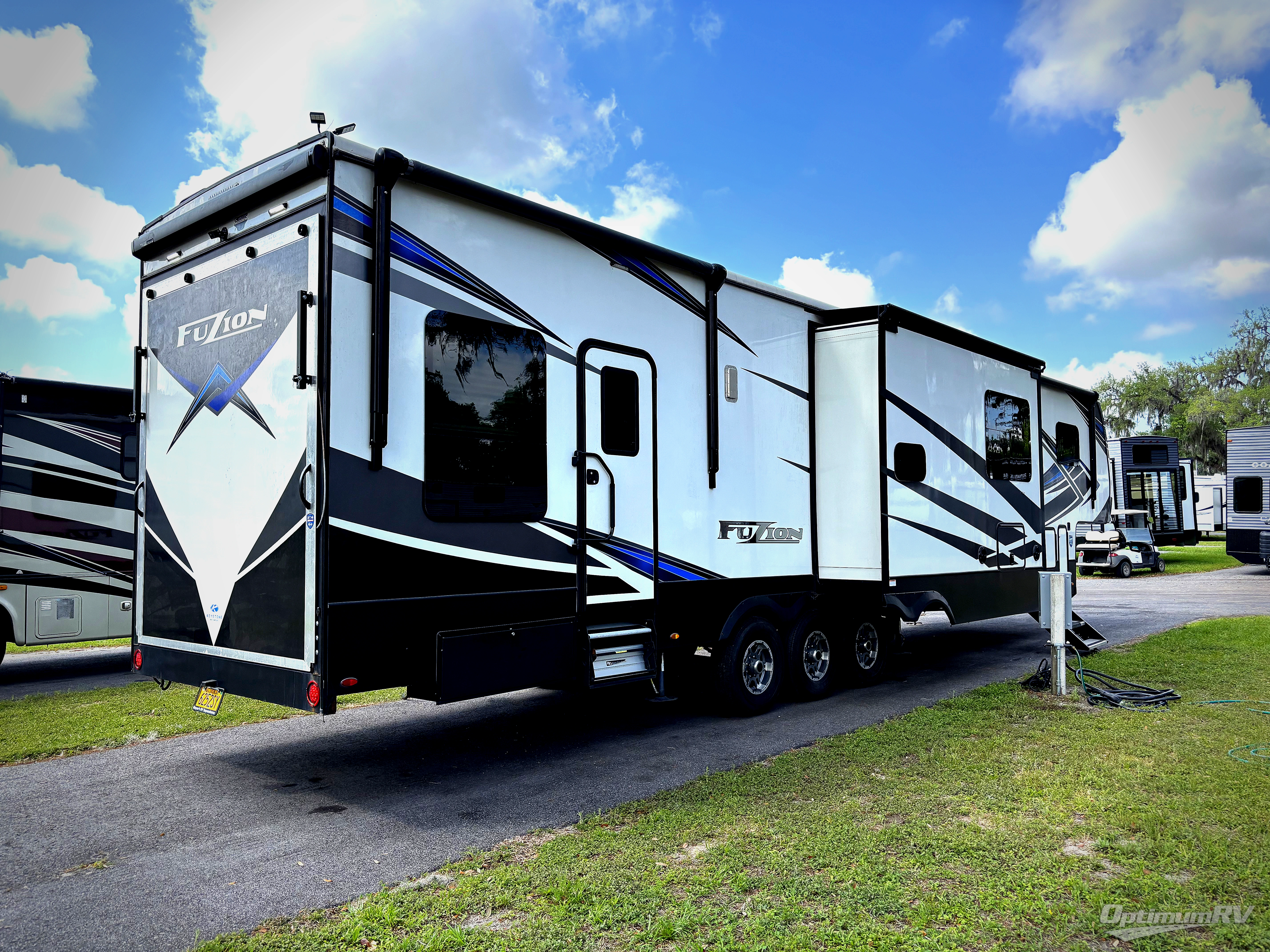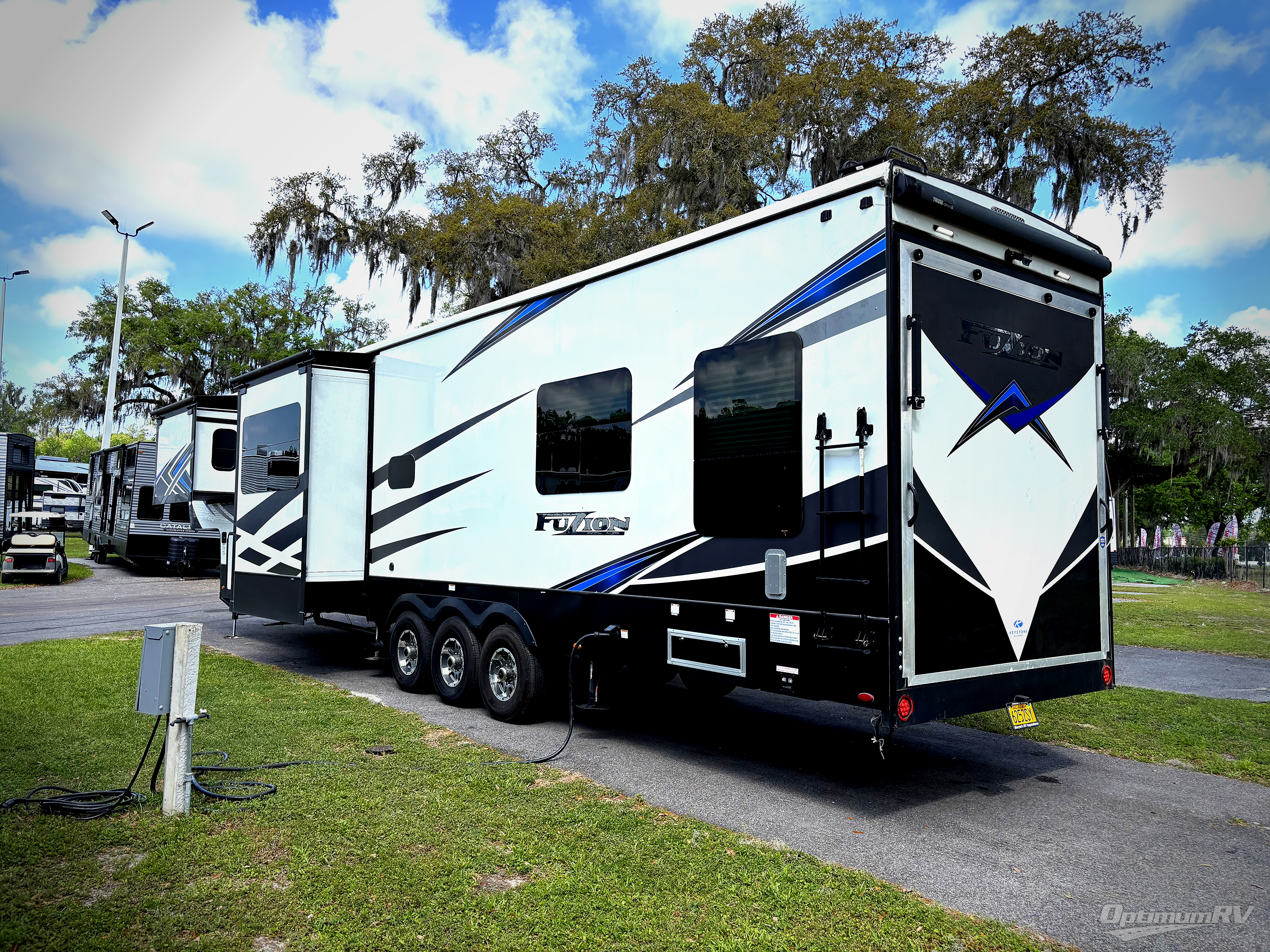 Seek new thrills and see new sights in a Fuzion toy hauler fifth wheel by Keystone. A few of the advantages you'll find with these models are Adjust-A-Track frame-welded tie-downs, Tru-fit slide construction, 12V color-coded wiring, plus much more. The Max Turn technology makes turning and parking easier than ever, and the MORryde CRE 3000 suspension will provide smooth towing to the campground. You will stay comfortable year around with the in-floor heating ducts and the Blade high performance air flow system that gives 20% more air flow. Each model includes many interior comforts, including residential-style furniture, extra tall ceilings with crown molding, and fiberglass backed linoleum floors. The garage features gas and oil resistant tuff-fly flooring, an 8' ramp door, a fuel station with dual 30 gallon tanks, and double electric beds with dual opposing sofas so you can invite more friends along!