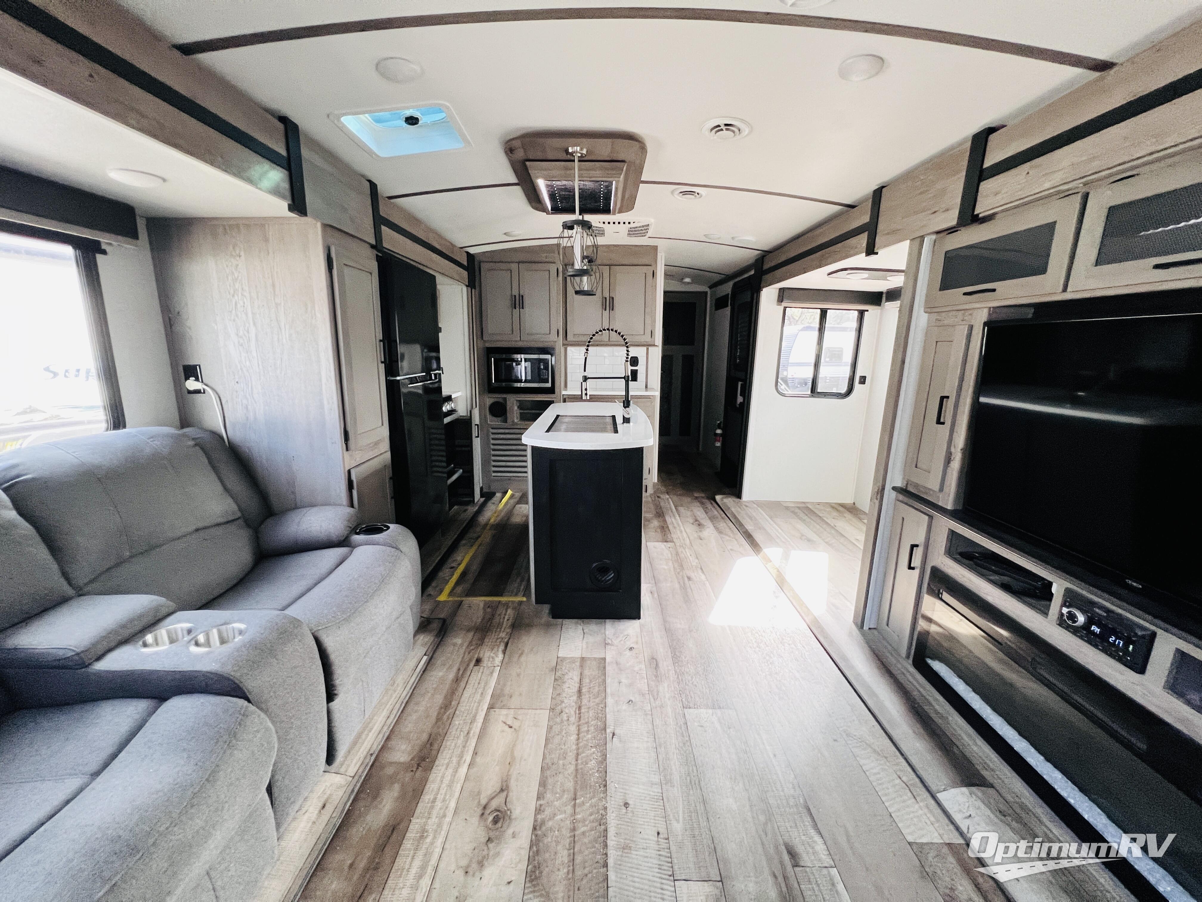 Take your camping expeditions to the next level with this Outback travel trailer! Your family's master chef will appreciate all of the appliances that have been included in both the indoor and outdoor kitchen, like the pantry, the three-burner range top, the kitchen island, and the double door refrigerator. The large skylight located above the island will brighten up the interior with the sun's rays during the day and will allow the glow from the moon to illuminate the space at night. For a comfortable place to spend your evenings, you will love your own king-size bed slide in the private master suite while your guests or kids sleep on the sofa sleeper and booth dinette and someone might even try to sleep on the theater seats. There are options to choose from such an 8 cu. ft. refrigerator in place of the 10 cu. ft. refrigerator and/or a table and chairs in place of the booth dinette.