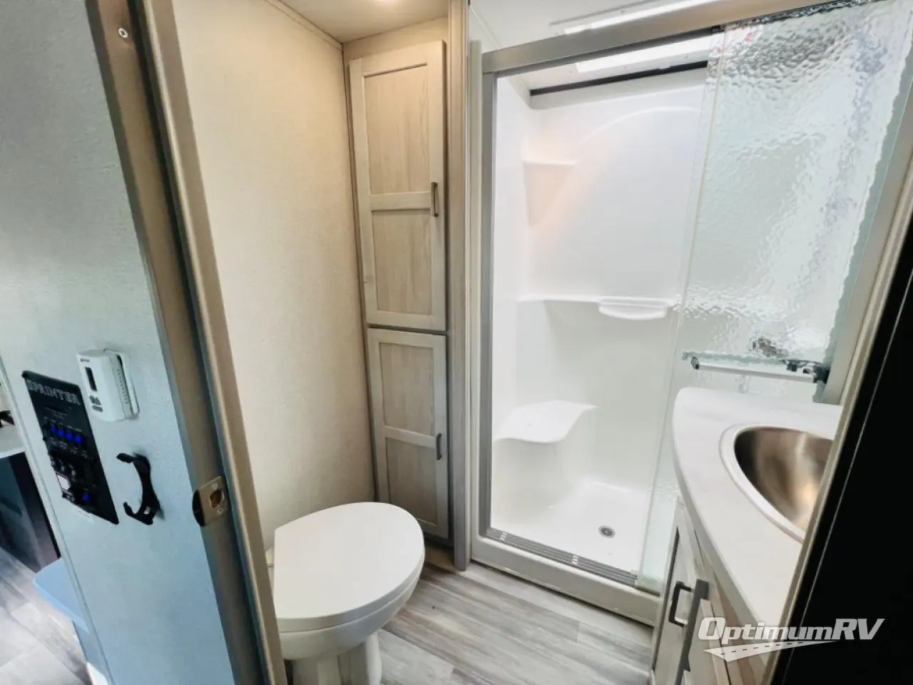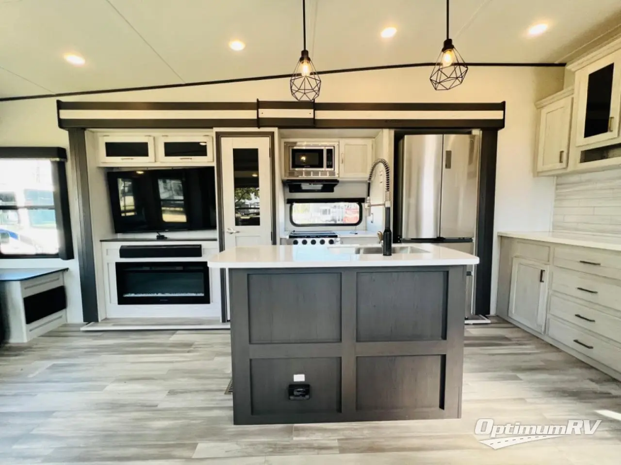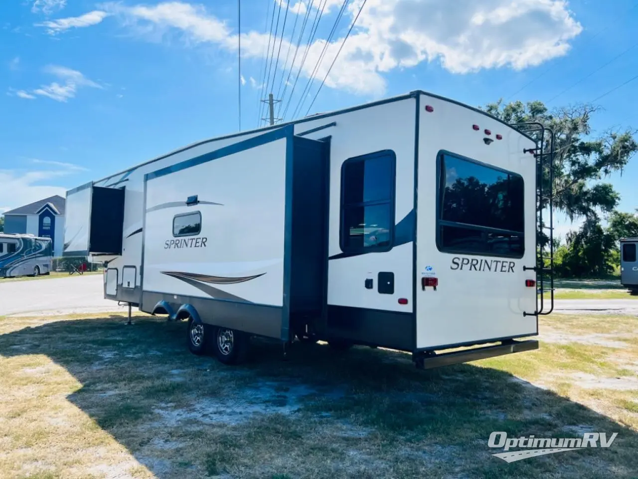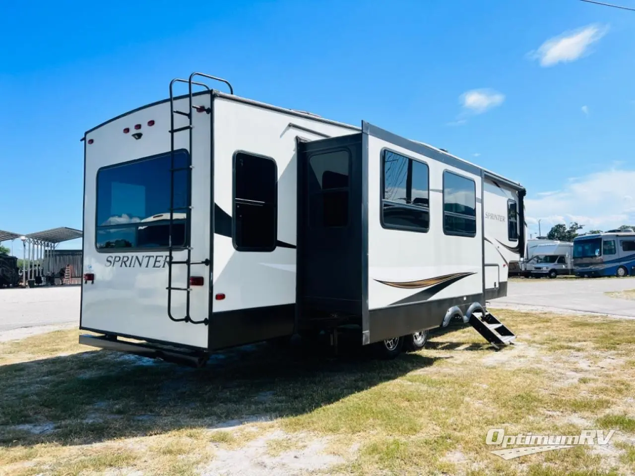 This Sprinter Limited fifth wheel is absolutely going to amaze you! The first thing that is going to grab your attention is the ample amount of space in the rear living area. This is made possible by a set of large opposing slides. Because of this extra space, there is room for things like a kitchen island, a queen-size tri-fold sofa, a large entertainment center with a fireplace and 50" LED HDTV, a free-standing dinette, and full reclining theater seating. The next thing you're going to want to check out is the front private bedroom because it comes with a king bed slide, a dresser, a full-width wardrobe, and a space prepped for an optional washer/dryer, and since the bedroom is located right next to the full bathroom, it will be easy to sneak into the residential shower in the morning.