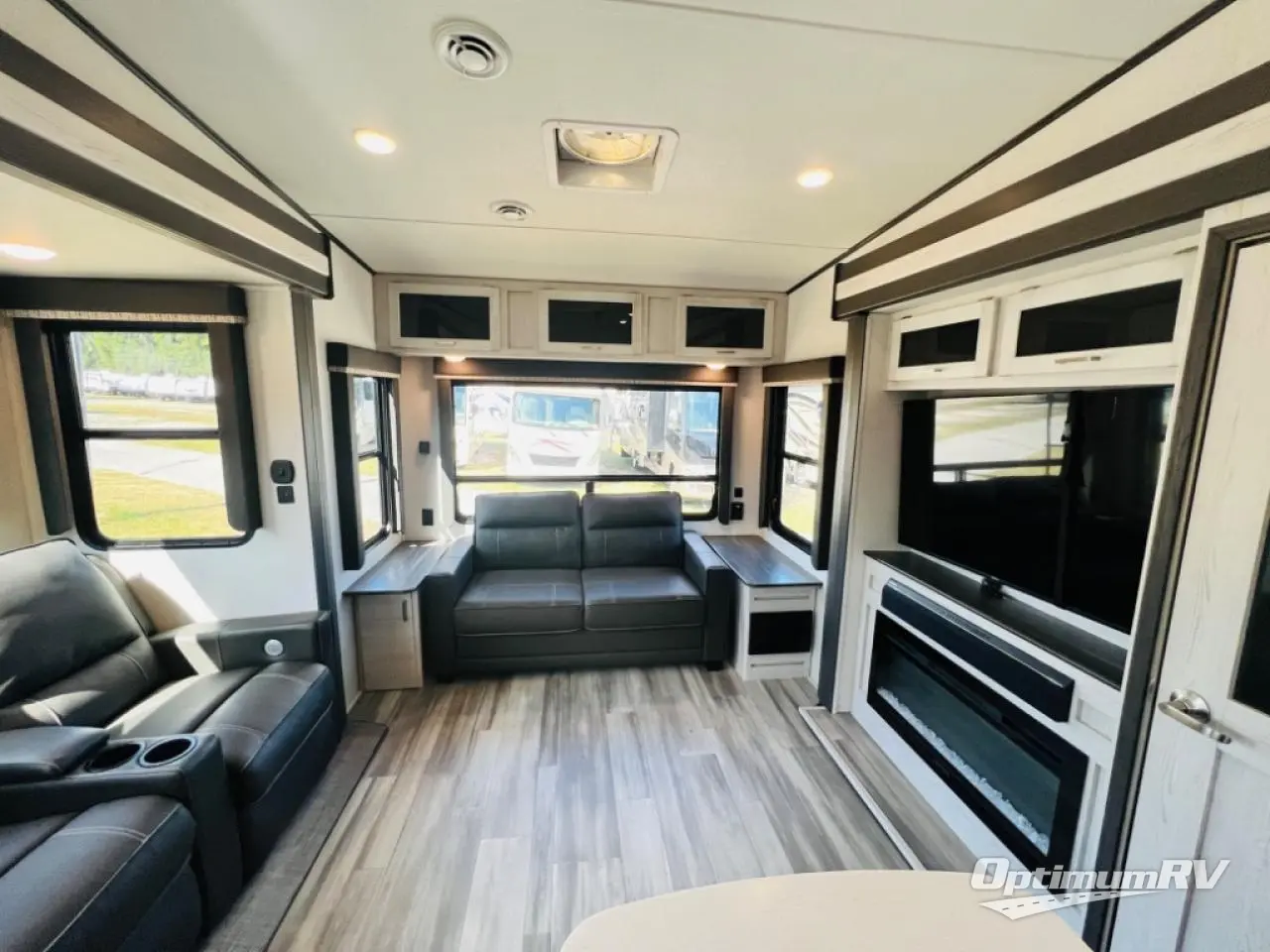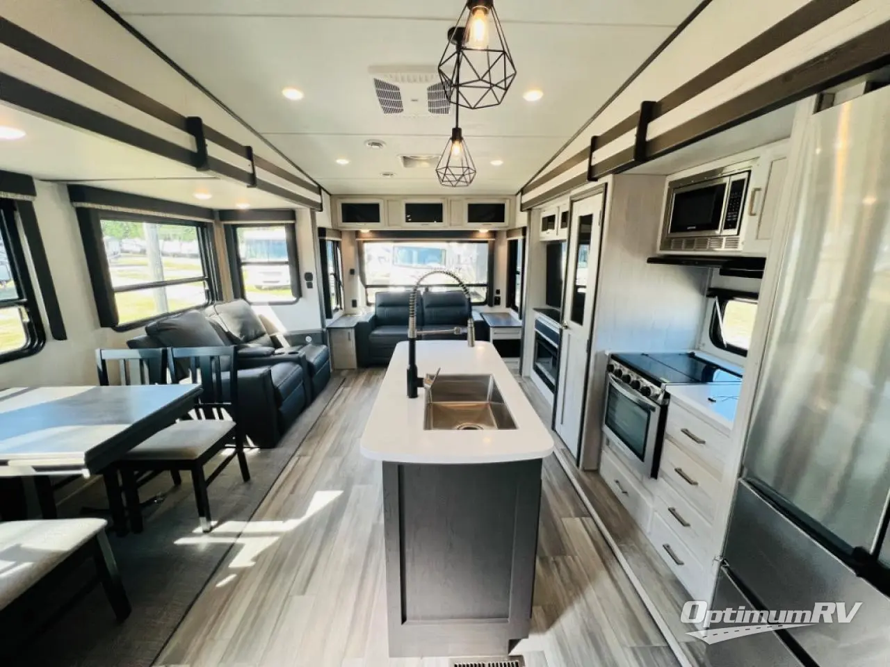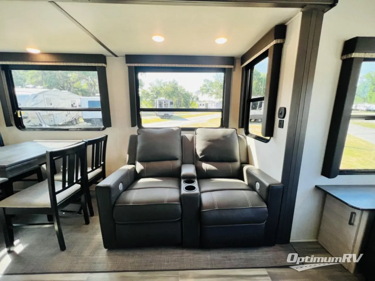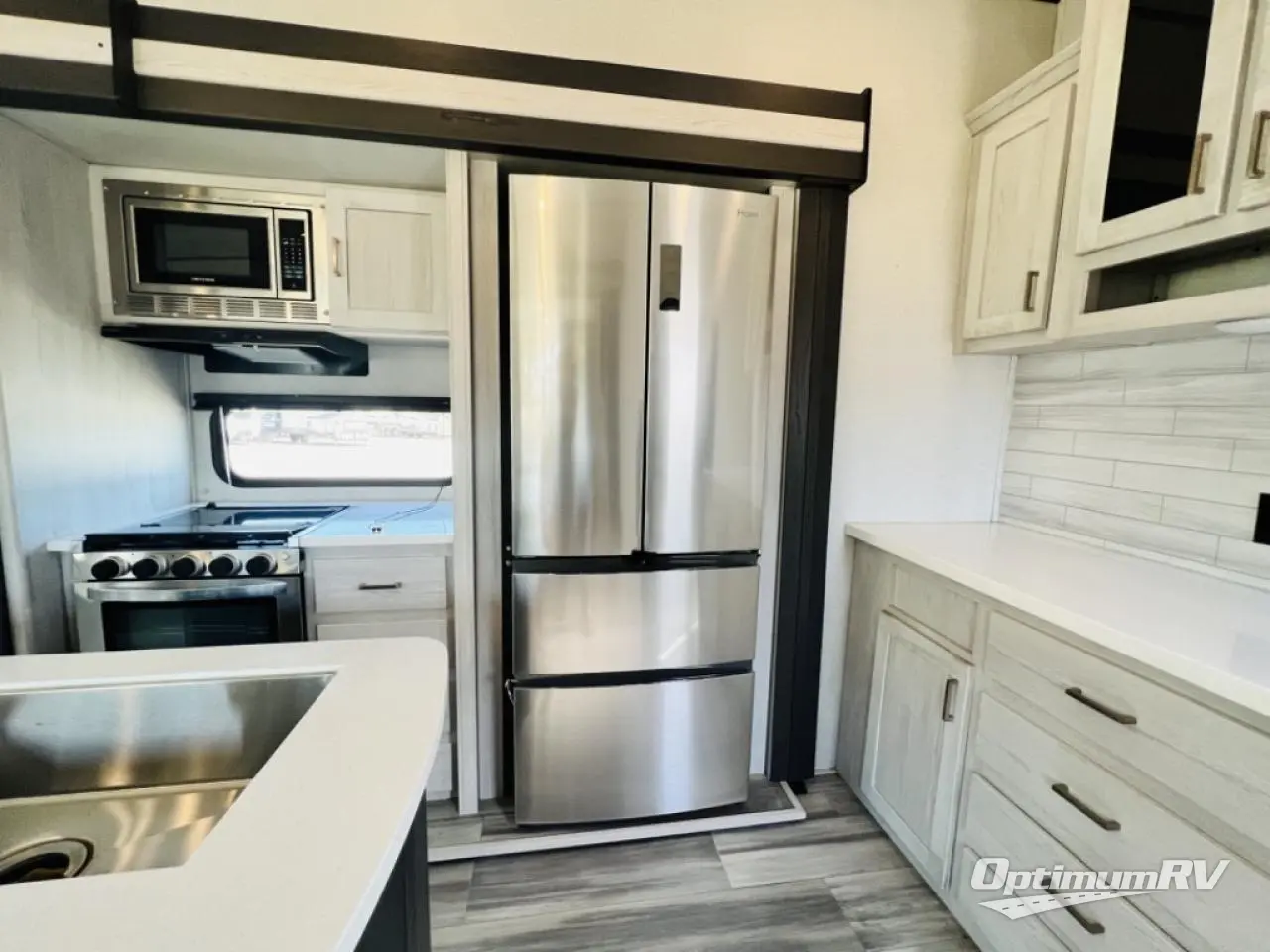 This Sprinter Limited fifth wheel is absolutely going to amaze you! The first thing that is going to grab your attention is the ample amount of space in the rear living area. This is made possible by a set of large opposing slides. Because of this extra space, there is room for things like a kitchen island, a queen-size tri-fold sofa, a large entertainment center with a fireplace and 50" LED HDTV, a free-standing dinette, and full reclining theater seating. The next thing you're going to want to check out is the front private bedroom because it comes with a king bed slide, a dresser, a full-width wardrobe, and a space prepped for an optional washer/dryer, and since the bedroom is located right next to the full bathroom, it will be easy to sneak into the residential shower in the morning.