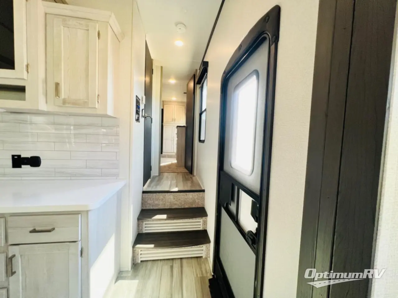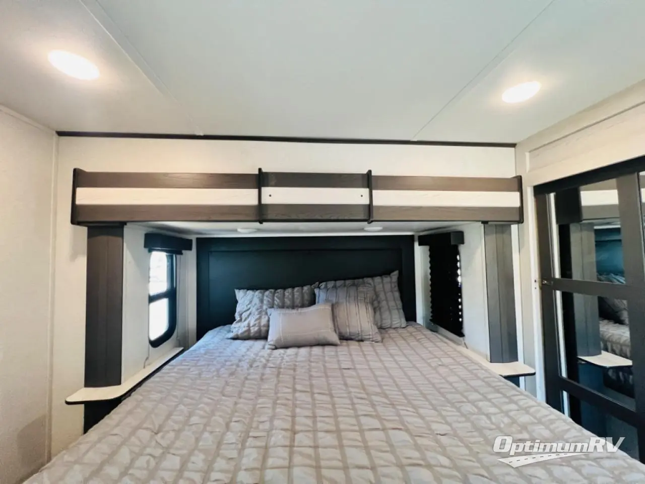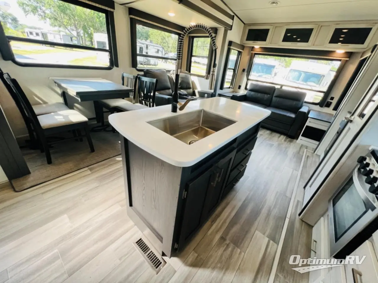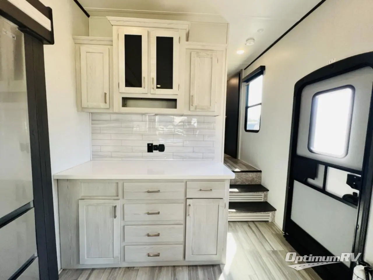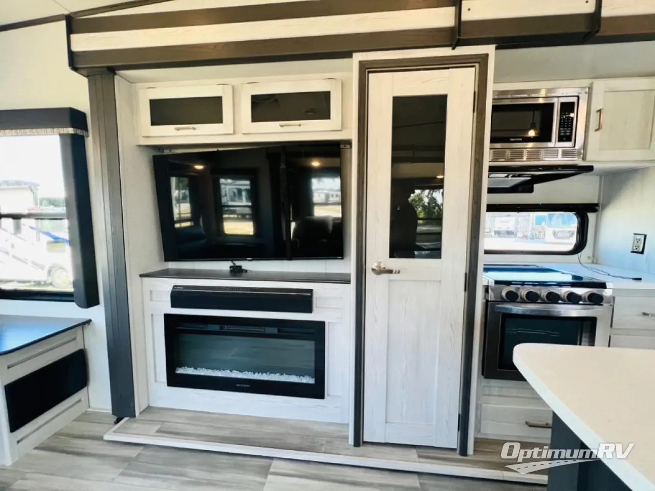 This Sprinter Limited fifth wheel is absolutely going to amaze you! The first thing that is going to grab your attention is the ample amount of space in the rear living area. This is made possible by a set of large opposing slides. Because of this extra space, there is room for things like a kitchen island, a queen-size tri-fold sofa, a large entertainment center with a fireplace and 50" LED HDTV, a free-standing dinette, and full reclining theater seating. The next thing you're going to want to check out is the front private bedroom because it comes with a king bed slide, a dresser, a full-width wardrobe, and a space prepped for an optional washer/dryer, and since the bedroom is located right next to the full bathroom, it will be easy to sneak into the residential shower in the morning.
