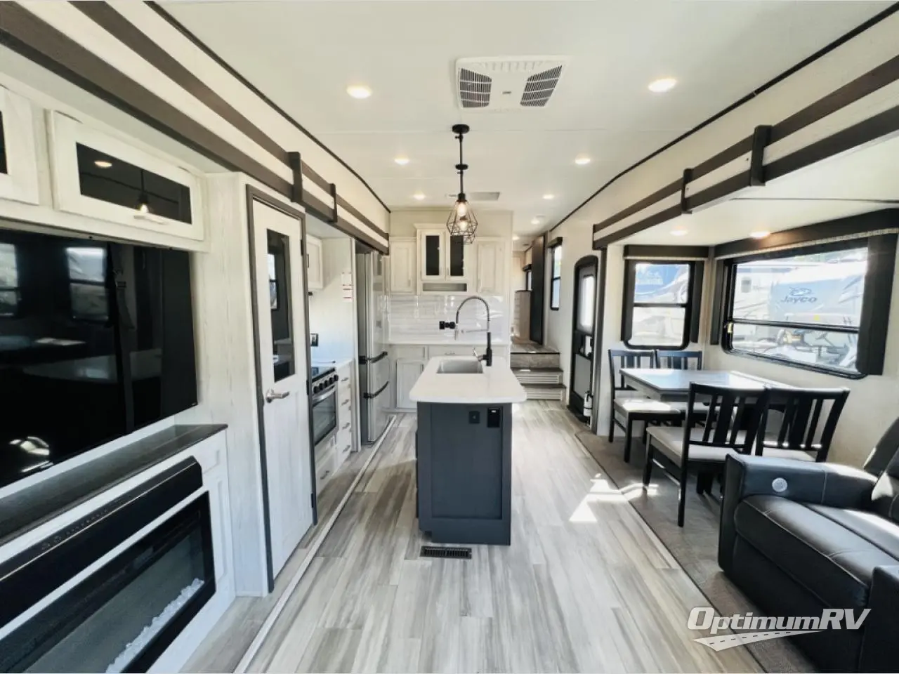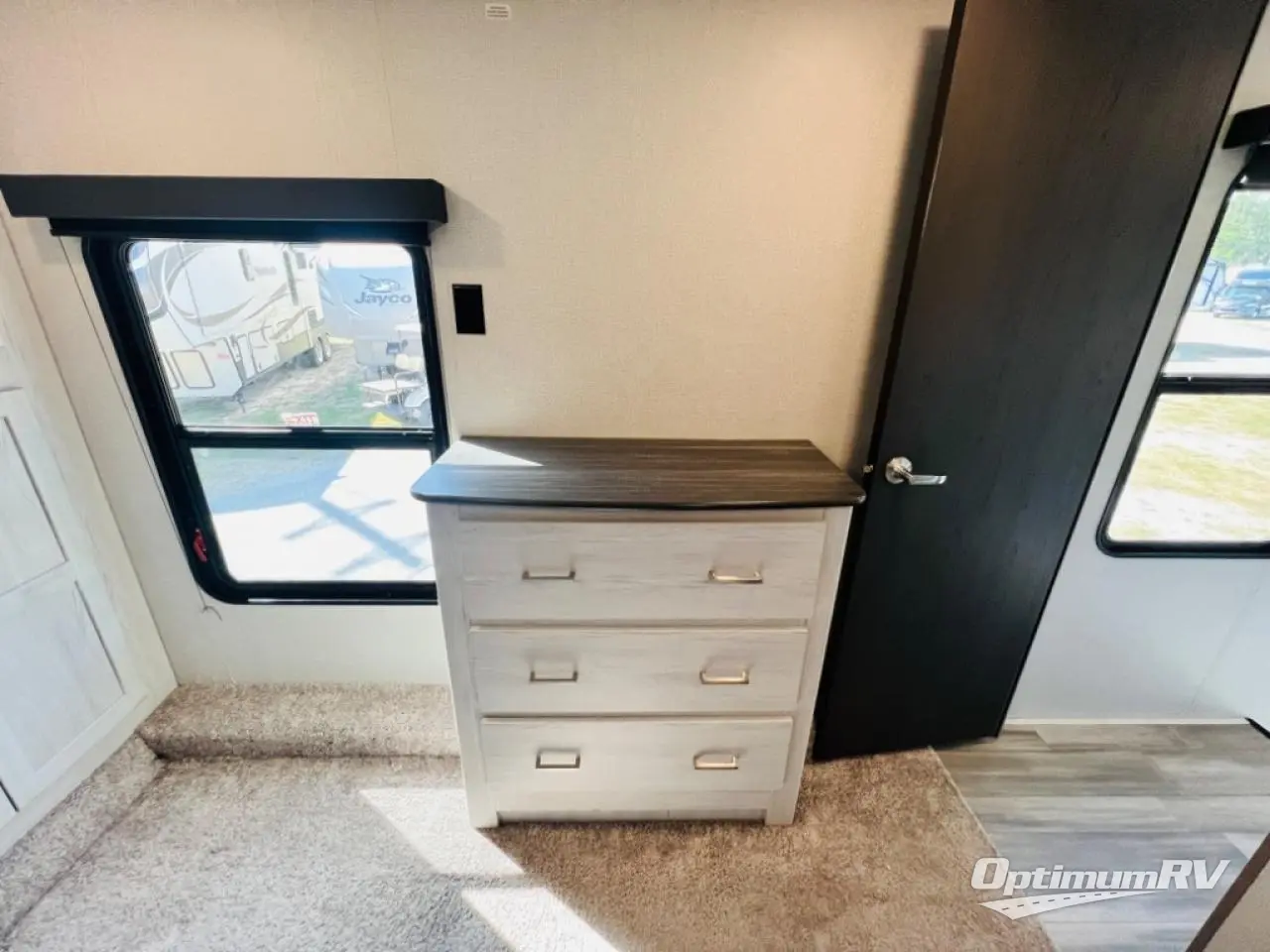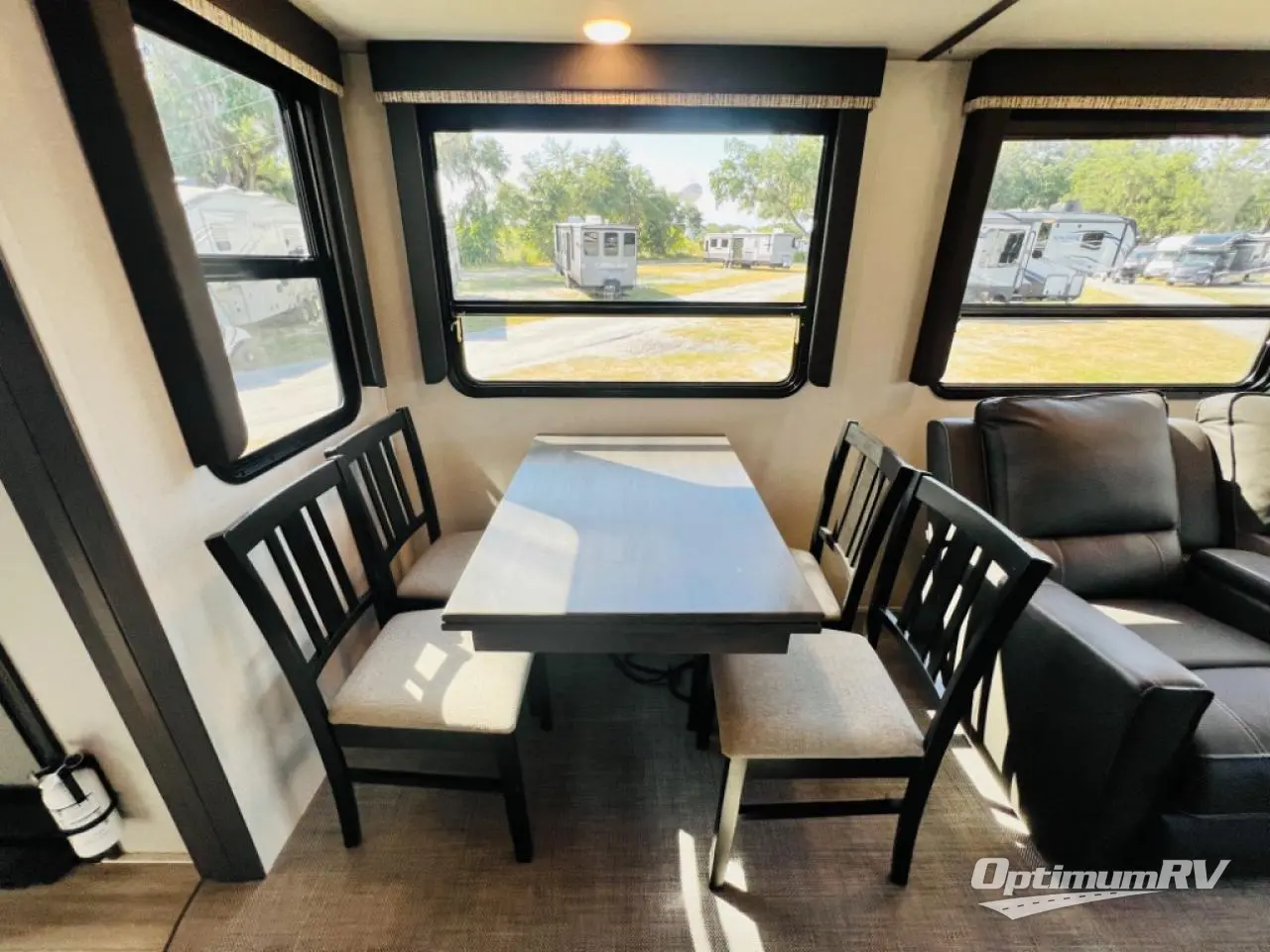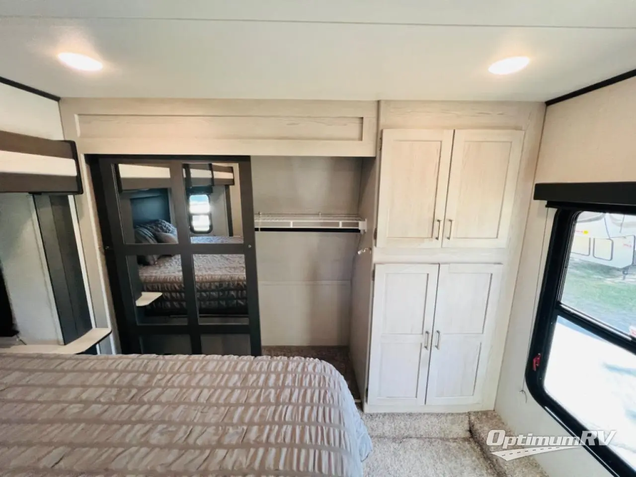 This Sprinter Limited fifth wheel is absolutely going to amaze you! The first thing that is going to grab your attention is the ample amount of space in the rear living area. This is made possible by a set of large opposing slides. Because of this extra space, there is room for things like a kitchen island, a queen-size tri-fold sofa, a large entertainment center with a fireplace and 50" LED HDTV, a free-standing dinette, and full reclining theater seating. The next thing you're going to want to check out is the front private bedroom because it comes with a king bed slide, a dresser, a full-width wardrobe, and a space prepped for an optional washer/dryer, and since the bedroom is located right next to the full bathroom, it will be easy to sneak into the residential shower in the morning.