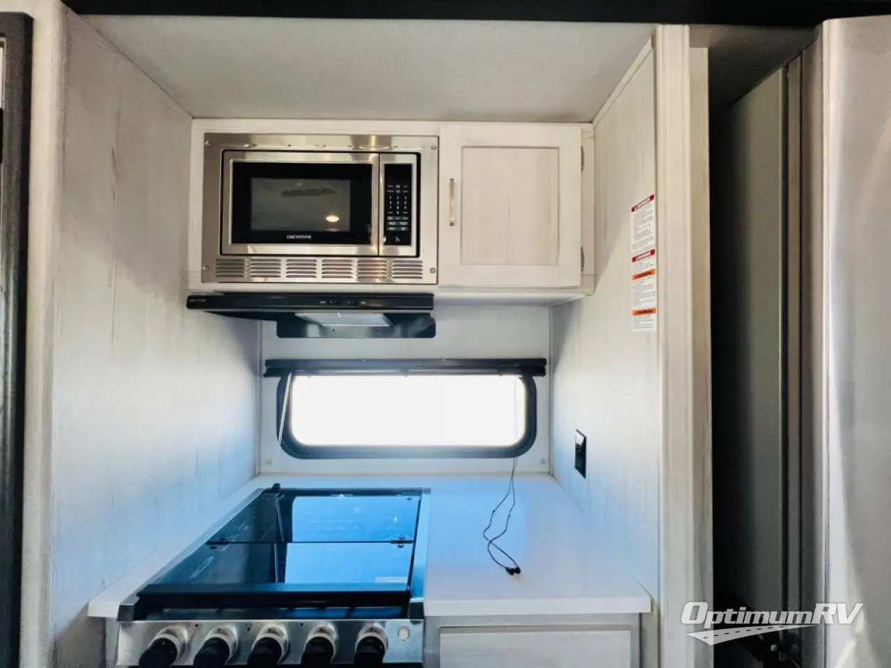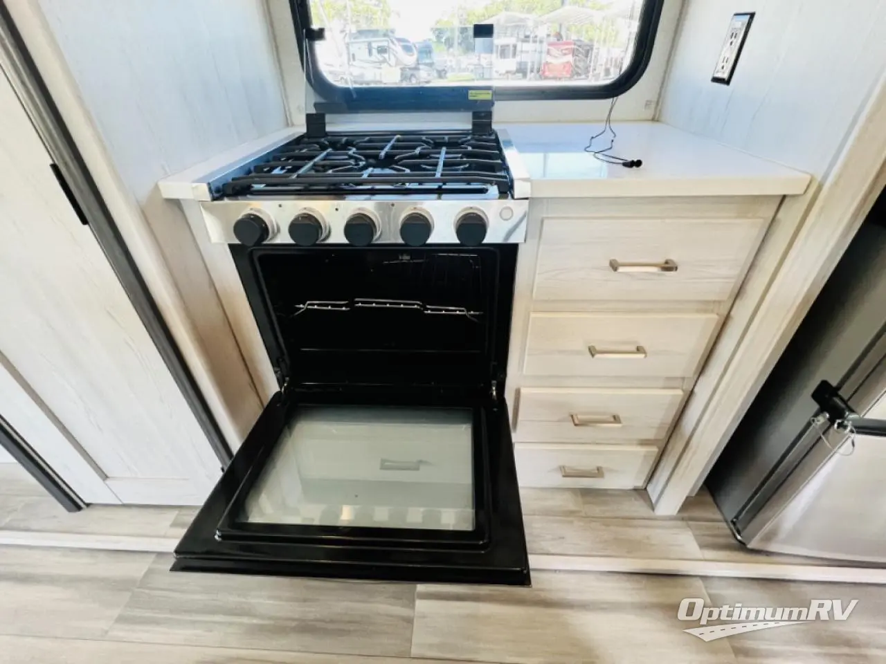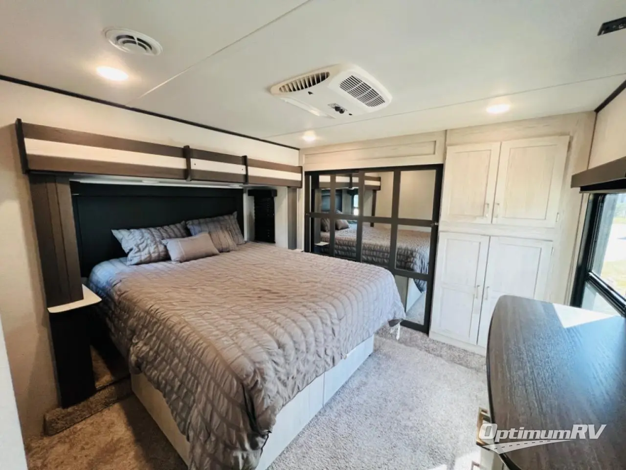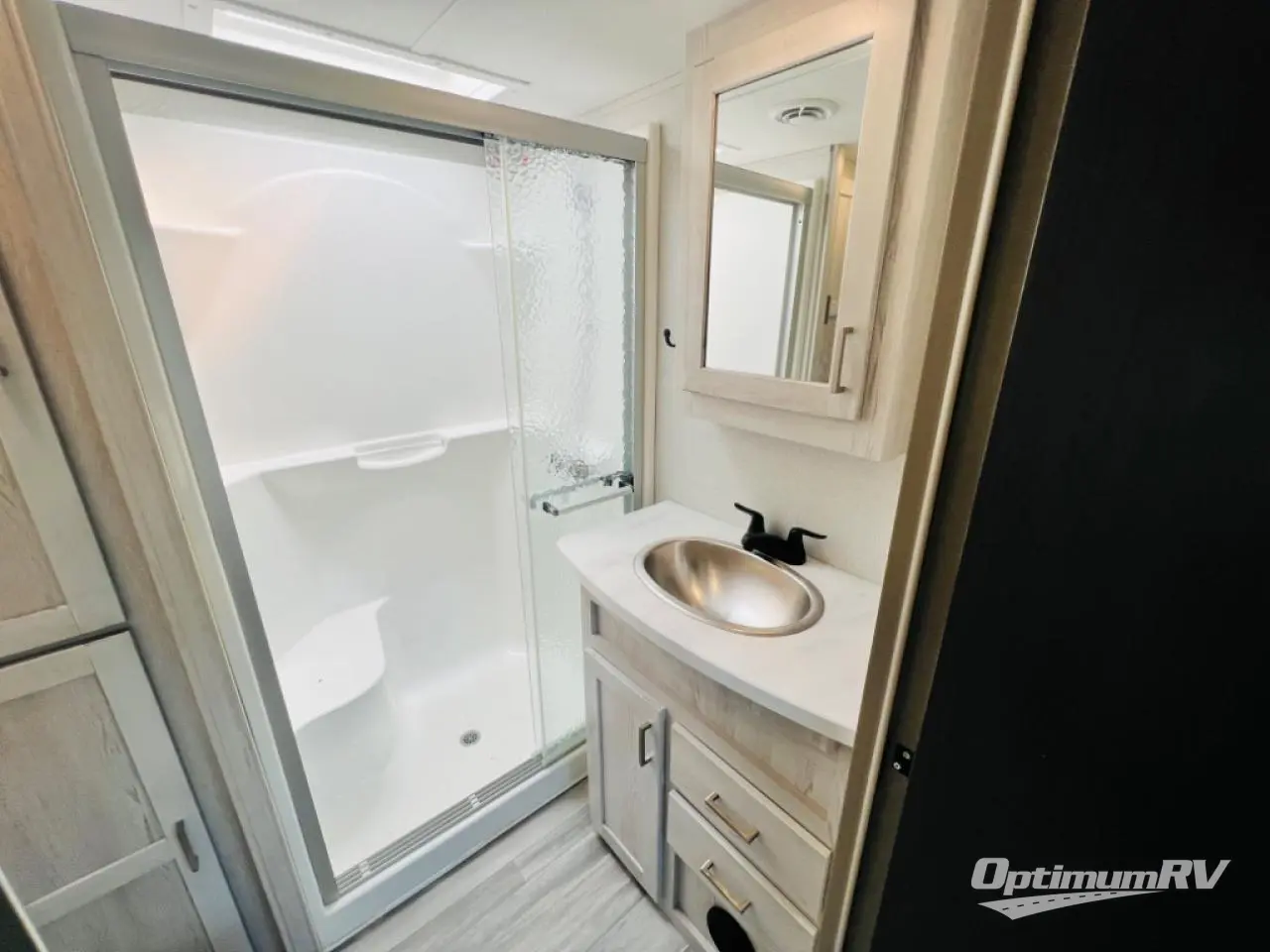 This Sprinter Limited fifth wheel is absolutely going to amaze you! The first thing that is going to grab your attention is the ample amount of space in the rear living area. This is made possible by a set of large opposing slides. Because of this extra space, there is room for things like a kitchen island, a queen-size tri-fold sofa, a large entertainment center with a fireplace and 50" LED HDTV, a free-standing dinette, and full reclining theater seating. The next thing you're going to want to check out is the front private bedroom because it comes with a king bed slide, a dresser, a full-width wardrobe, and a space prepped for an optional washer/dryer, and since the bedroom is located right next to the full bathroom, it will be easy to sneak into the residential shower in the morning.