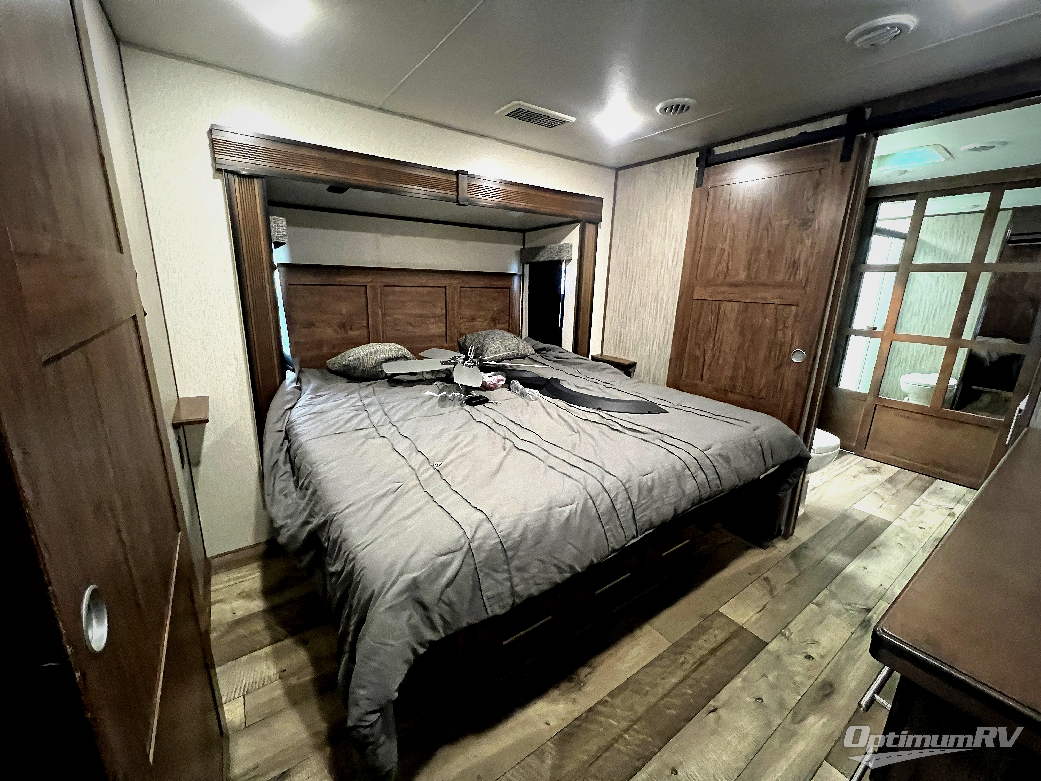 This couples fifth wheel gives you two sinks in the front spacious bathroom that also includes a wardrobe, linen storage, a washer/dryer prepped space, plus a residential shower with a seat. Sleep like a king on the electric-tilt bed that makes watching a show on the 32" LED TV comfortable and provides storage underneath with three drawers. You can relax during the day on the theater seating while watching a show on the 50" LED TV, and the fireplace at night will create a cozy atmosphere. Let the chef prepare dinner on the four-burner range or in the convection microwave and the kitchen island will provide extra counter space. And there is even a stainless steel dishwasher to make clean-up a breeze. This model features a hide-a-bed sofa your guest or the grandkids can sleep on at night and the half bath will be all theirs.