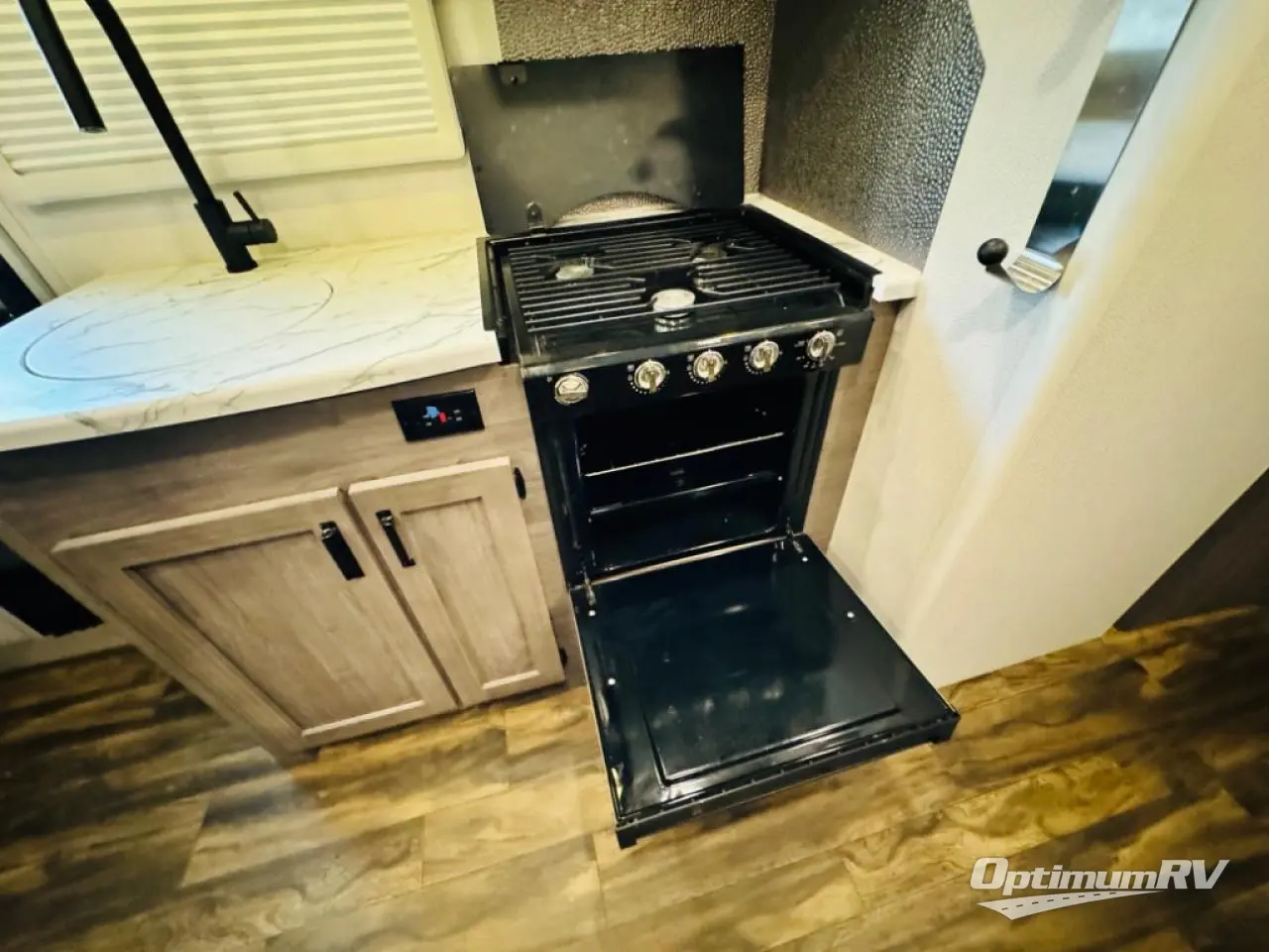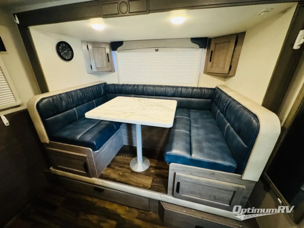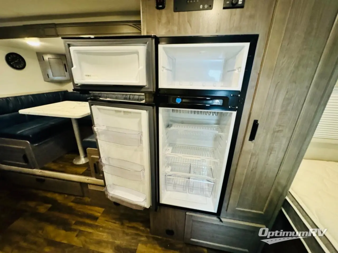 You will love the added interior space you have in this travel trailer thanks to the slide out U-shaped dinette. The dinette can be converted to a 46" x 78" bed for two overnight guests, while you and your spouse sleep on the front queen bed. Prepare all your meals on the three burner range, and you can choose to add the optional stainless steel "flat bed" microwave oven for meals on-the-go. This model includes a convenient dry bath with a skylight, a medicine cabinet with a mirror, plus a tub to make bath time for the little ones easier than ever. If you enjoy spending more time outdoors, you may want to choose the optional 12' awning with LED lights and the optional pull-out storage tray for your hiking gear!