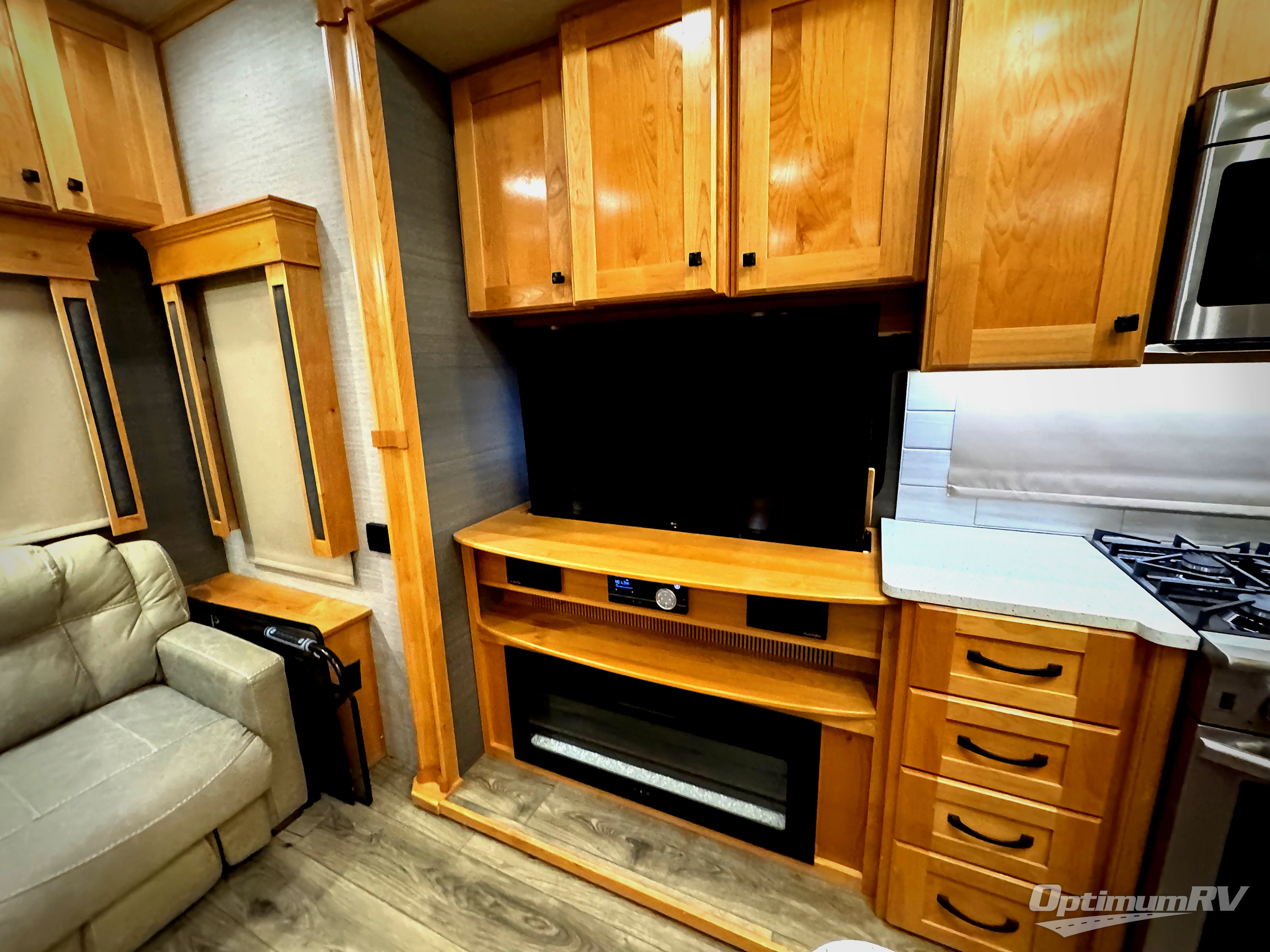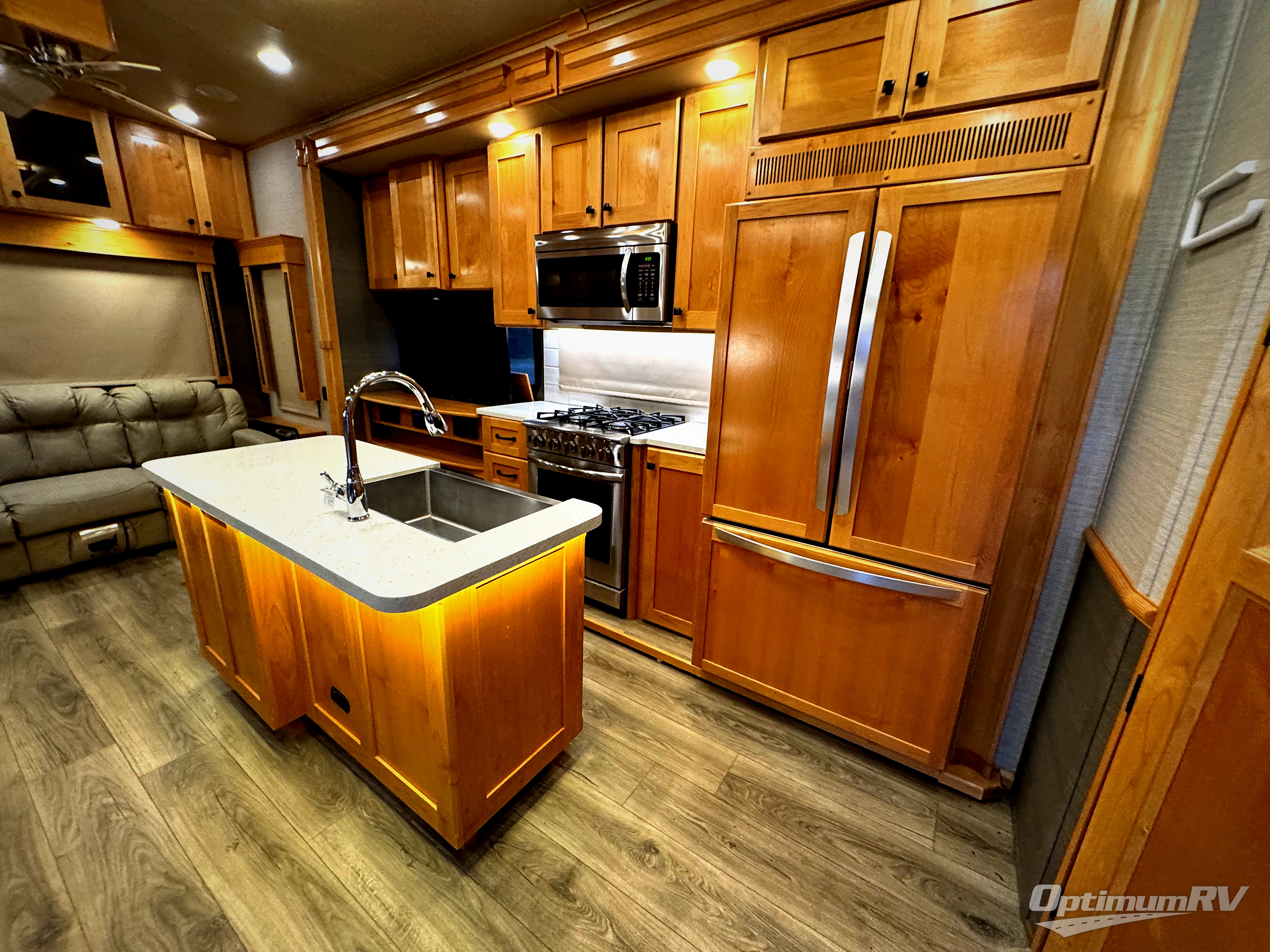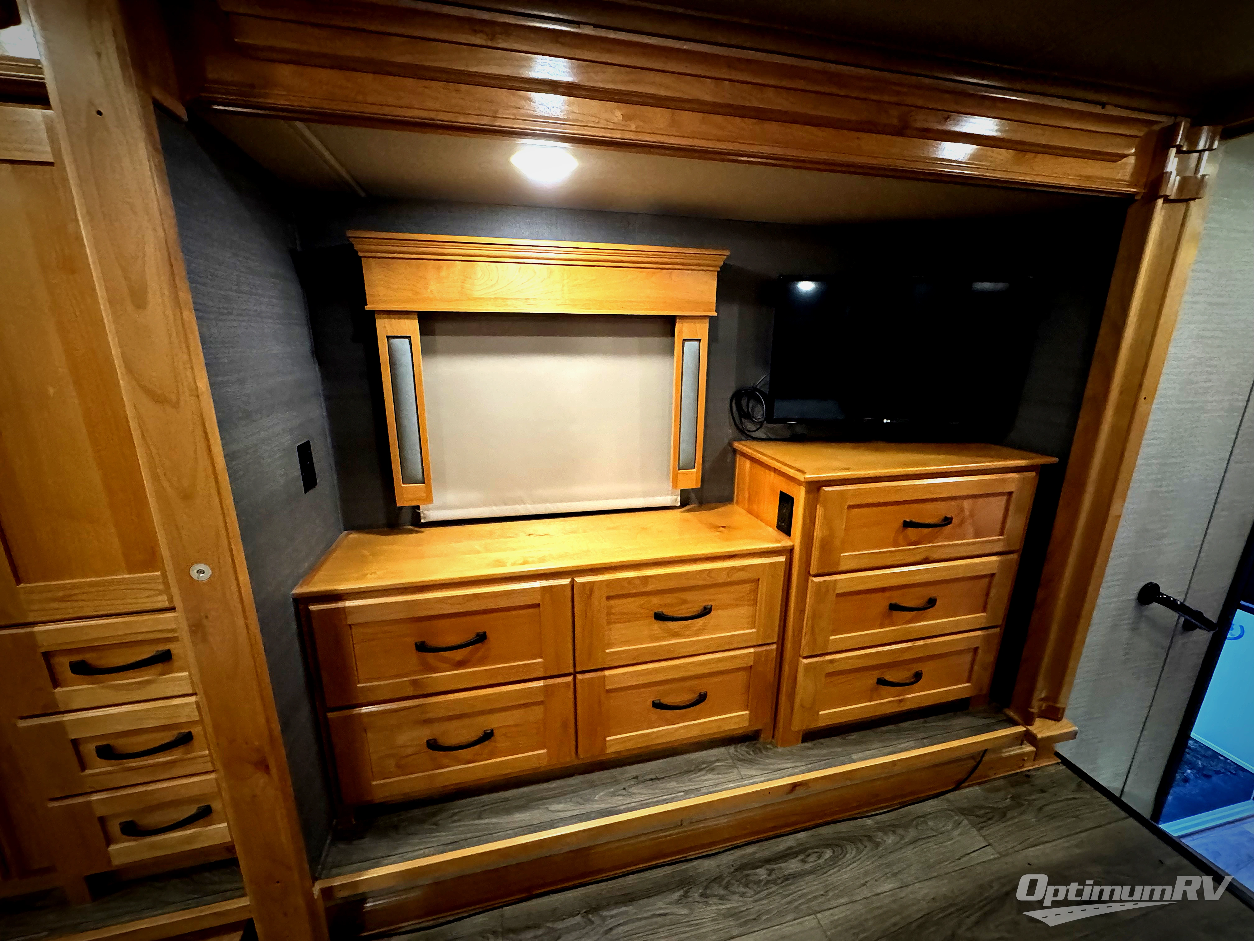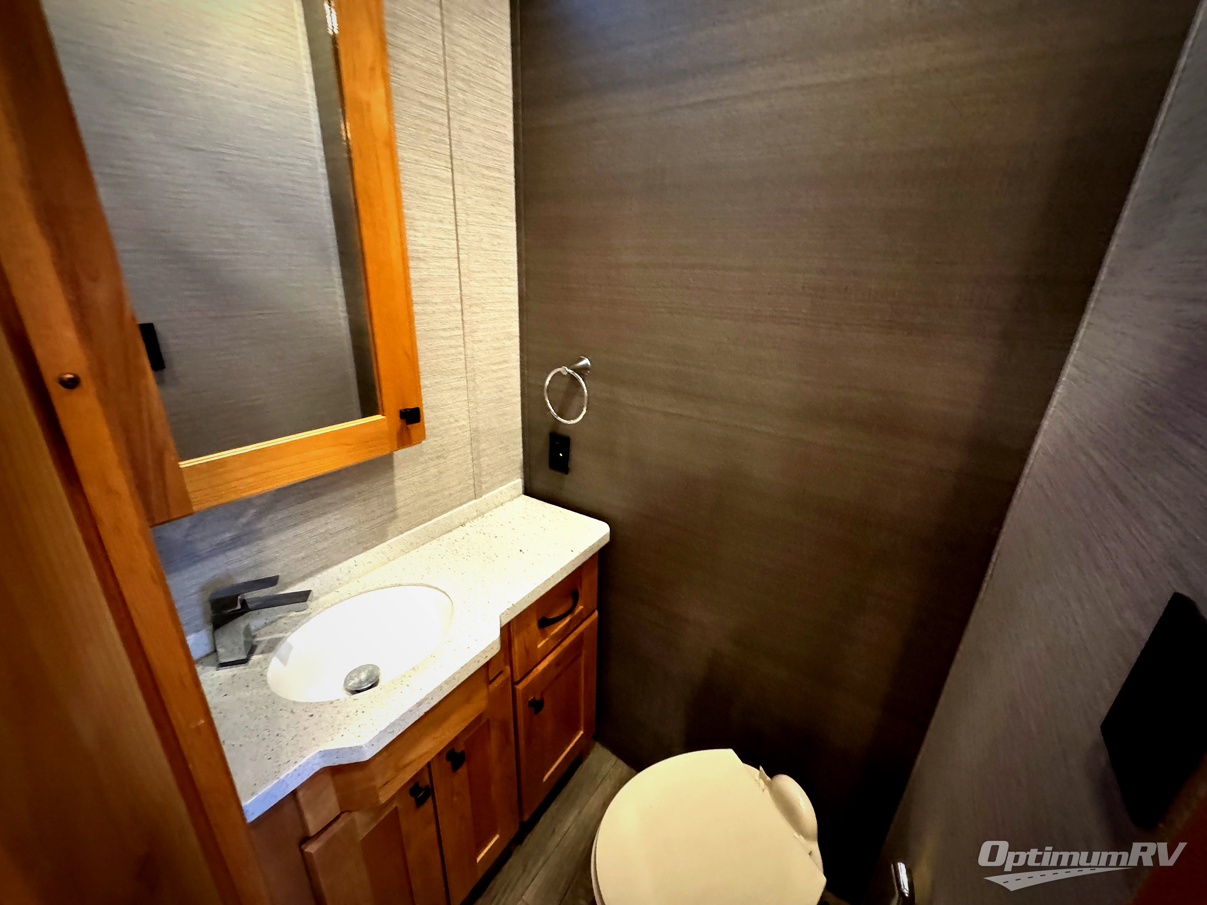 You will love the extra space throughout this fifth wheel thanks to the four slides, and the kitchen island will make it feel more like home. Relax on the theater sofa and watch a movie on the 50" monitor TV, or just enjoy the glow of the fireplace. The kids can play a game at the dinette with chairs, and the sofa bed will provide comfortable sleeping space at night. You and your spouse will have your own slide out king bed in the master suite, and the sliding doors here will add much-wanted space. Nothing says convenience like a half bath, plus a full bath, and this model delivers. The full bath includes dual bath sinks, a spacious 41" x 30" shower, plus a large front closet for all your clothes!