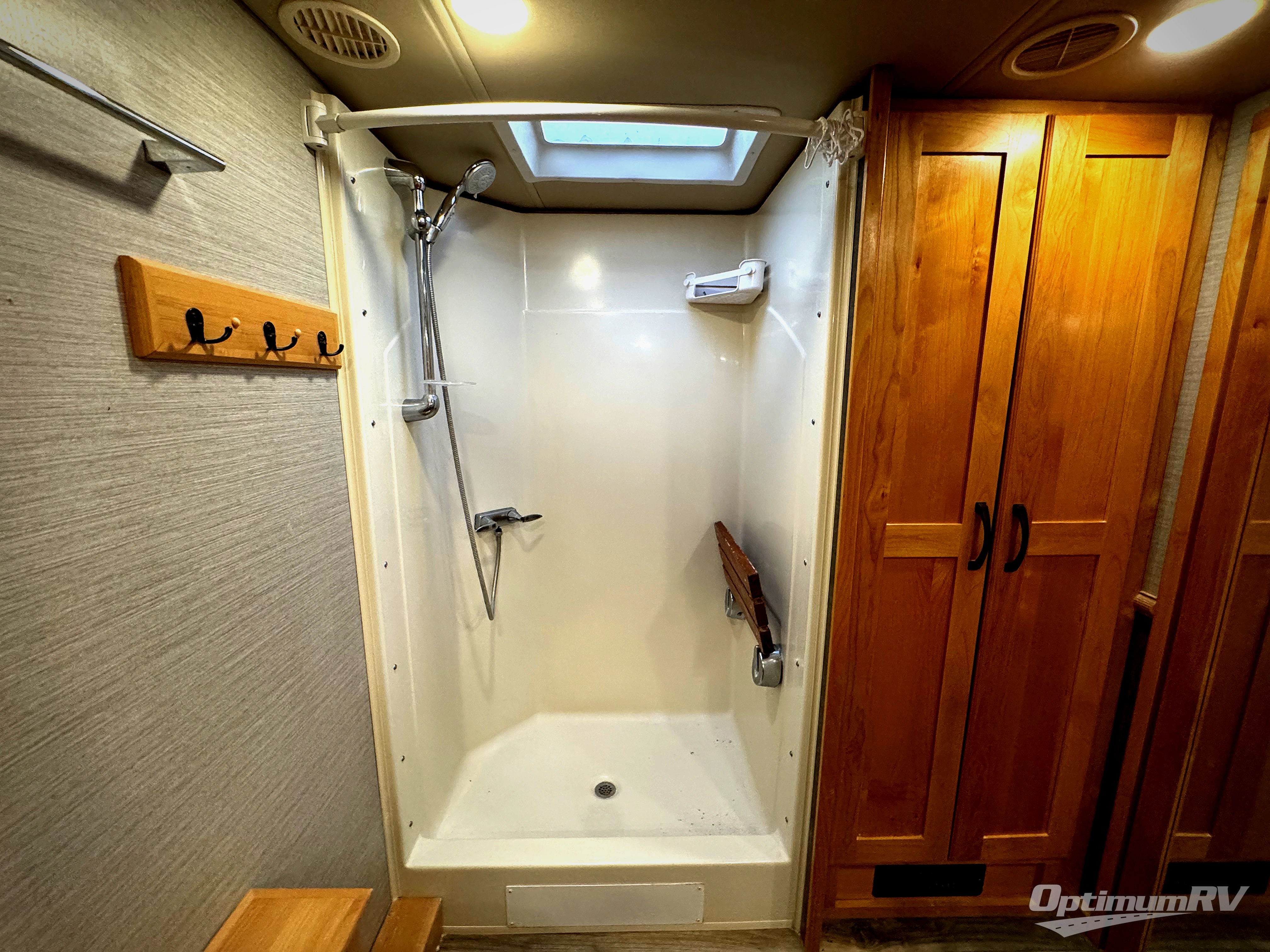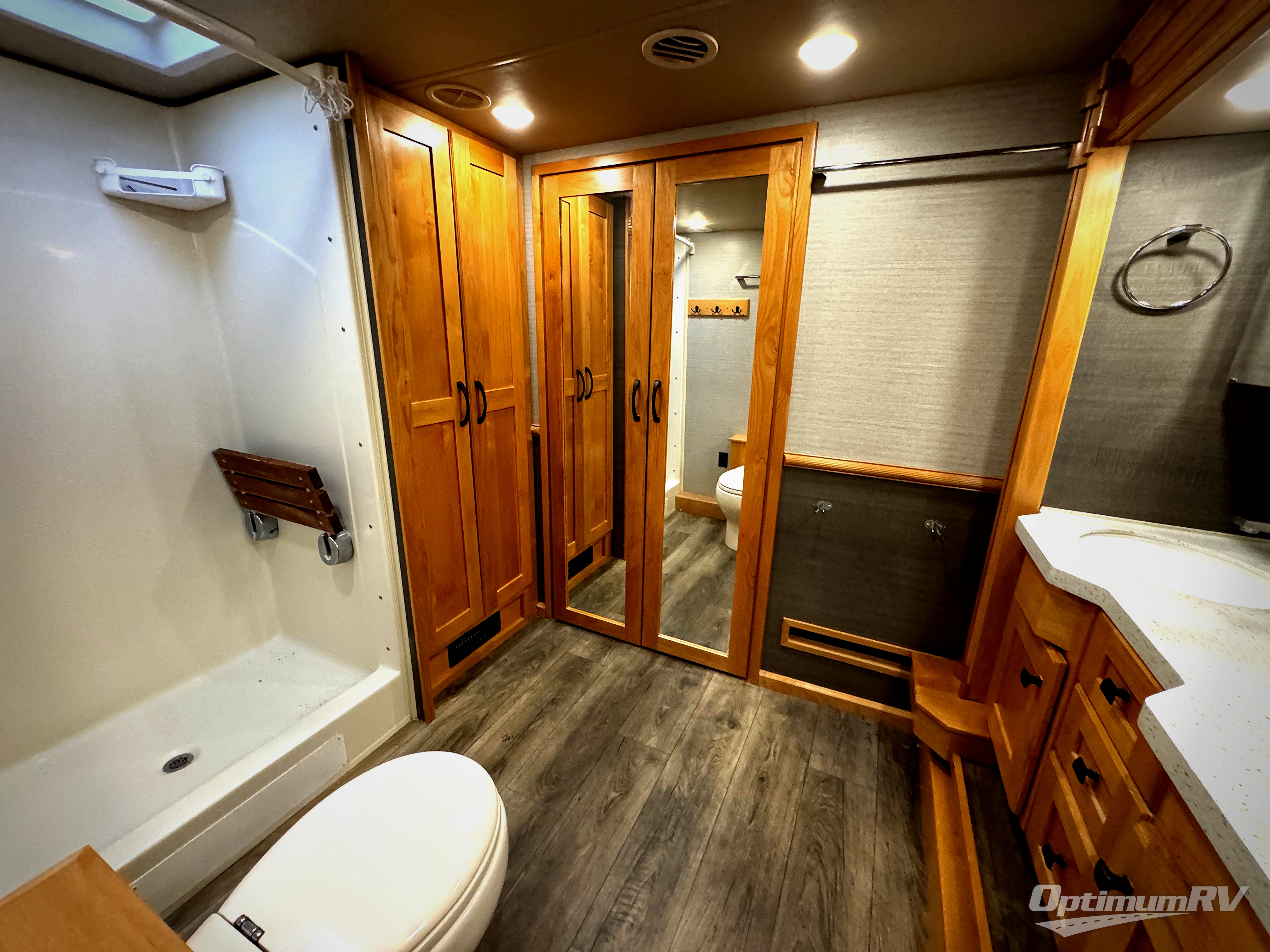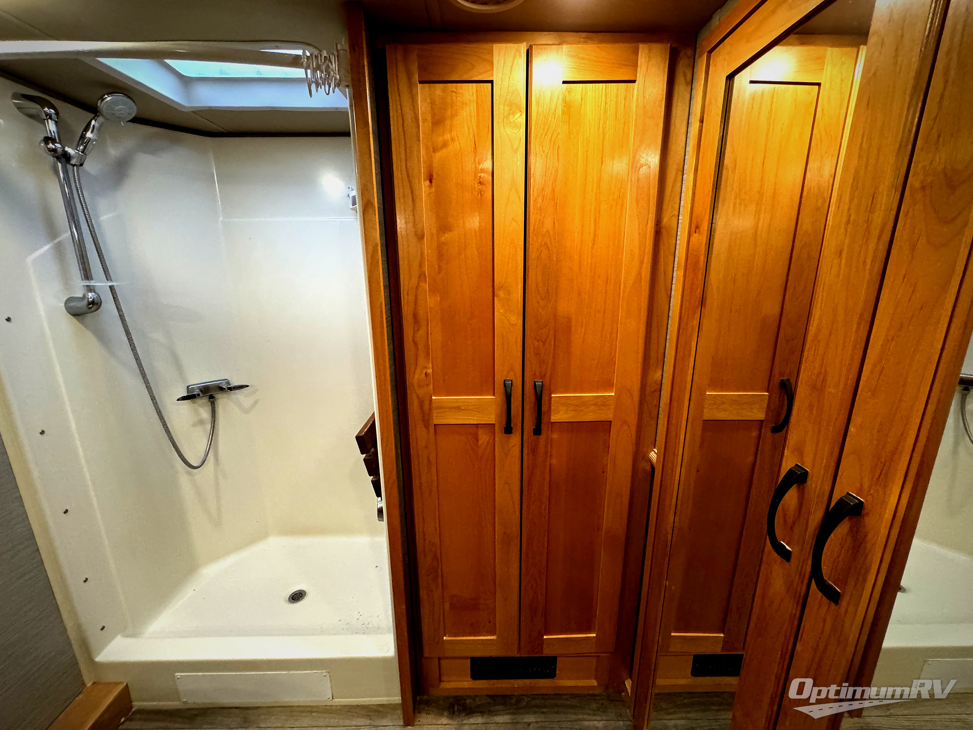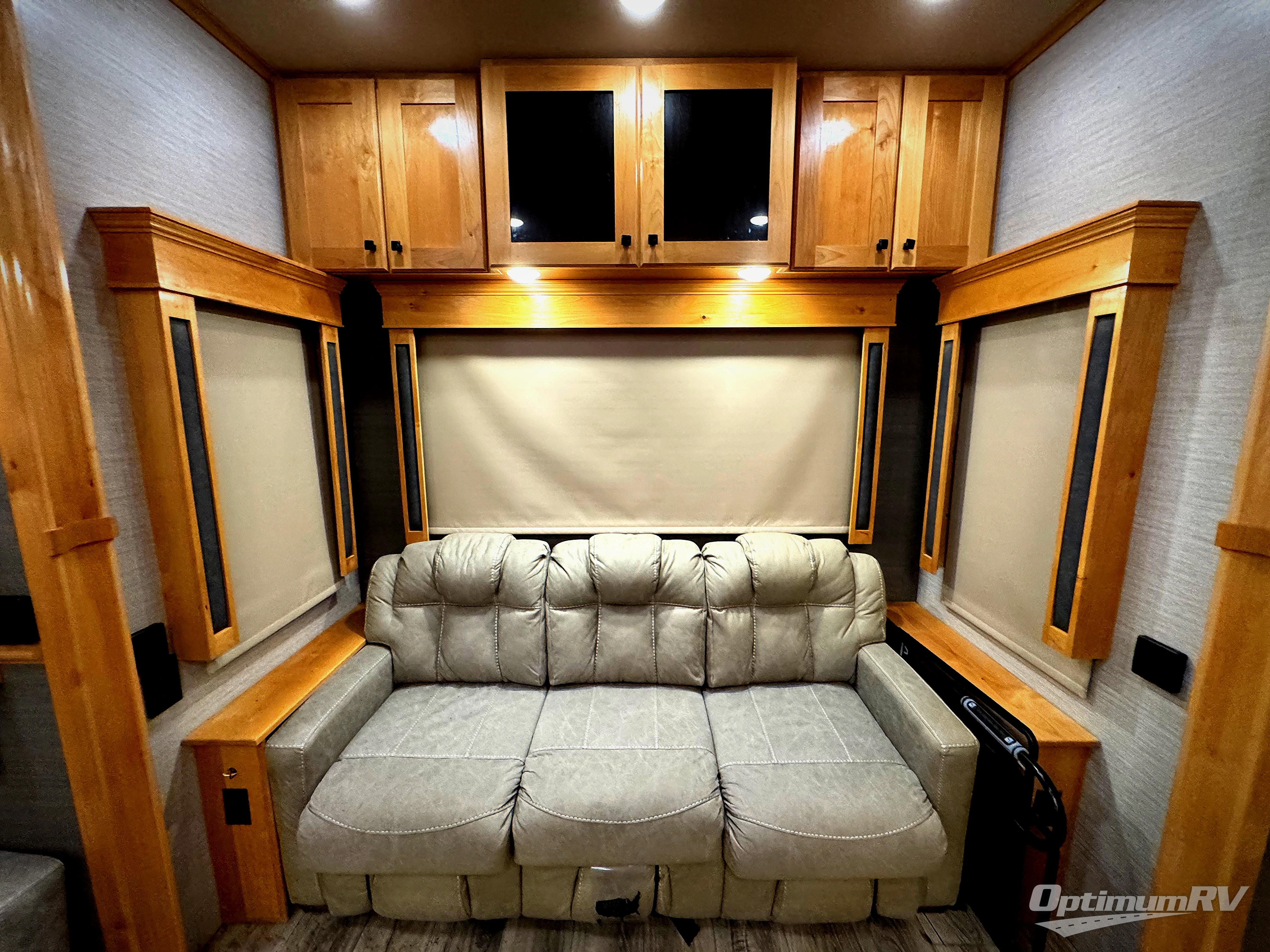 You will love the extra space throughout this fifth wheel thanks to the four slides, and the kitchen island will make it feel more like home. Relax on the theater sofa and watch a movie on the 50" monitor TV, or just enjoy the glow of the fireplace. The kids can play a game at the dinette with chairs, and the sofa bed will provide comfortable sleeping space at night. You and your spouse will have your own slide out king bed in the master suite, and the sliding doors here will add much-wanted space. Nothing says convenience like a half bath, plus a full bath, and this model delivers. The full bath includes dual bath sinks, a spacious 41" x 30" shower, plus a large front closet for all your clothes!