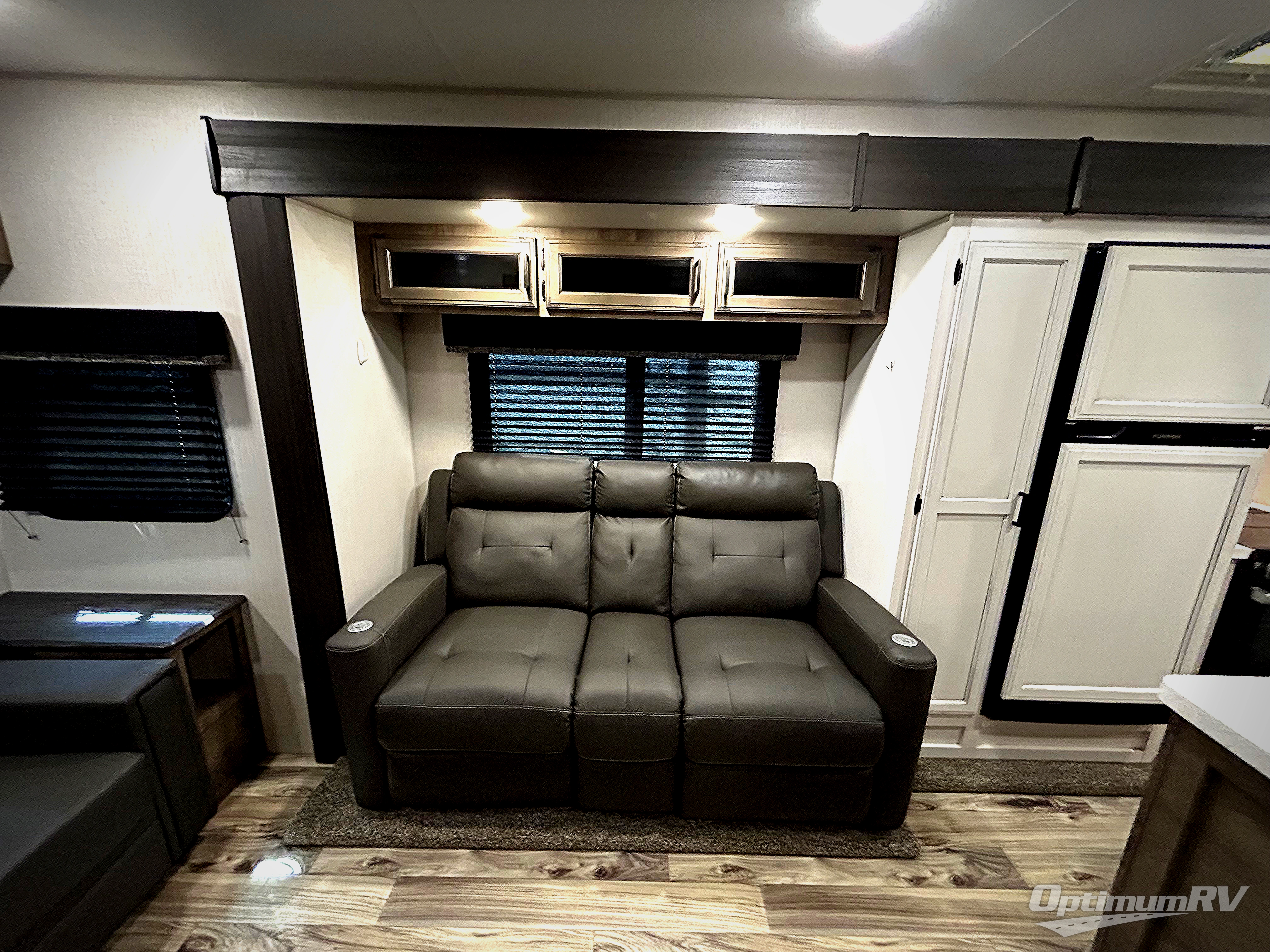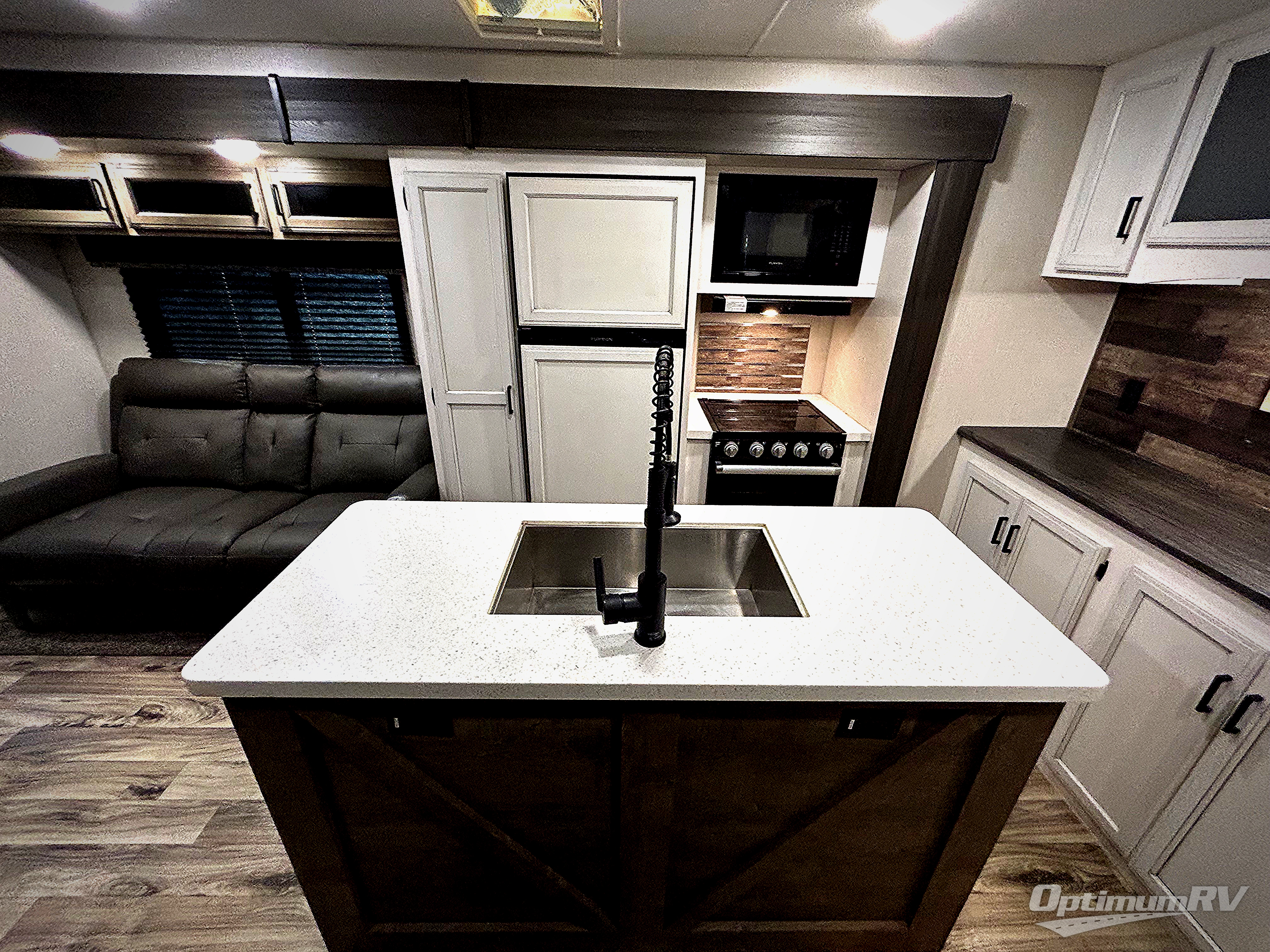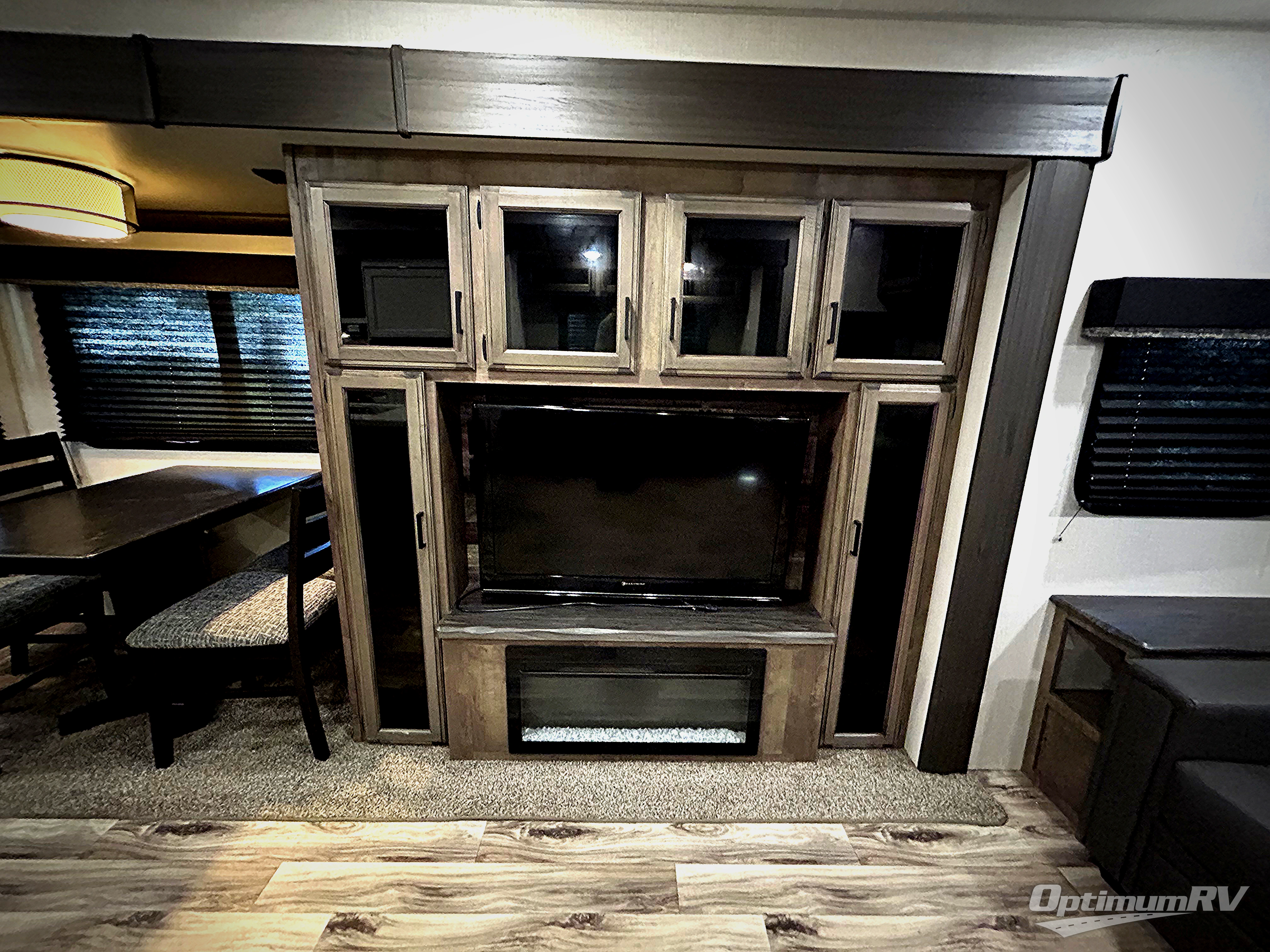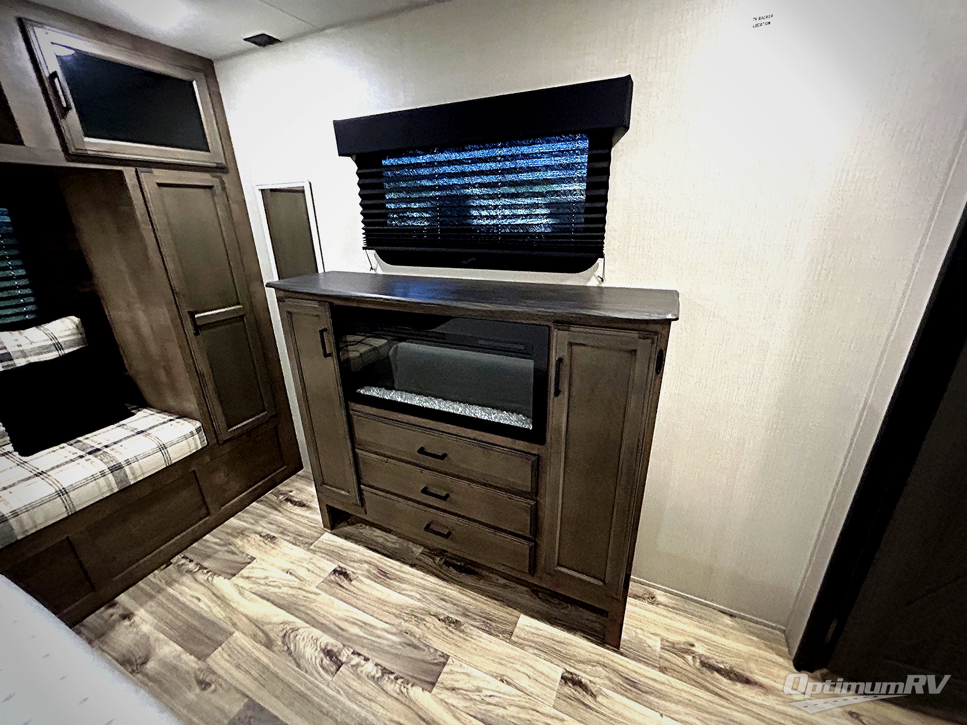 You will enjoy a relaxing evening each night in the rear living area of this travel trailer! It features a 70" sofa with end tables on either side to set your drink on and theater seating with USB charging outlets across from the entertainment center with a fireplace. The kitchen has a three burner cooktop for you to cook a delicious meal, a 10 cu. ft. refrigerator to store any leftovers in, and an island with a large sink to make clean up easier, plus there is a hutch to store your nice dishes. You can end each night feeling squeaky clean after showering in the 30" x 36" shower, and then head to the front private bedroom and read a book at the front window seat while the fireplace is going. There is also a king bed slide for you to sleep on and a closet that is prepped to add the optional washer and dryer!