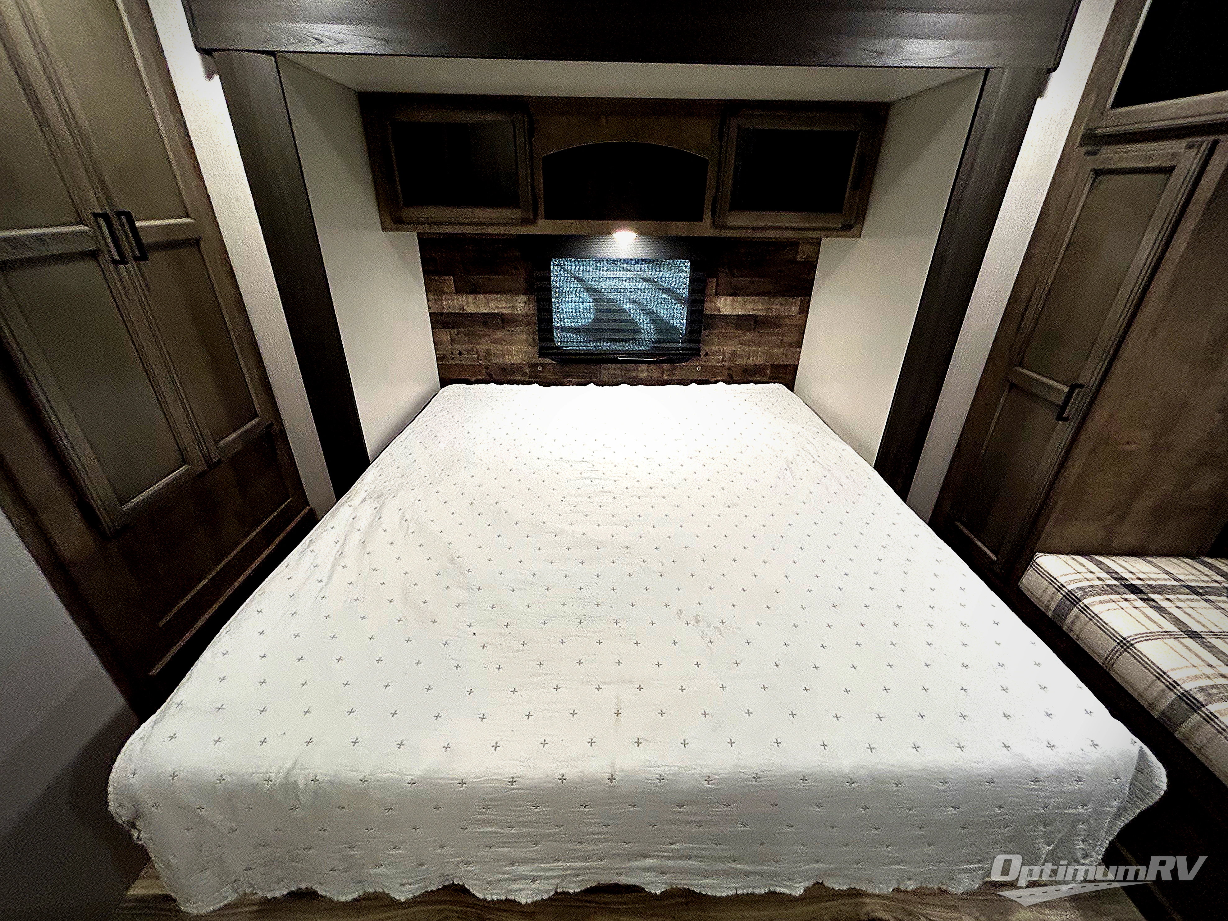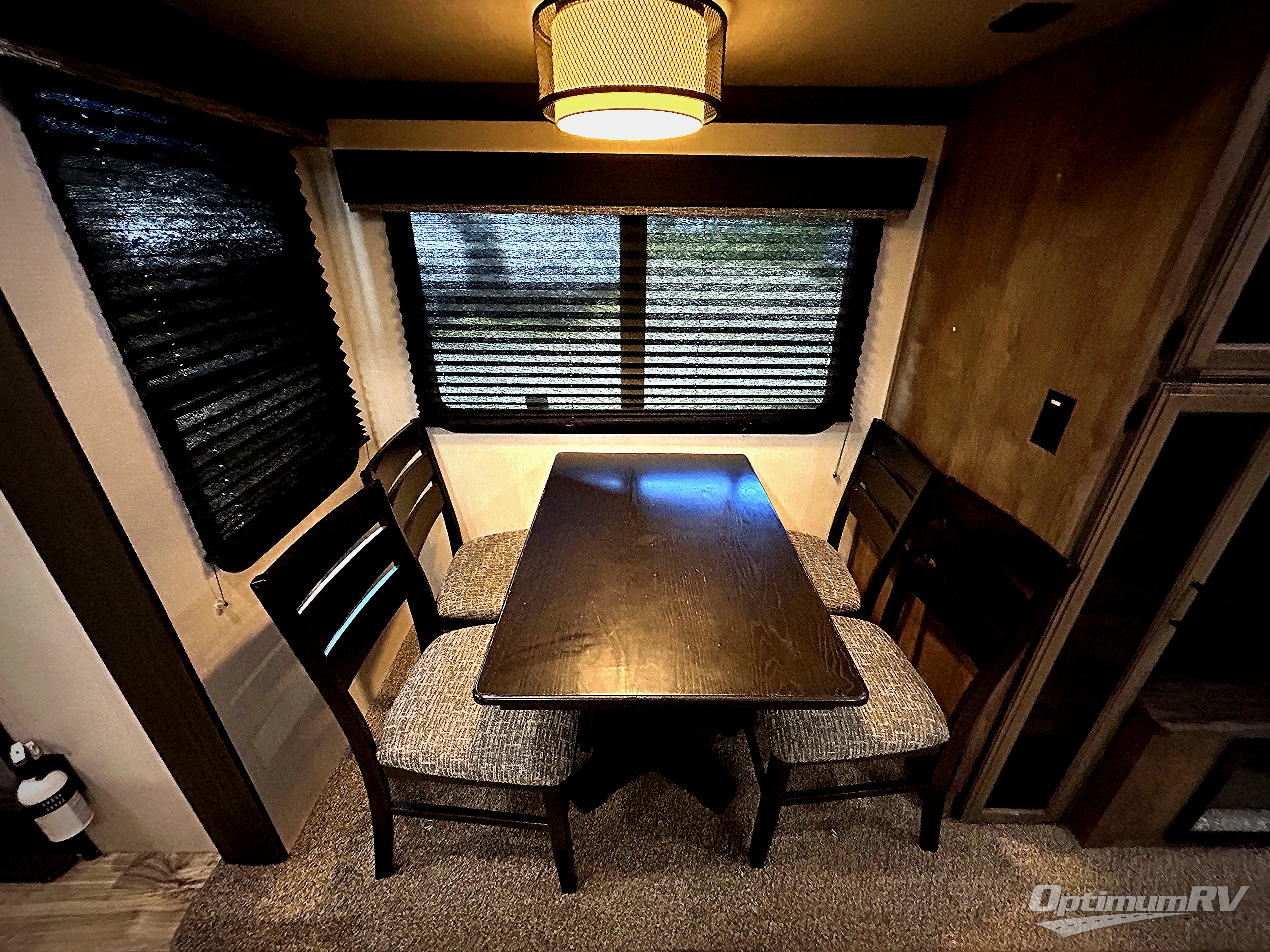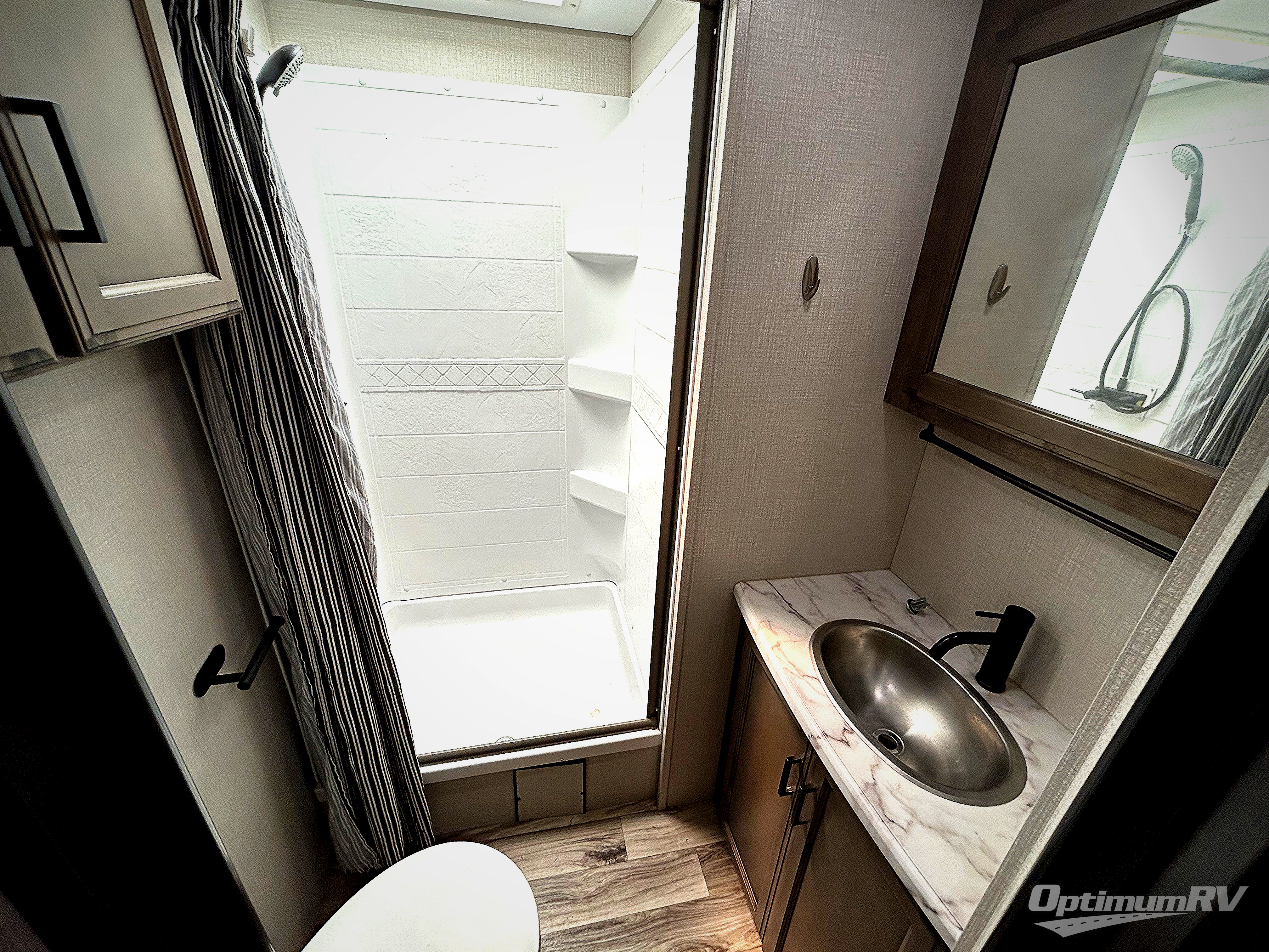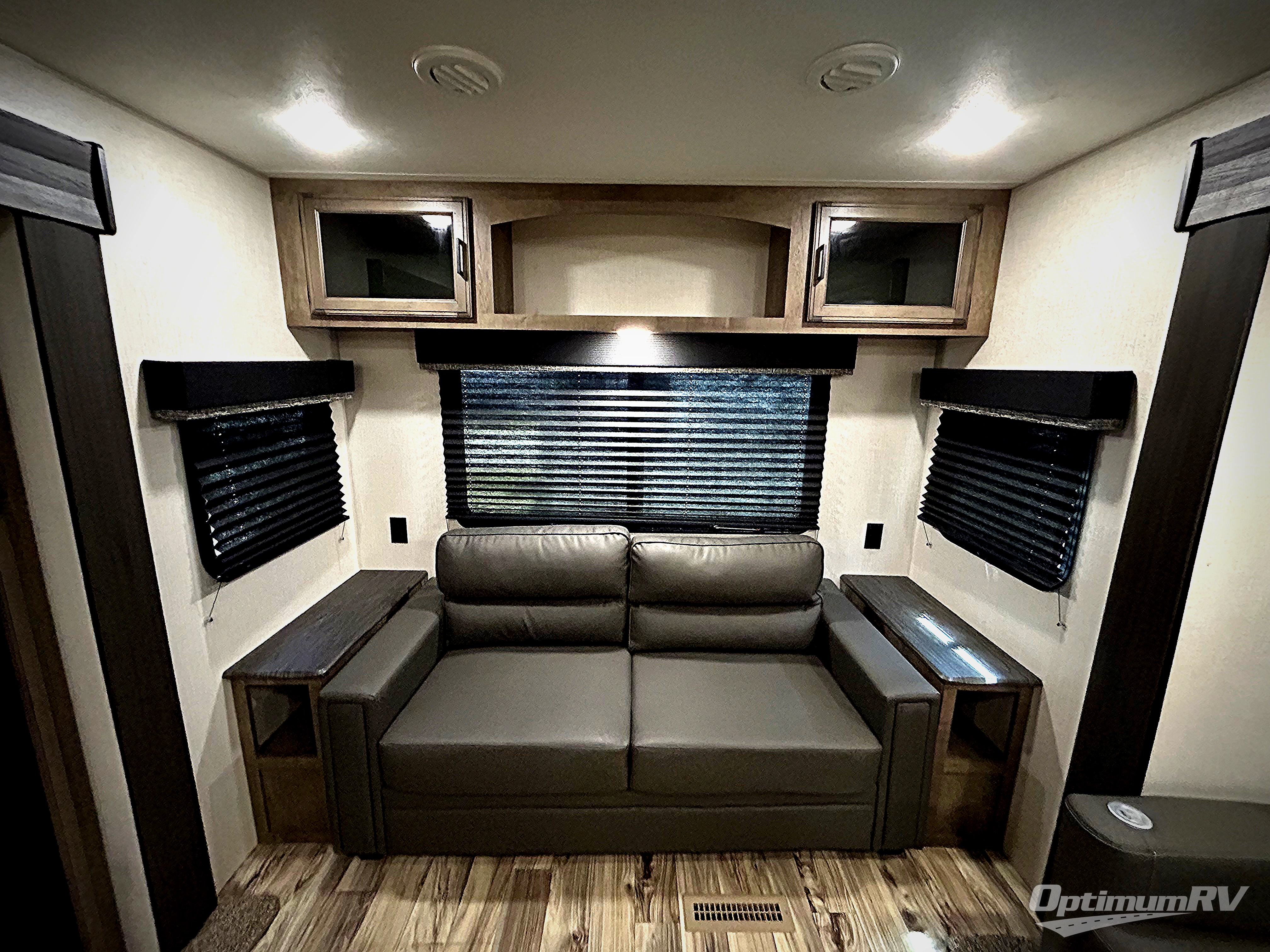 You will enjoy a relaxing evening each night in the rear living area of this travel trailer! It features a 70" sofa with end tables on either side to set your drink on and theater seating with USB charging outlets across from the entertainment center with a fireplace. The kitchen has a three burner cooktop for you to cook a delicious meal, a 10 cu. ft. refrigerator to store any leftovers in, and an island with a large sink to make clean up easier, plus there is a hutch to store your nice dishes. You can end each night feeling squeaky clean after showering in the 30" x 36" shower, and then head to the front private bedroom and read a book at the front window seat while the fireplace is going. There is also a king bed slide for you to sleep on and a closet that is prepped to add the optional washer and dryer!