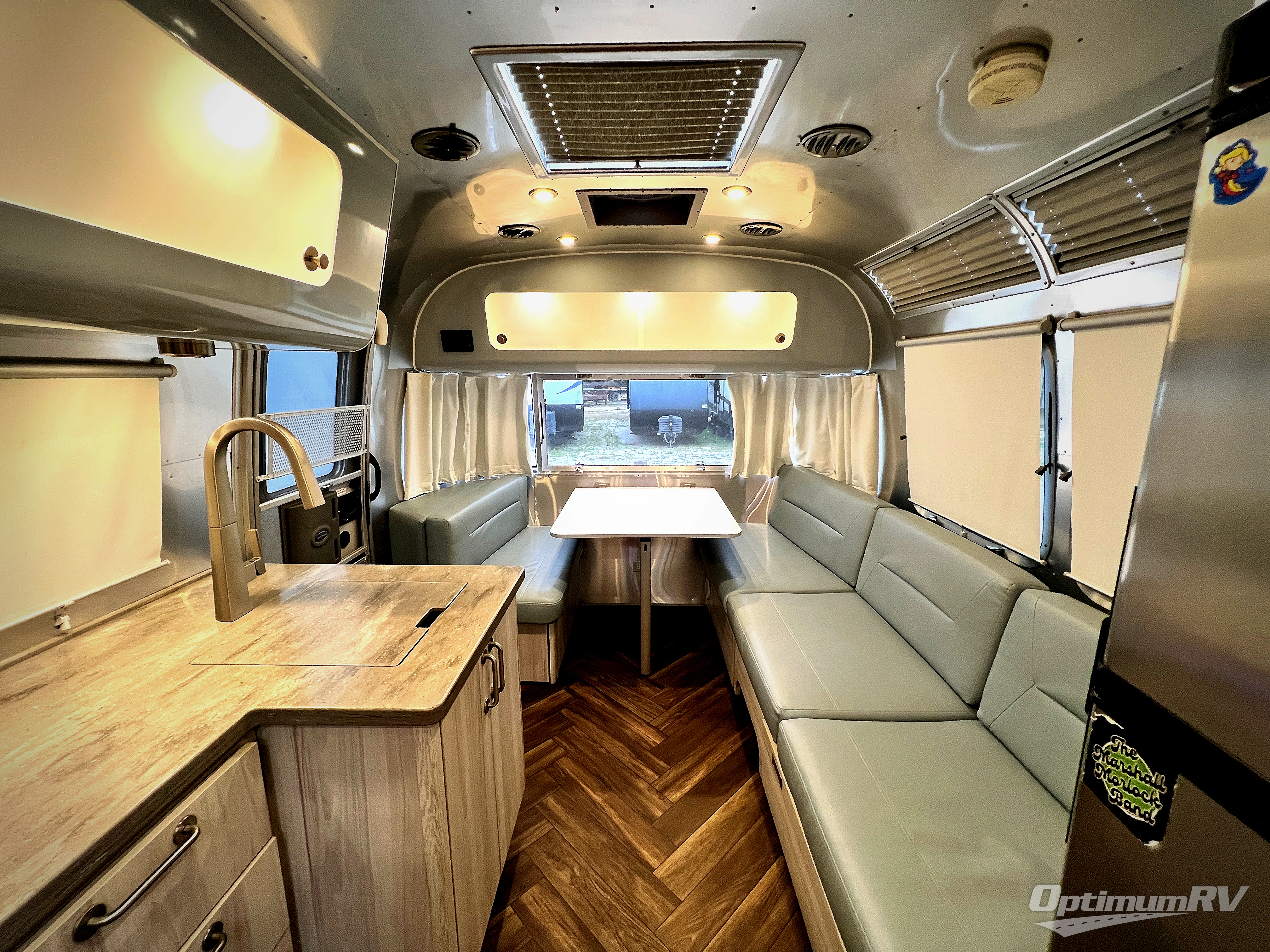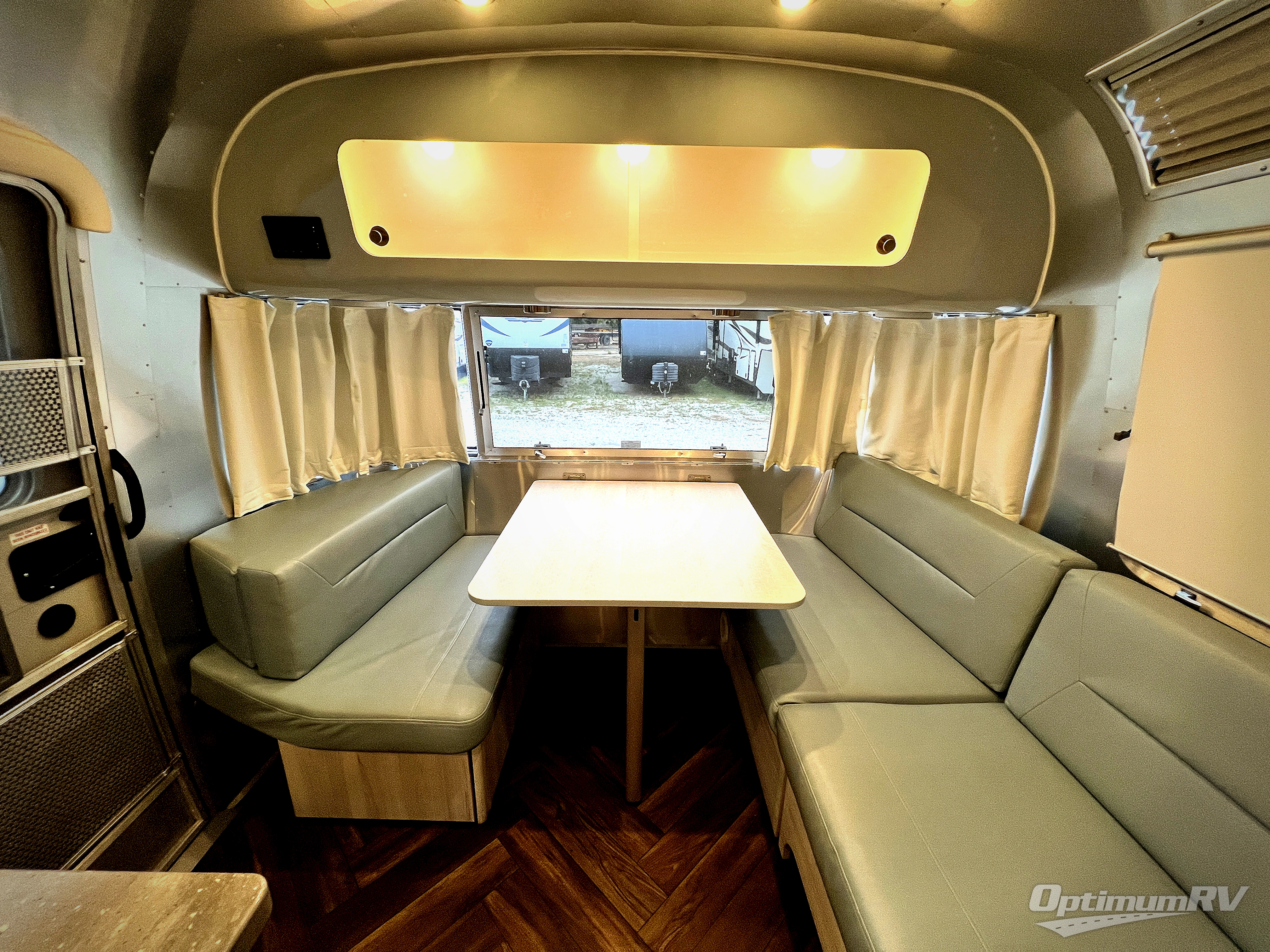 Every time you step foot into the Airstream International travel trailer, you will feel as if you are breathing in a breath of fresh air! The fresh coastal décor was inspired by the waterfront, and the stylish interior delivers a relaxing environment and comfortable luxury. The panoramic windows increase the amount of natural sunlight that streams through to the interior, but they also have blackout shades that you can close whenever you need a darkened room. The beautiful handcrafted Italian Lite-Ply laminated cabinetry is an attractive base for the overhead storage lockers that have sliding doors and LED lighting. The dimmable interior LED lighting will create the perfect amount of illumination for you as you spend time indoors. The exterior has excellent features as well with its enclosed aluminum insulated heated underbelly, unique front door key with heavy-duty deadbolt, optional solar package, solar front window protection, and exterior shower with hot and cold water.