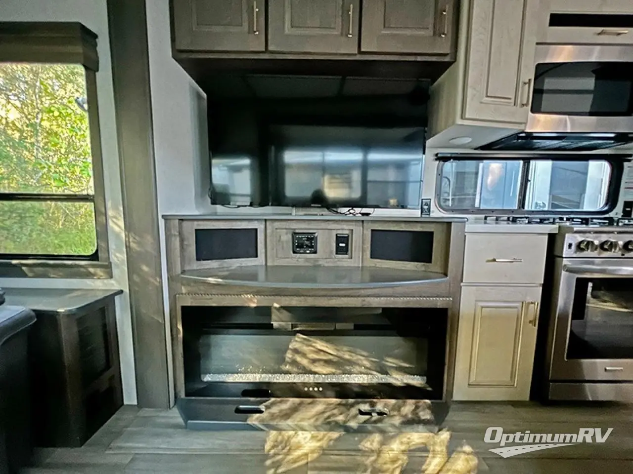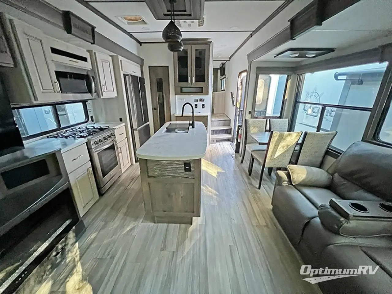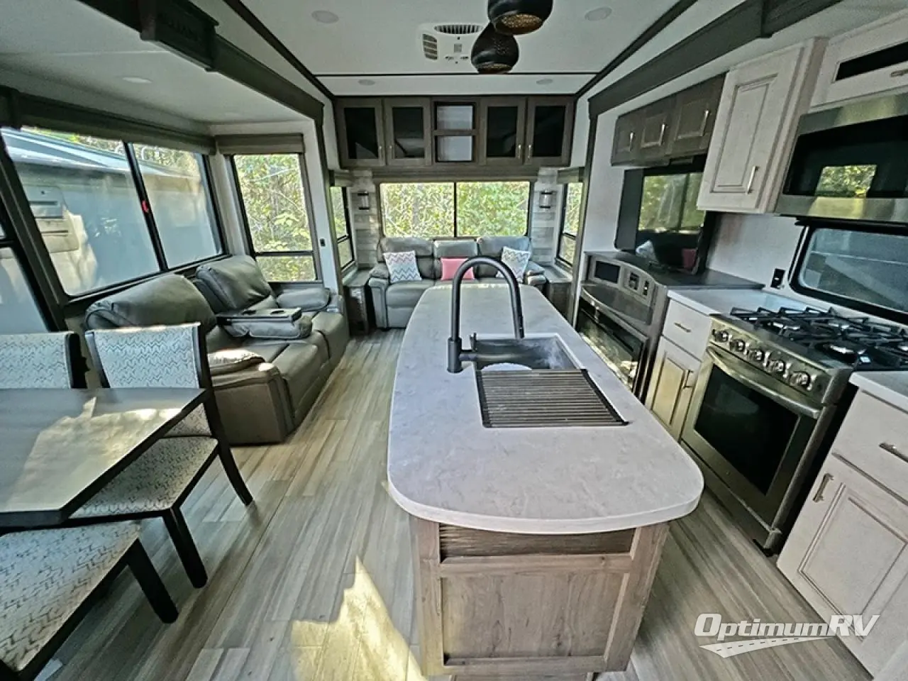 Search for the best views, the nicest RV park or a place you haven't seen for years with this Paradigm in tow! From the king bed slide in the master bedroom, the Smart TV, the dresser with flip-up hidden storage and the front wardrobe to the rear living area with a sleeper sofa near the pull-out fireplace with storage, you might decide to live in this fifth wheel. The full bathroom offers a large residential shower, a porcelain toilet with soft close seat, and storage for your linens, while the kitchen gives you two pantries, an island with a stainless steel farm sink and a space prepped for a dishwasher option, plus a residential microwave, range and oven to make meals. And you will love the dual recliner love seat and the floating dinette table. There are so many more features included, take this fifth wheel home today!