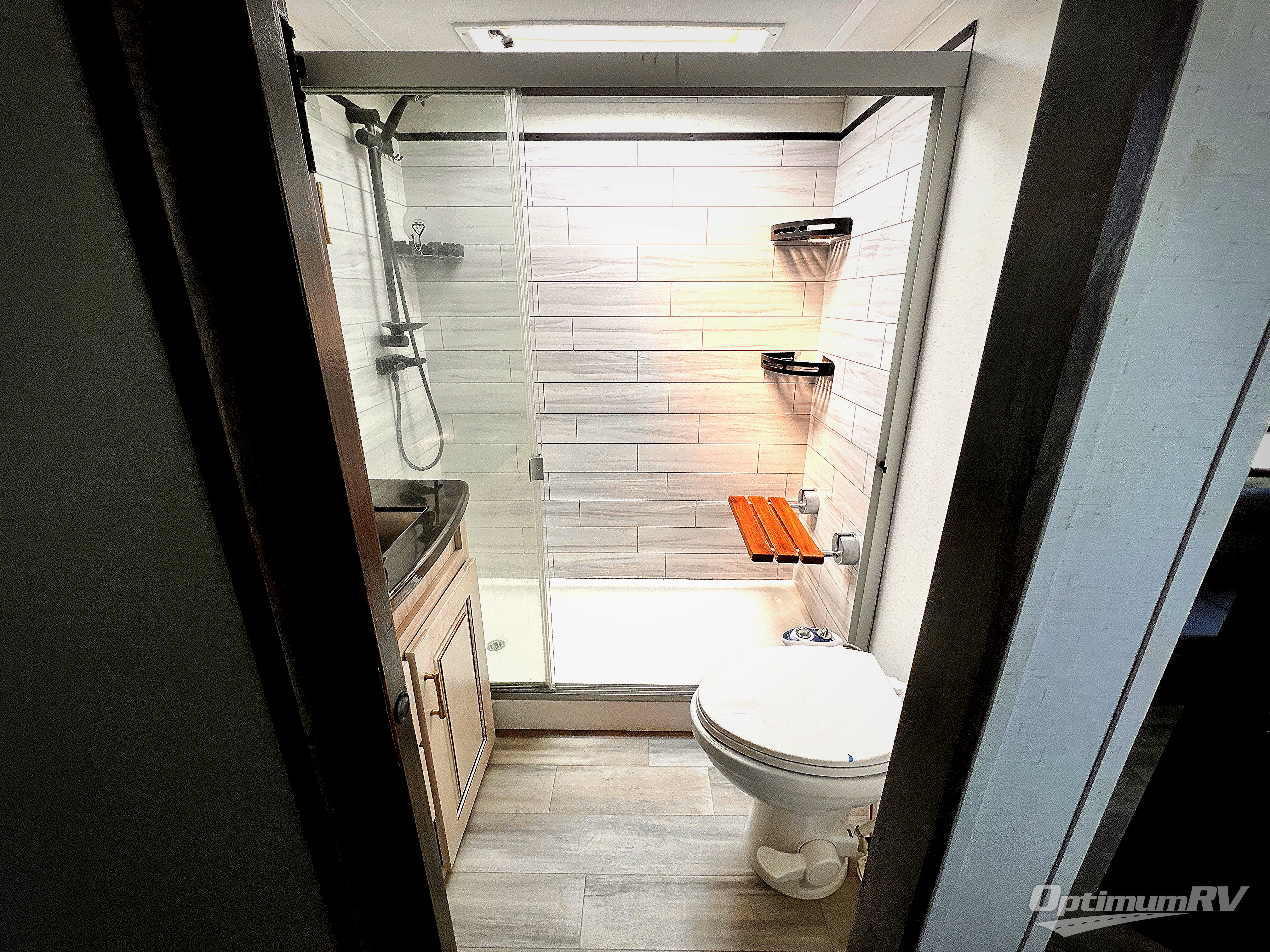 If you enjoy your own space, this fifth wheel offers just that with a separate kitchen in the rear from the middle living area. The kitchen offers lots of counter space, plus residential appliances, and you can choose a residential refrigerator option, a pantry, a stainless steel farm sink and a space prepped to add a dishwasher option. Everyone can dine at the floating dinette with four chairs or while sitting in the living area on the dual recliner love seat or the two sleeper sofas that offer space for overnight guests. The welcoming entry allows you to head to the living area or up the stairs to the front spacious bedroom and hallway thanks to the slide out with storage in the hallway, and shelves plus a king bed in the bedroom. You will find more places for your clothing and things in the front wardrobe, the flip-top dresser and under the two seats. There are more features to see that bring you comfort and convenience, and the style you want. And you can add a few options such as a washer/dryer, an LED motion light strip in the pantry, and/or dual pane windows.