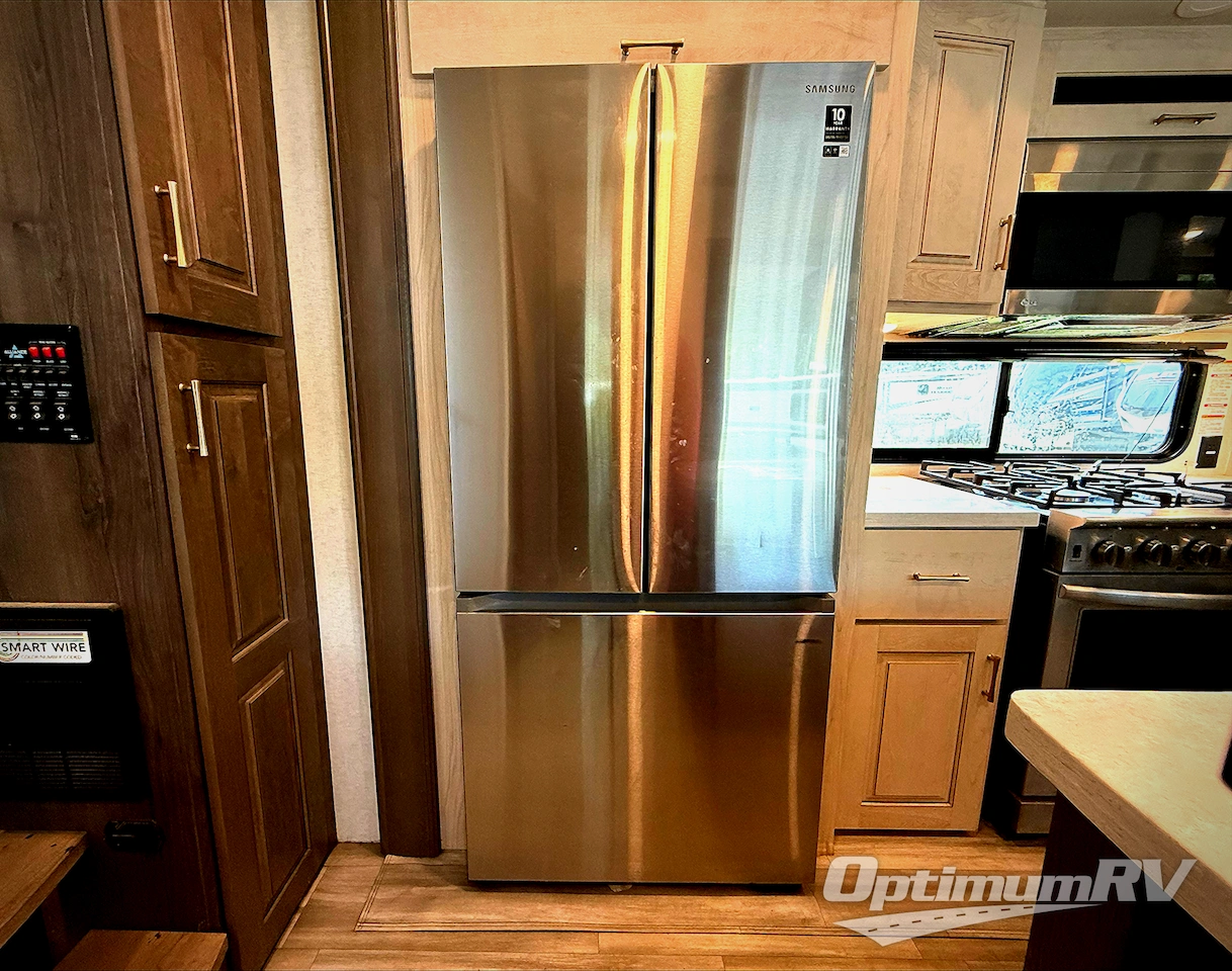 An active family will want this fifth wheel with its exterior basement pull-out tray that measures at 48" x 115" to load up your kayaks and such. Just above this area is the master suite with a rear bathroom that offers a residential shower, a porcelain toilet with soft close seat, plus a wardrobe and shelf storage. The king bed slide gives you more floor space, and you will have a seat, a flip-top dresser, and a Smart TV to watch. The half bath is next to the main entry which is super convenient, and the middle kitchen is separate from the front living area. The cook will love the residential microwave, range and oven, plus the option to add a residential refrigerator, plus the pantry, and the extra counter space on the kitchen island with a stainless steel farm sink. And the views out of the atrium windows in the slide out which includes the floating dinette table are a must see. And when you need to watch the big game, the 55" Smart TV with pull-out fireplace below are up front with the dual recliner love seat and two sleeper sofas.