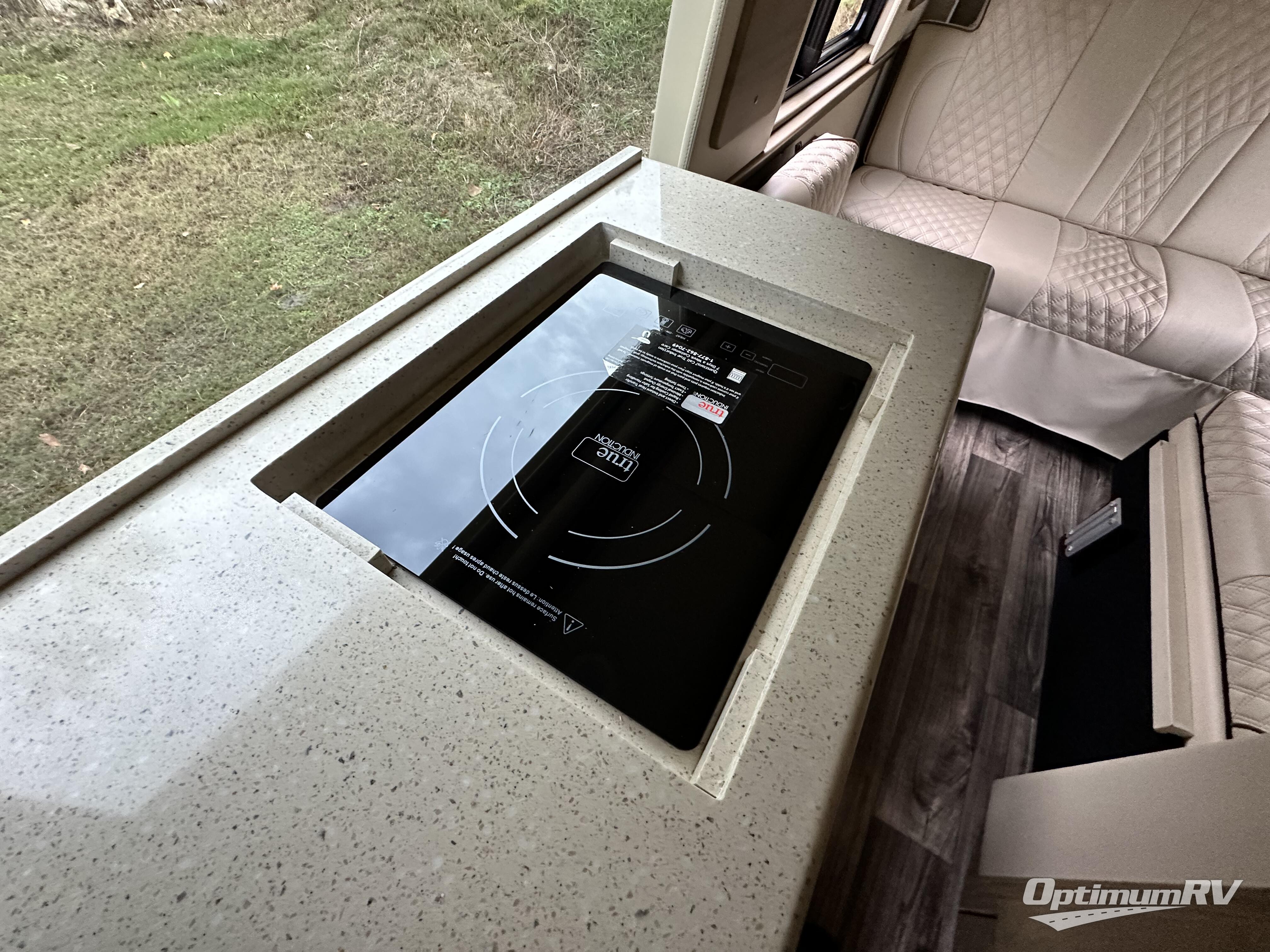 You can use the rear power folding sofa bed to comfortably relax in this American Patriot Class B diesel motorhome. There are two sets of seats with seat belts located next to the sofa for additional travel space as you cruise down the highway, and the rear HDTV can be enjoyed from this area. The Lagun removable table sits in front of the extra seats, so this space can also be used as a dining location. You'll also have a second dining location if you move the table up front to the table pedestal mount next to the cab seats. Meals will be easy to make when you utilize the great appliances found in the kitchen, like the stainless steel microwave, refrigerator, and solid-surface countertops. You can also keep lots of belongings stored away in the overhead cabinets.
