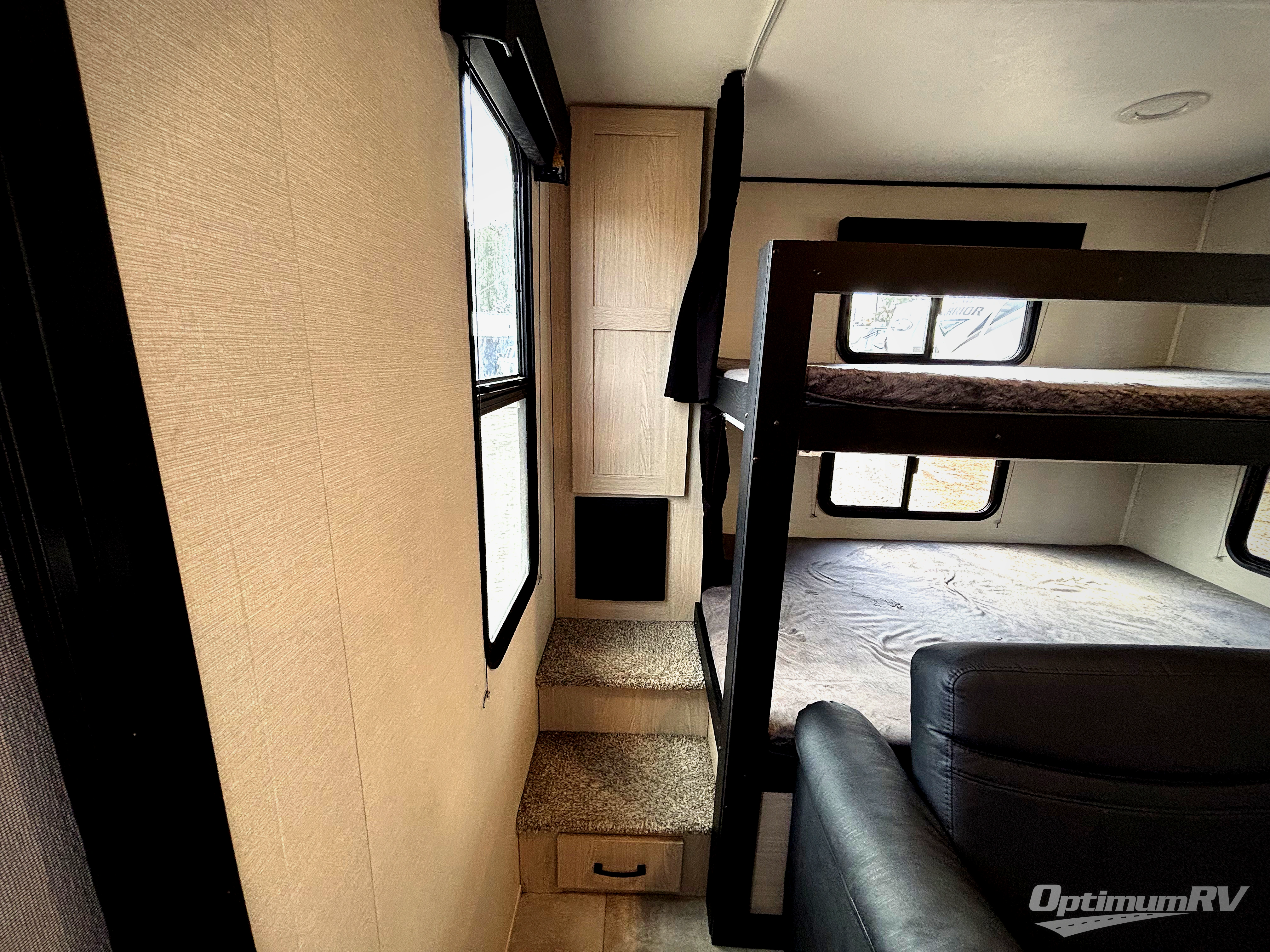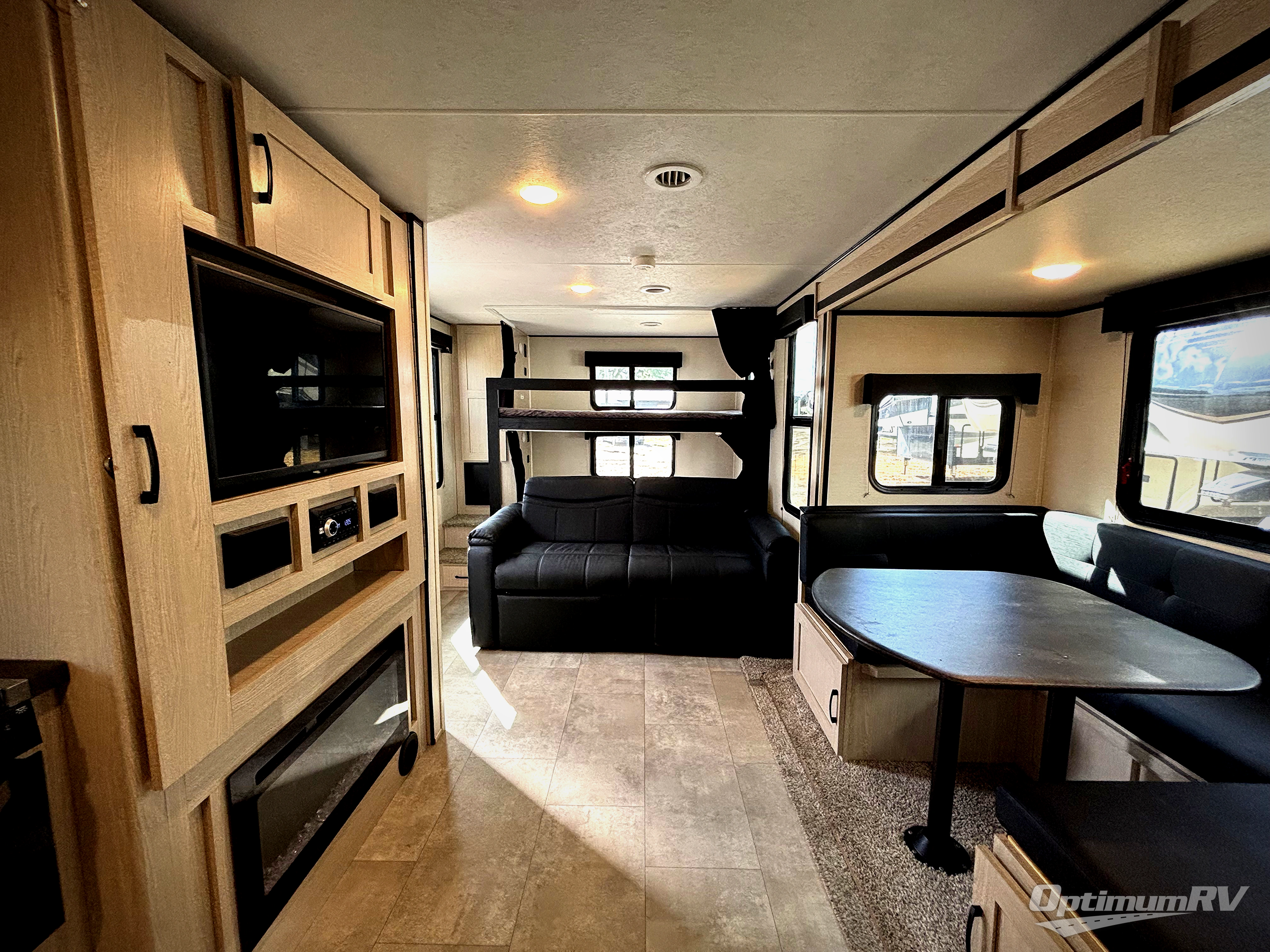 Camping with family or a larger group of friends is easier than ever in this dual entry trailer that can sleep nine people comfortably. The little ones will love the double-size bunks with storage steps, and you'll have the queen bed with super storage all to yourselves. There is also a U-shaped dinette slide and a sofa for even more sleeping space. If the weather is nice, you'll find yourselves outdoors under the 20' power awning and enjoying a snack from the exterior camp kitchen. This model also includes a 32" LED TV, and you'll find the pantry/storage behind the entertainment center for added convenience.
