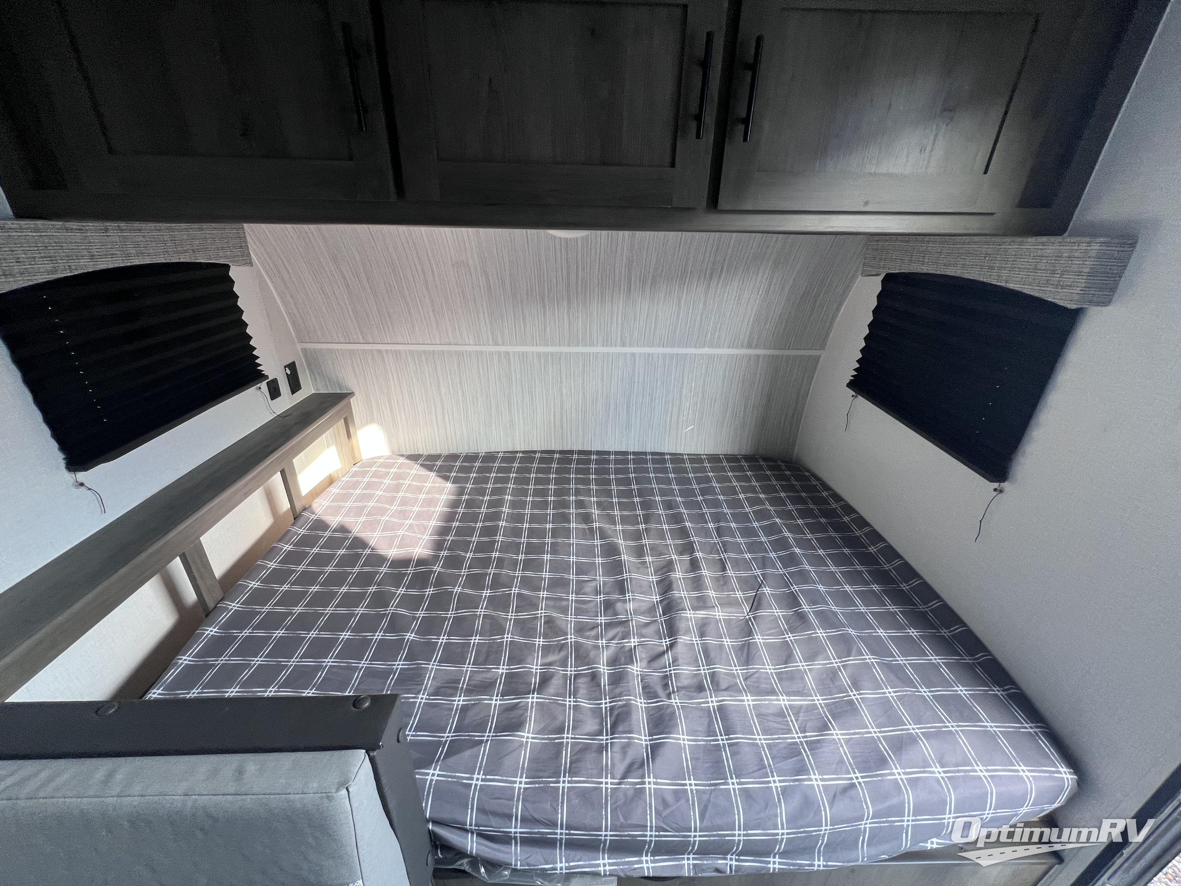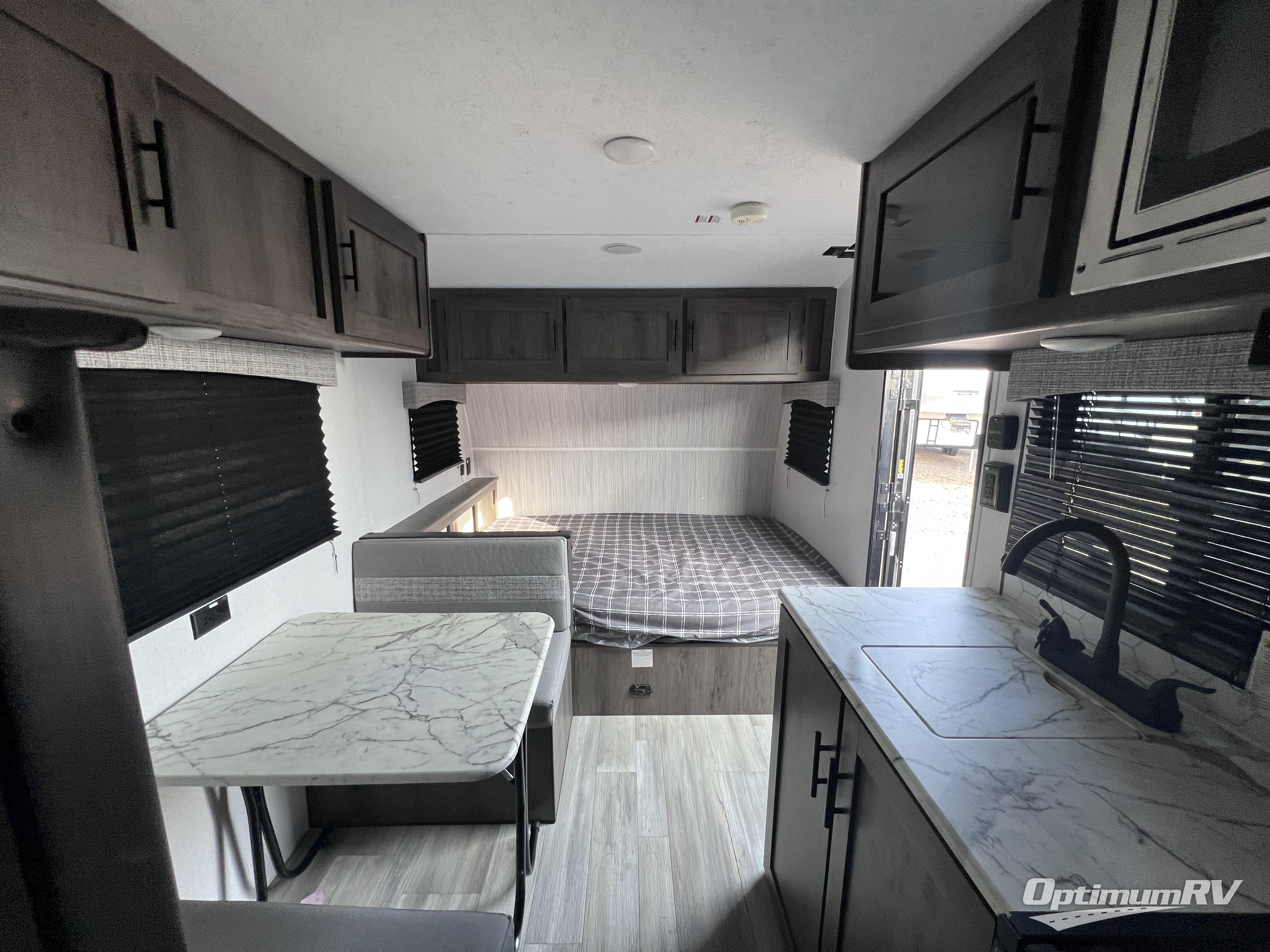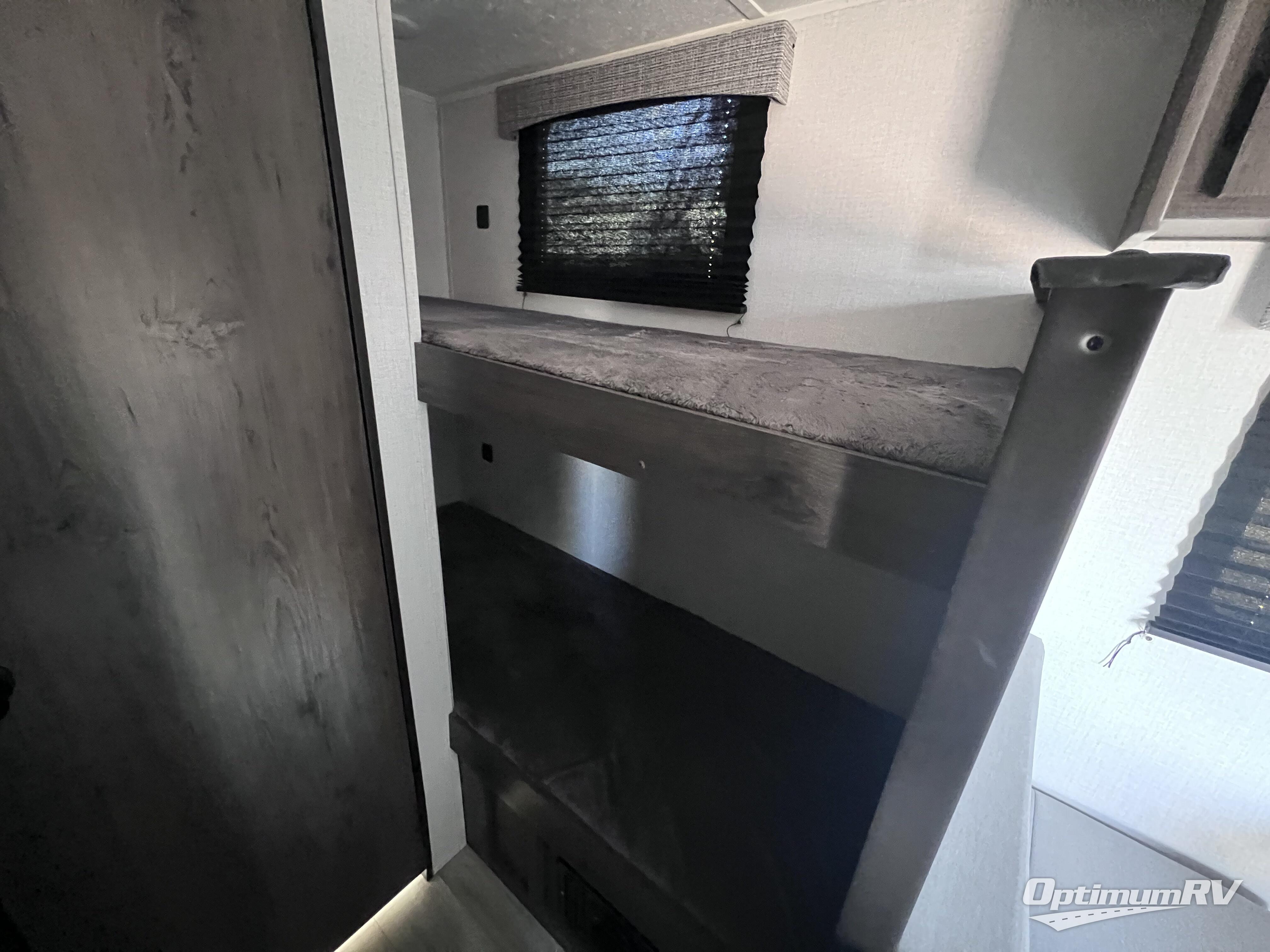 Pack your bags and hitch up this travel trailer for a fun family vacation! The kiddos can sleep on the set of 28" x 72" bunk beds and you can sleep on the front 54" x 74" bed with overhead cabinets and a storage space. Keep everyone's bellies full with the two burner cooktop, the 7 cu. ft. gas/electric refrigerator, and kitchen pantry. Enjoy your meals together at the booth dinette then play a card game or two. Everyone will stay squeaky clean between the rear corner bathroom with the ABS tub surround shower and the outside shower with hot and cold water!