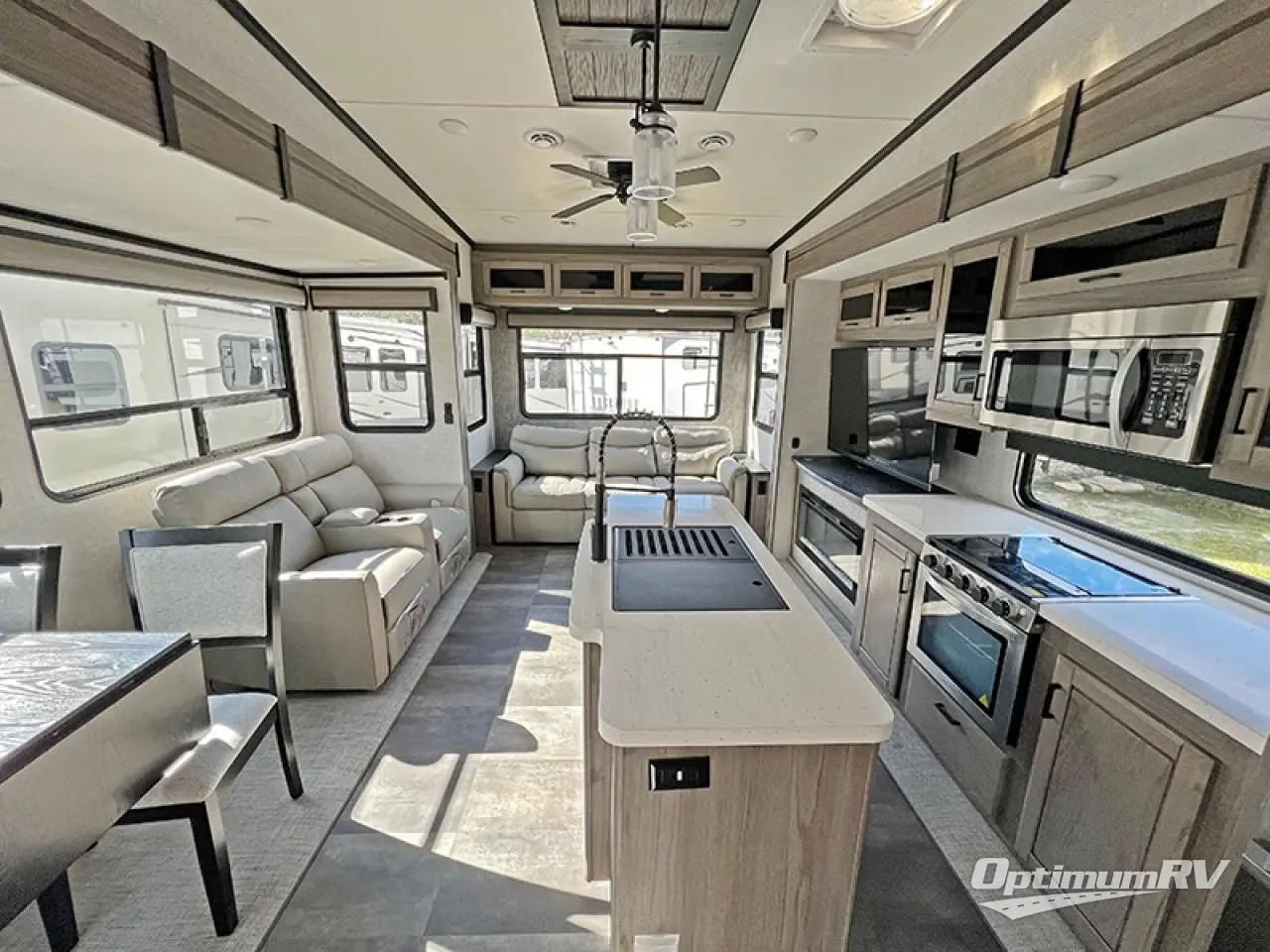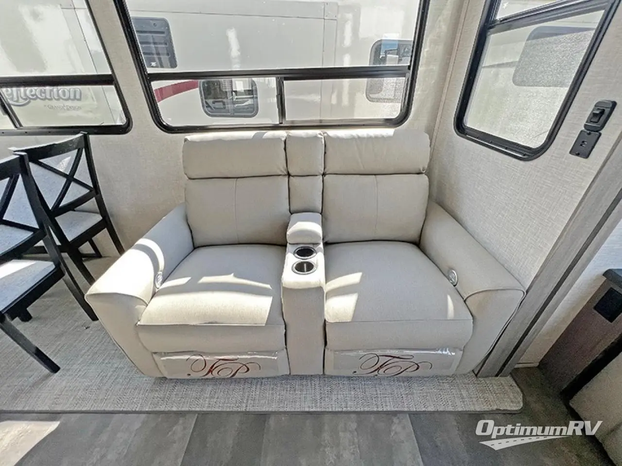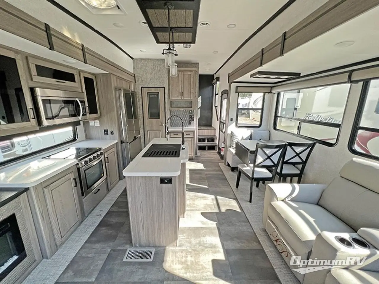 You won't want to camp any other way once you step inside this fifth wheel! The front private bedroom has a king bed slide for more walking around space, a fireplace with a 39" TV above it and a bench next to it, and a front closet with a shoe shelf and an area prepped to add the optional washer and dryer. After a good night's rest, freshen up in the full bathroom with the 48" shower with a seat and then head to the kitchen to fry up some eggs on the three burner cooktop. There is also a kitchen island to make meal prepping easier, an overhead cabinet with a hutch to store your dishes, and a linen area above the pantry. Enjoy your meals at the dinette with chairs on one side and booth seating on the other side. What better way to wind down your nights than to relax on either the rear tri-fold sofa or the theater seating with heat and massage across from the entertainment center which has a 50" TV to watch movies and a fireplace below it!