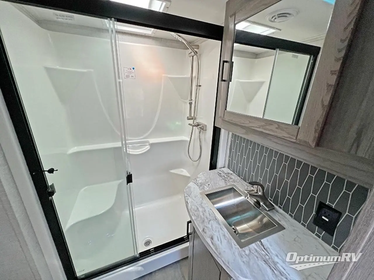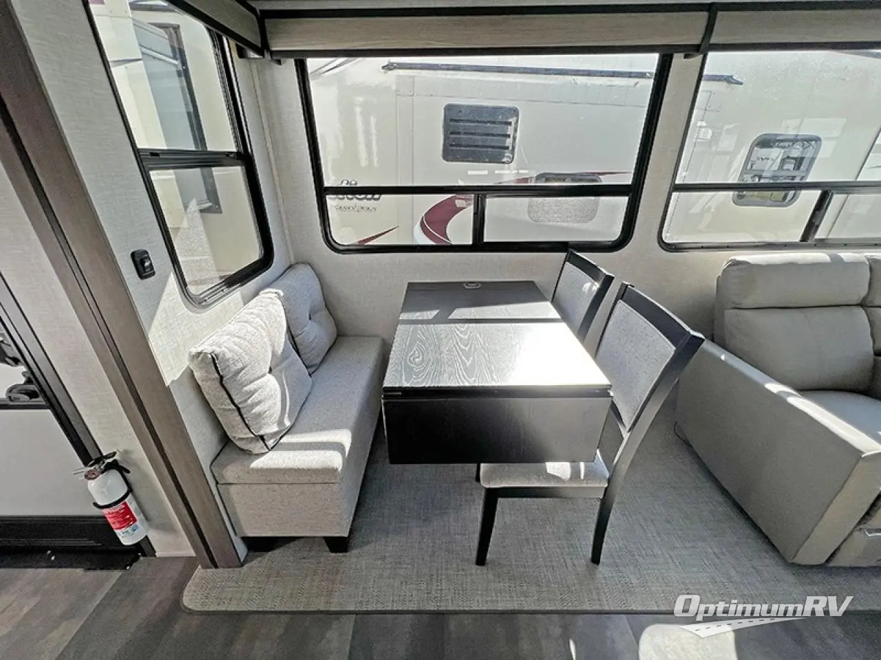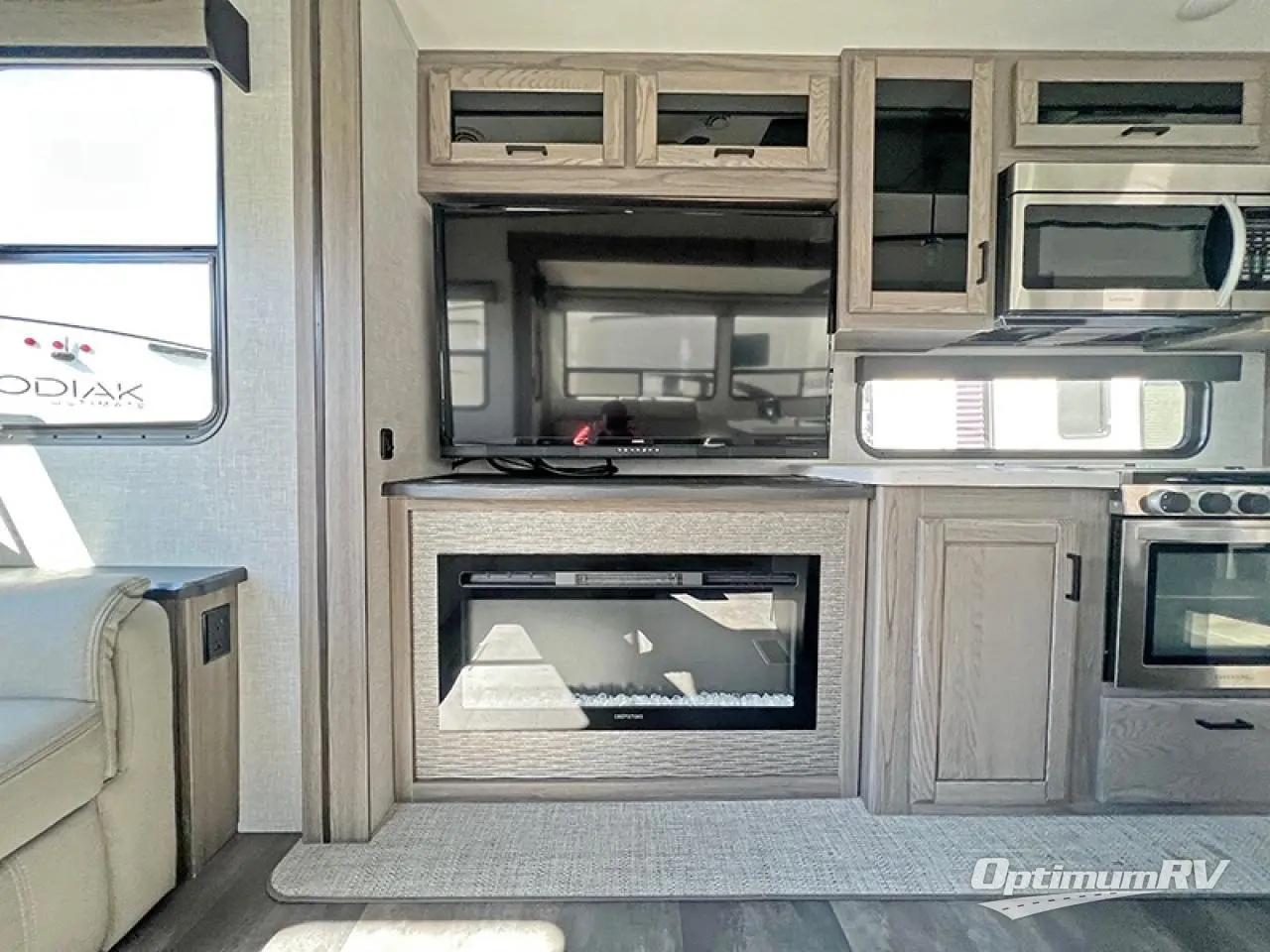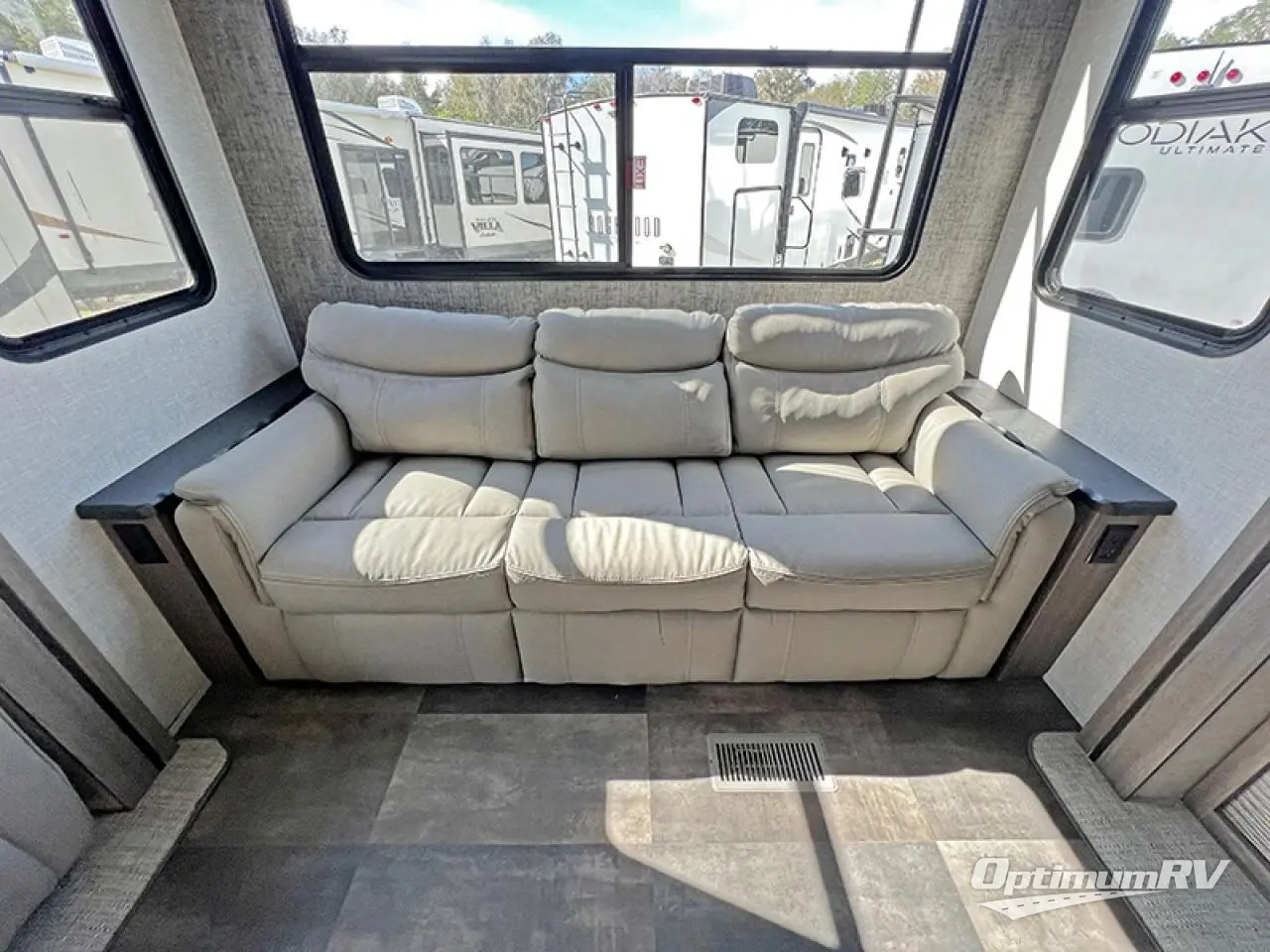 You won't want to camp any other way once you step inside this fifth wheel! The front private bedroom has a king bed slide for more walking around space, a fireplace with a 39" TV above it and a bench next to it, and a front closet with a shoe shelf and an area prepped to add the optional washer and dryer. After a good night's rest, freshen up in the full bathroom with the 48" shower with a seat and then head to the kitchen to fry up some eggs on the three burner cooktop. There is also a kitchen island to make meal prepping easier, an overhead cabinet with a hutch to store your dishes, and a linen area above the pantry. Enjoy your meals at the dinette with chairs on one side and booth seating on the other side. What better way to wind down your nights than to relax on either the rear tri-fold sofa or the theater seating with heat and massage across from the entertainment center which has a 50" TV to watch movies and a fireplace below it!