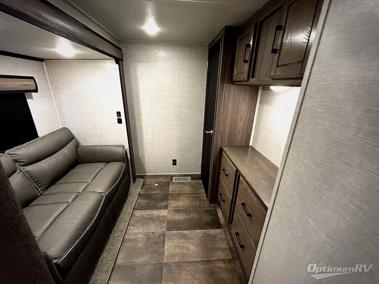 With two bedrooms, everyone will have their own comfortable place to sleep in this fifth wheel! The front private bedroom has a king bed slide, a dresser base with a fireplace and 39" TV, a bench seat, and a front closet that is prepped to add an optional washer and dryer. The second bedroom has a tri-fold sofa, a dresser, a wardrobe, and overhead cabinets, plus a loft above it all for storage or sleeping. Prepare your best home cooked meals with the Furrion kitchen collection and the kitchen island then enjoy them at the dinette. There is even an outside kitchen with a refrigerator, a sink, and a two burner cooktop to breathe in some fresh air while you cook and stay protected by the 18' power awning. Relax in true comfort each night on either the rear tri-fold sofa or the power theater seating across from the entertainment center with a fireplace and a 50" TV.