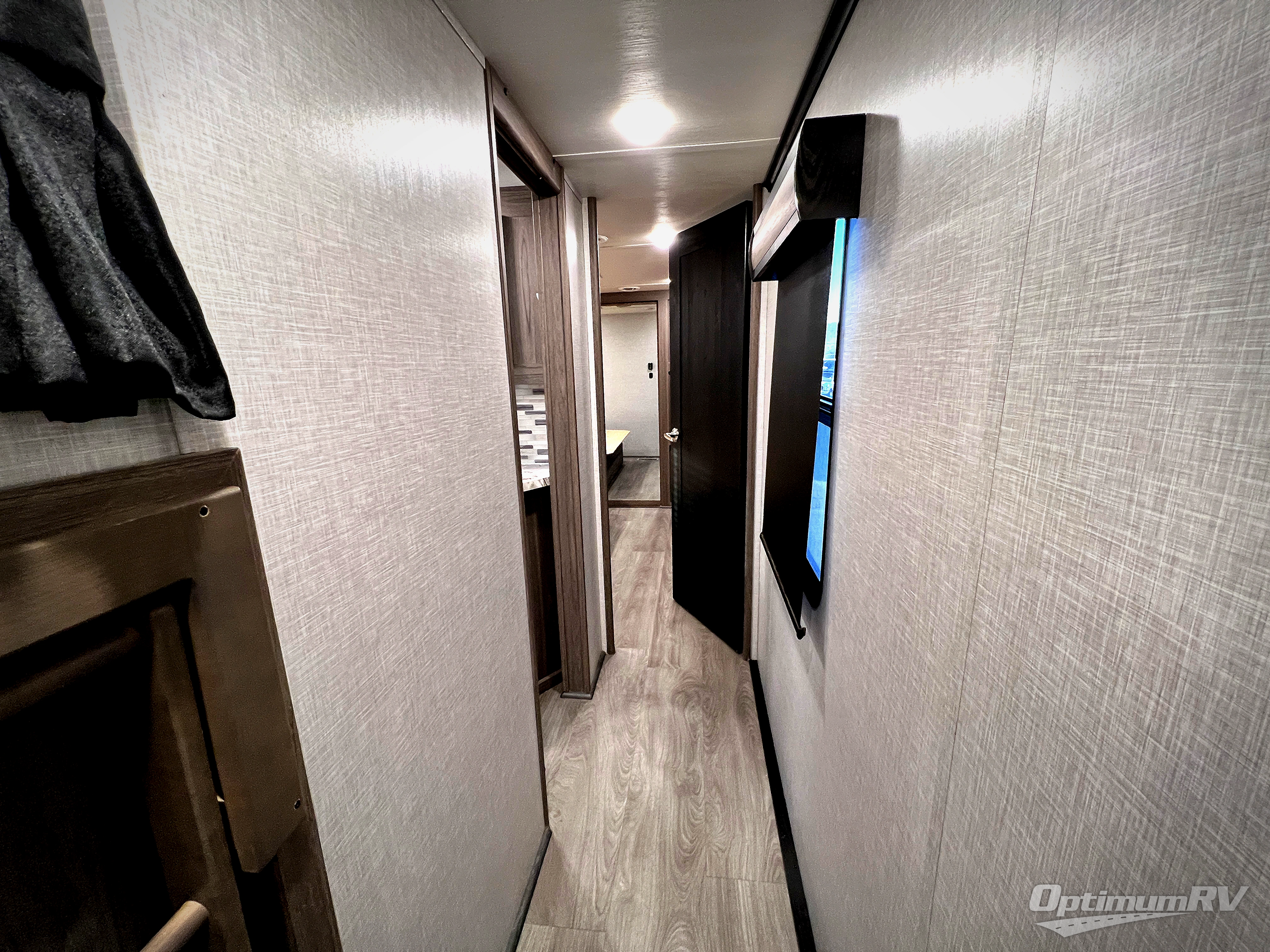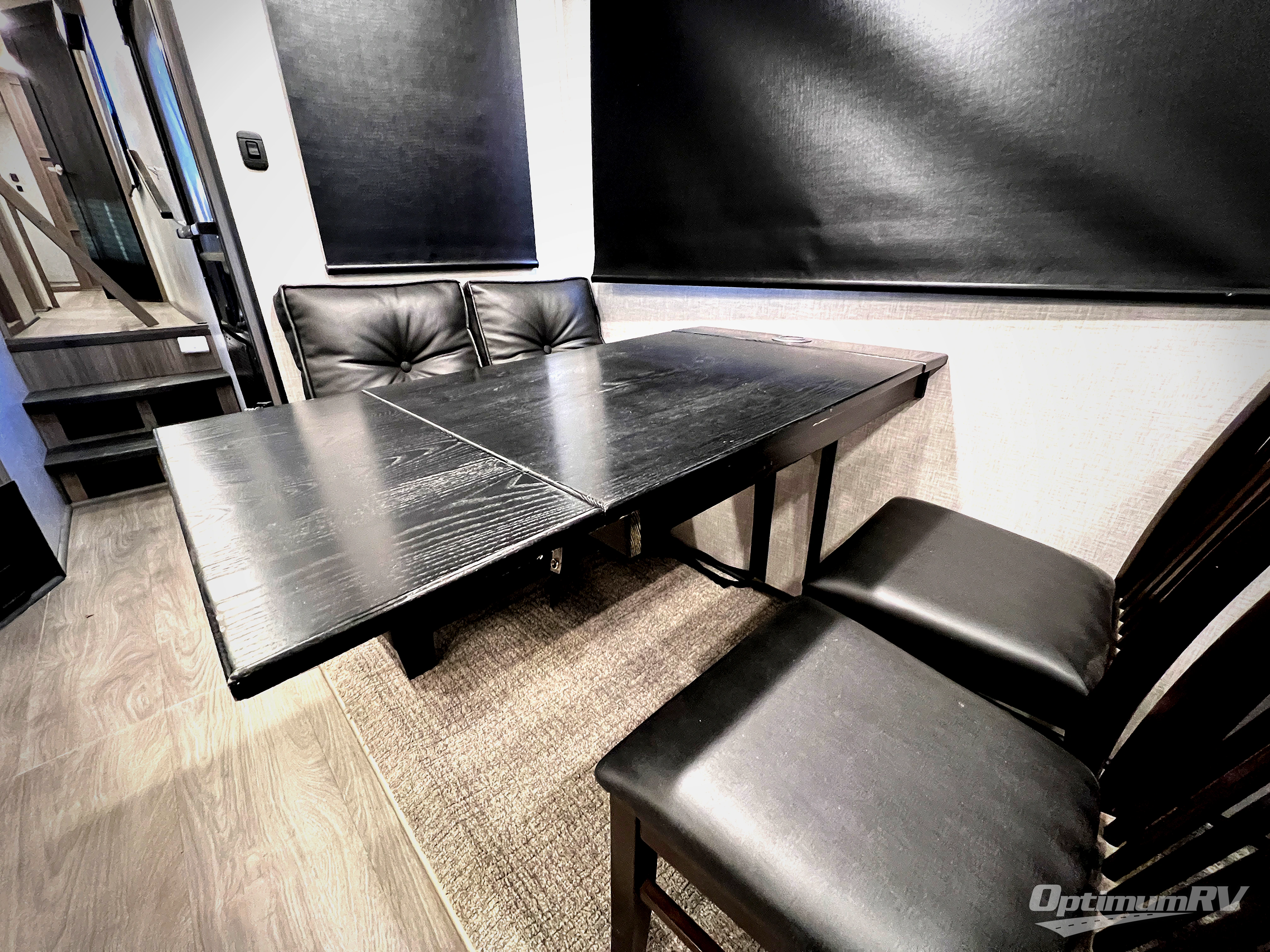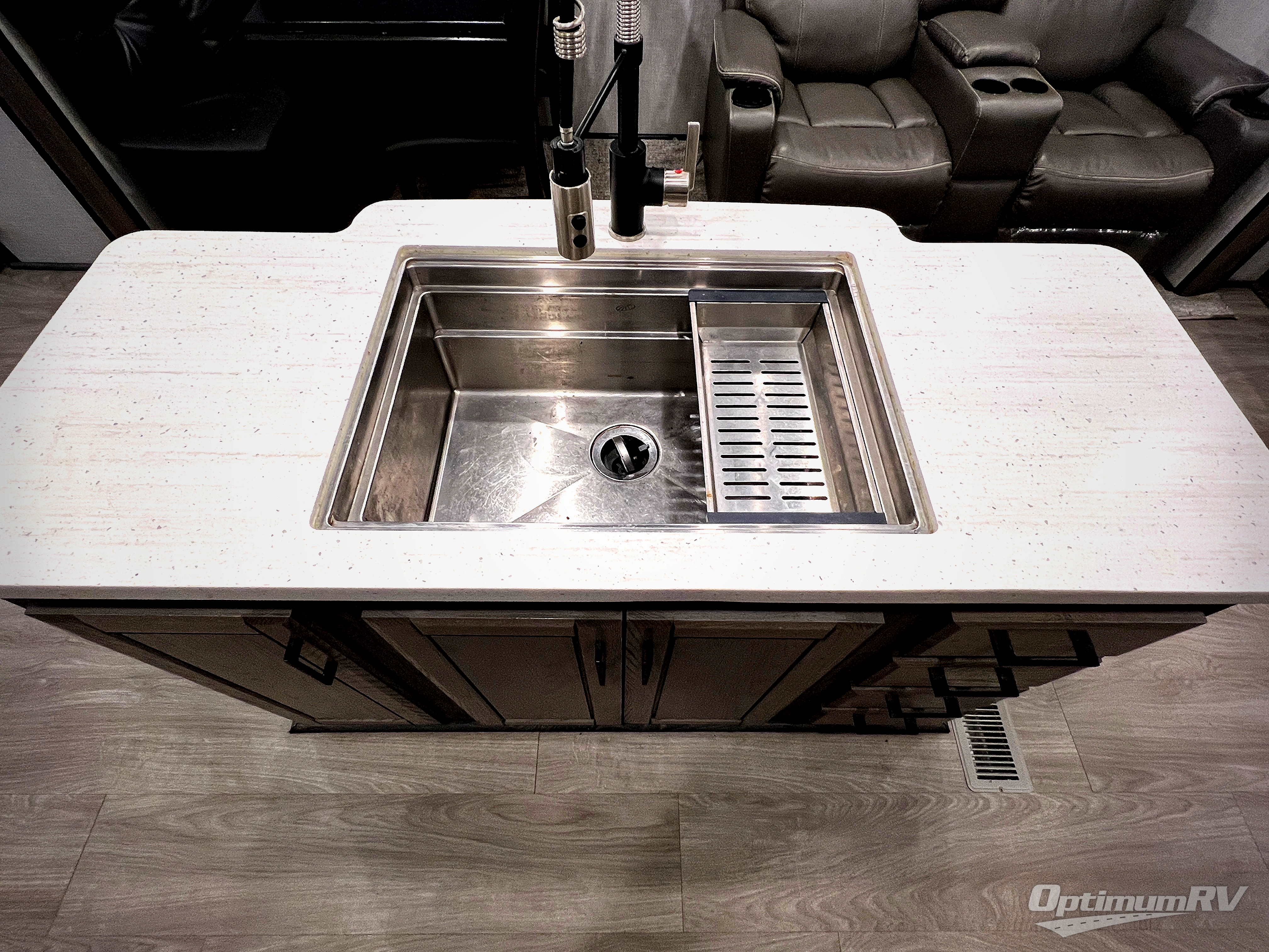 With two bedrooms, everyone will have their own comfortable place to sleep in this fifth wheel! The front private bedroom has a king bed slide, a dresser base with a fireplace and 39" TV, a bench seat, and a front closet that is prepped to add an optional washer and dryer. The second bedroom has a tri-fold sofa, a dresser, a wardrobe, and overhead cabinets, plus a loft above it all for storage or sleeping. Prepare your best home cooked meals with the Furrion kitchen collection and the kitchen island then enjoy them at the dinette. There is even an outside kitchen with a refrigerator, a sink, and a two burner cooktop to breathe in some fresh air while you cook and stay protected by the 18' power awning. Relax in true comfort each night on either the rear tri-fold sofa or the power theater seating across from the entertainment center with a fireplace and a 50" TV.