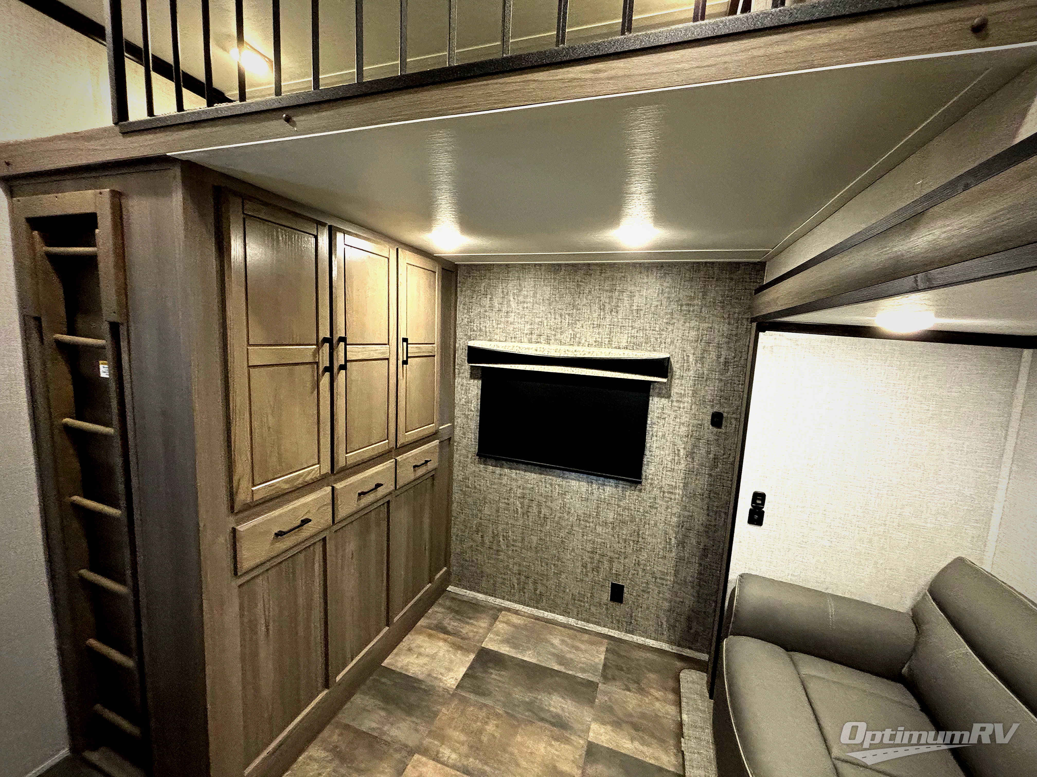 With dual entry doors, everyone can easily access this fifth wheel! One of the entrances leads directly into the half bathroom attached to the rear bedroom which has a tri-fold sofa slide and wardrobe below a 54" x 74" loft bunk matt. The chef can prepare their best home cooked meals either indoors with the Furrion kitchen collection and the kitchen island or at the outside kitchen with a refrigerator and griddle. Enjoy your meals together at the dinette with two chairs on one side and bench seating on the other side. The dual entry bathroom has a 48" shower with a seat to freshen up in each morning and a dual sink vanity for two to get ready at once, plus it enters into the front private bedroom. You will feel right at home in the bedroom with the king bed slide across from the dresser with a fireplace and 39" TV, and the front closet with a shoe shelf and an area prepped to add an optional washer and dryer!