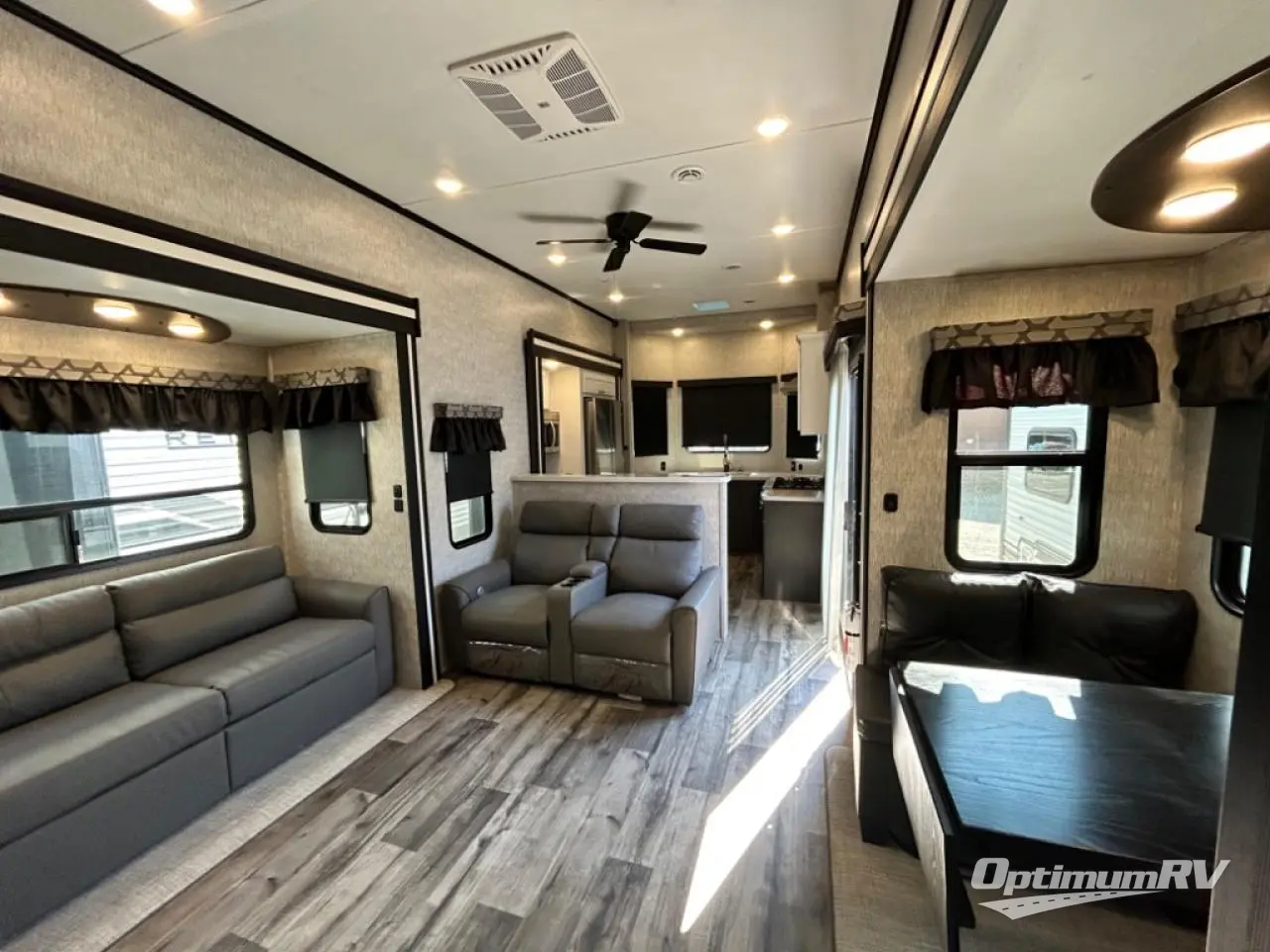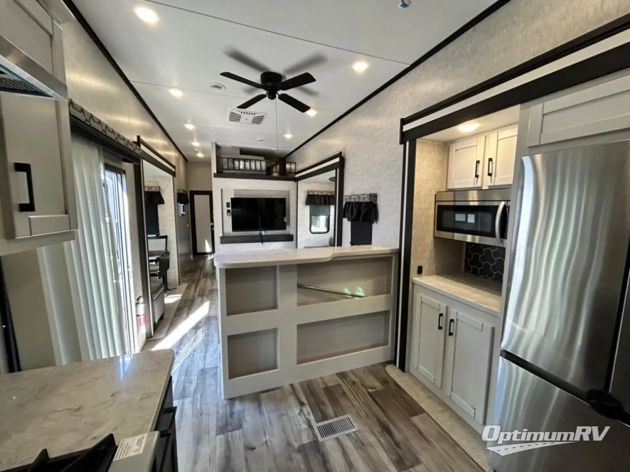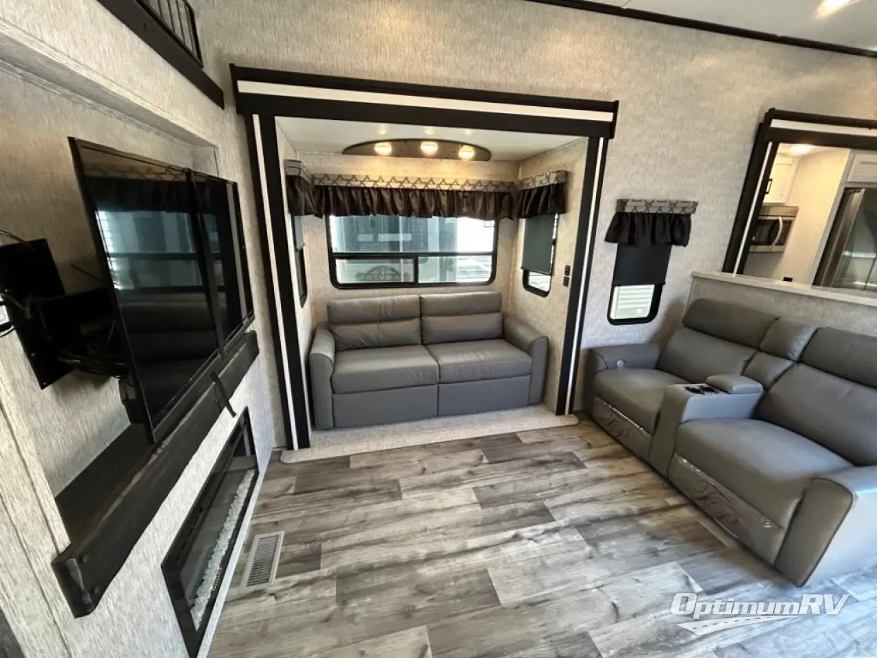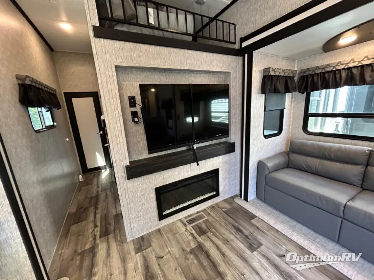 Are you looking for a destination trailer that can fit your whole crew? Look no further than this unit with four slides, three bunk mats in the loft areas, plus a spacious full bath that will allow everyone to stay clean each day. The front kitchen is any chef's dream with its ample counter space, pantry/cabinet, Insignia four burner cooktop, and residential refrigerator. After dinner is cleaned up, everyone can meet in the middle living area to watch a movie on the 50" TV, and the fireplace here will make it feel more like home.