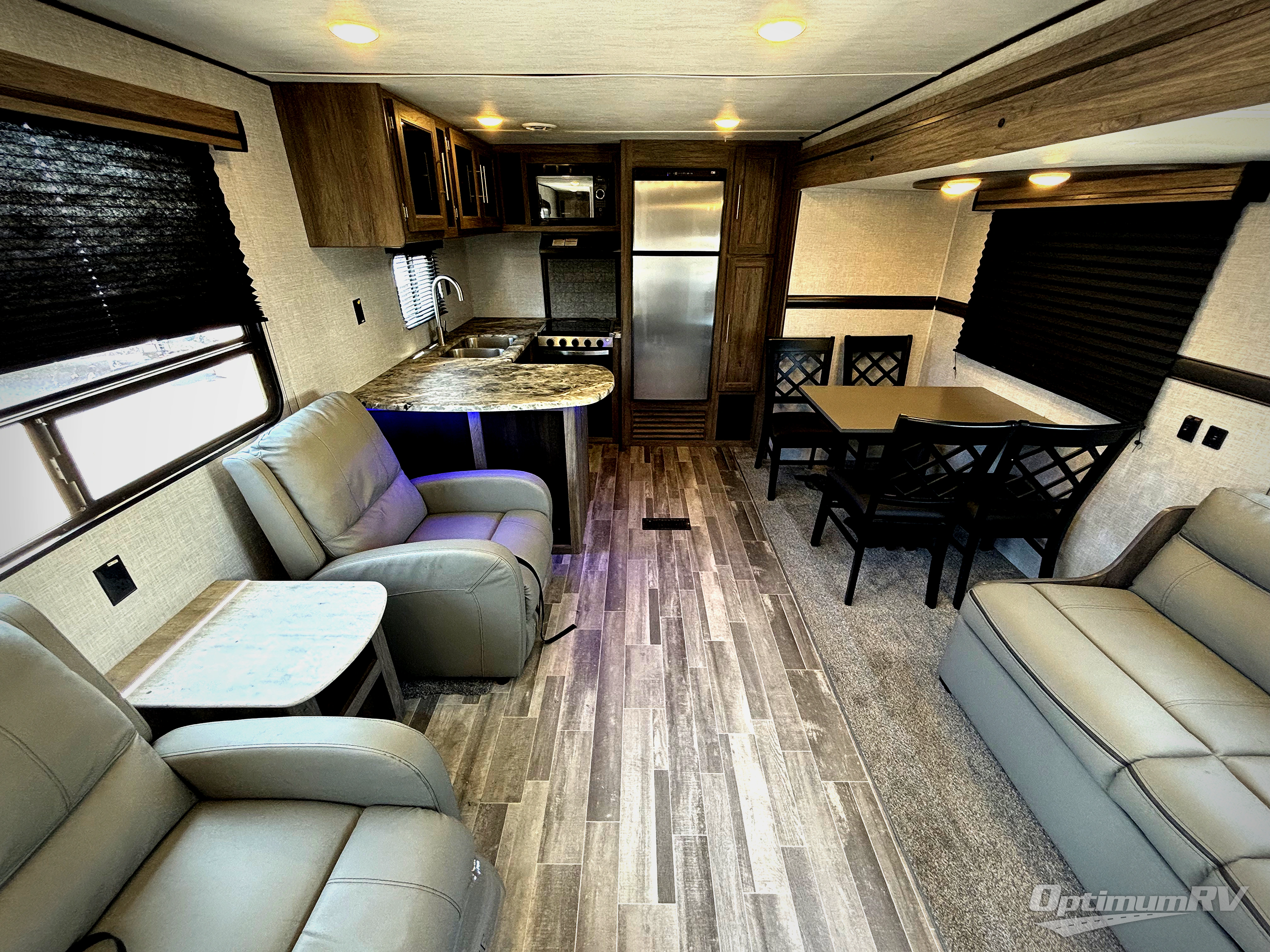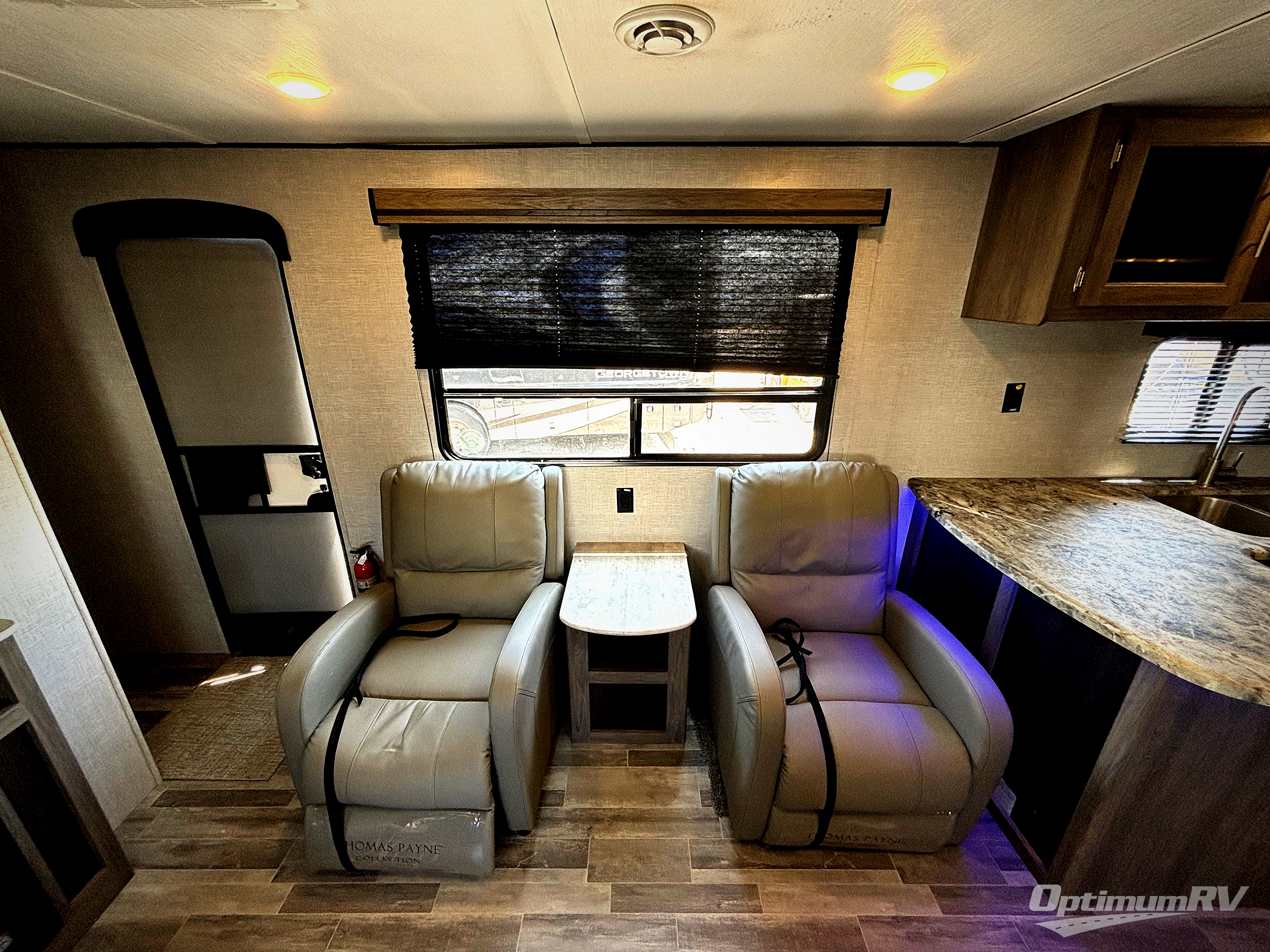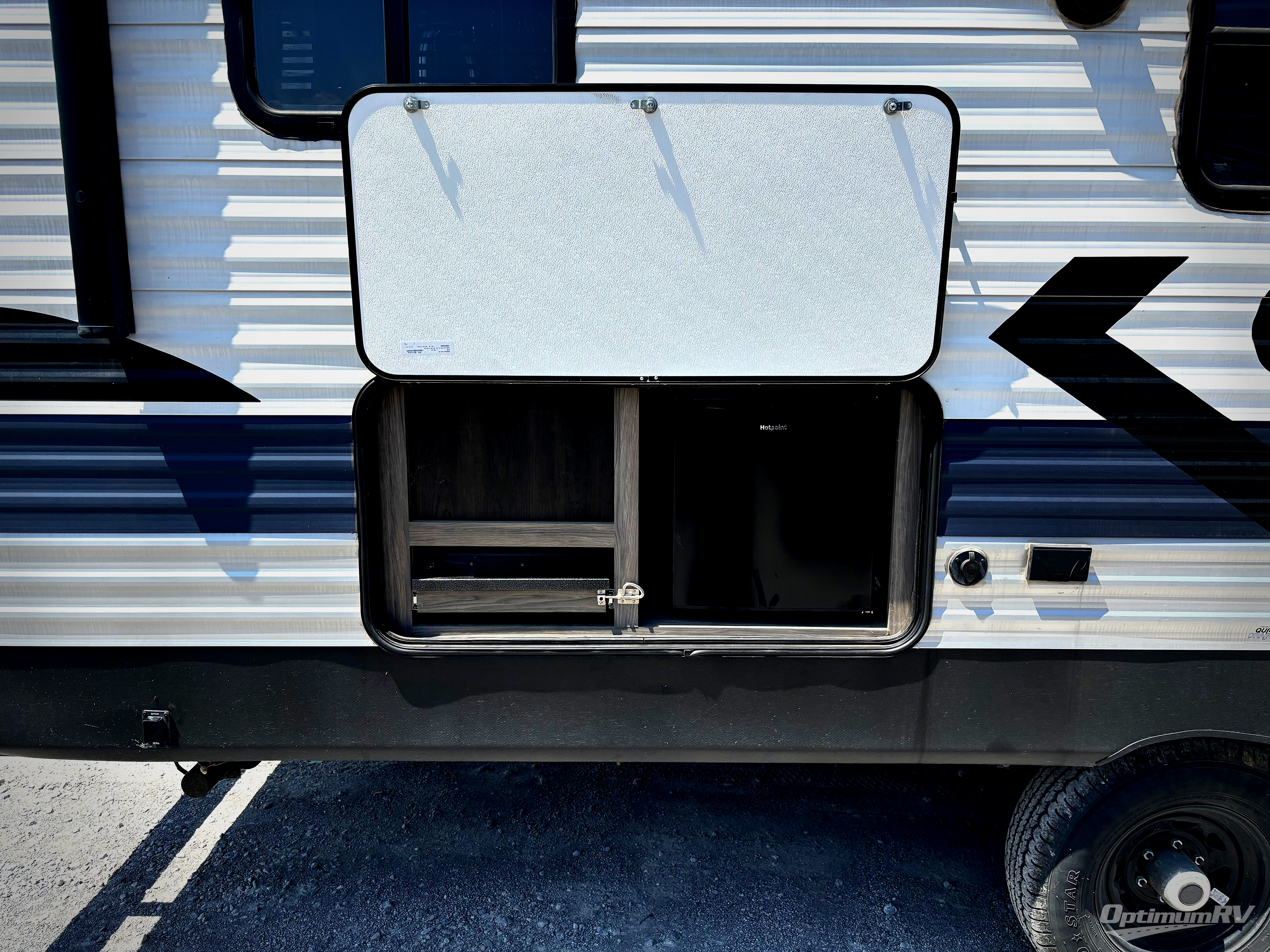 The chef of your group will love cooking in this rear kitchen travel trailer! It not only features a 10-cu. ft. refrigerator, an oven with an LED glass top, and a pressed countertop with a sink cover, but also a stainless steel sink with a stainless steel high-rise faucet and lots of counter space to prep your meals. While the chef is preparing dinner, you can socialize at the U-shaped dinette or 60" jackknife sofa slide while two others sit in the chairs with an end table in between to set a cup of coffee. There is even an outside kitchen, so you can take the fun outdoors while still cooking dinner. The full bathroom has a 34" radius shower with a linen closet next to it for you to grab a towel without dripping water all over the place. Head to the front private bedroom and grab your pajamas from one of the two shirt closets or even from the overhead cabinets above the 60" x 74" RV queen bed!