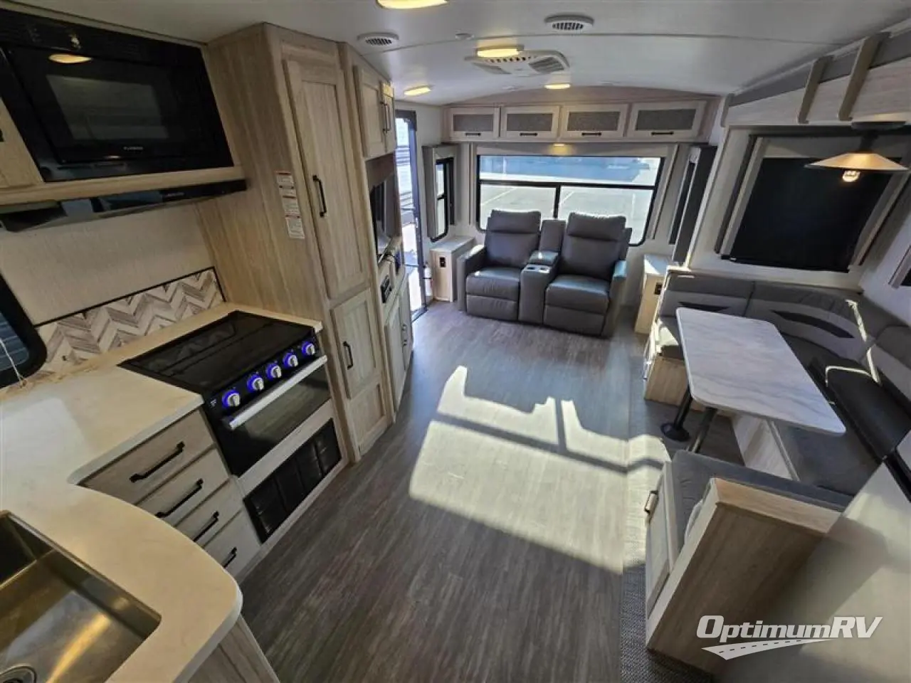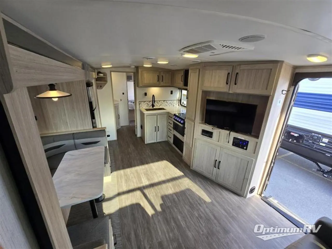 There is much to love about this travel trailer! From the dual entry doors to the rear residential tri-fold sofa by the entertainment center with a 40" HD LED TV to watch your favorite movies at night. The U-shaped dinette also has a view of the entertainment center so you can enjoy a meal prepared with the three burner cooktop while watching a movie too. The walk-through bathroom has a shower to freshen up in and a linen closet to keep your towels close by, plus it leads directly into the front private bedroom. Inside the bedroom is a king bed with a Serta Comfort mattress that has wardrobes on either side to keep your clothes looking nice and it even has an entrance/exit door to the unit for an early morning fishing trip without waking any one up!