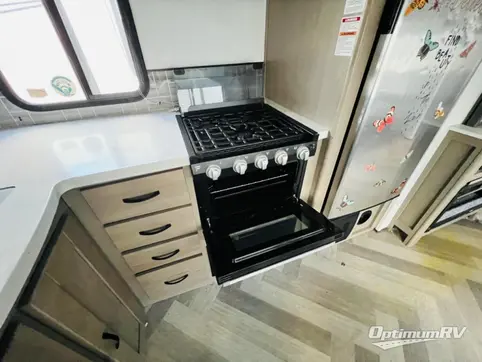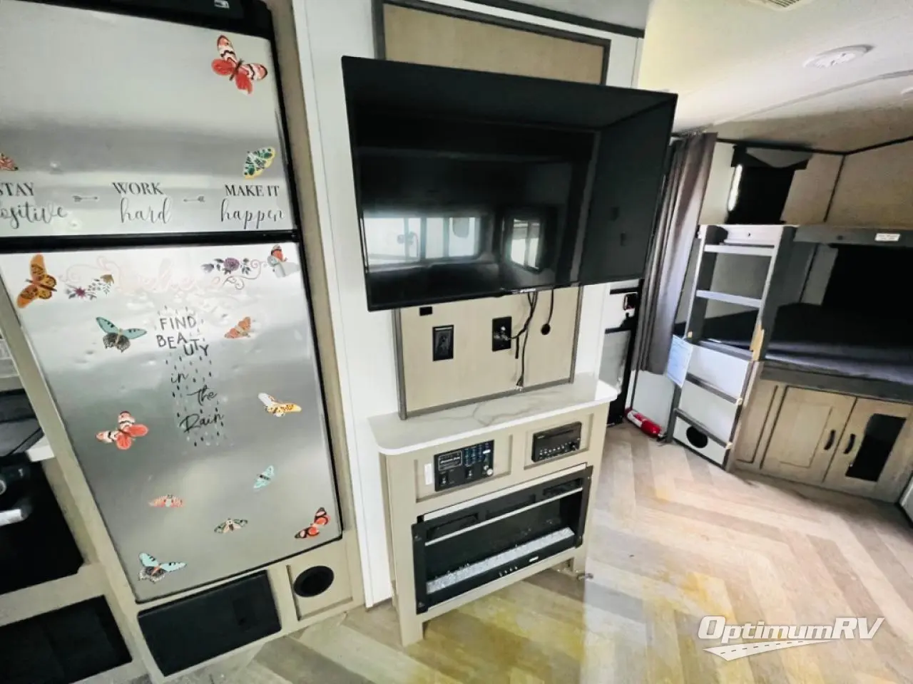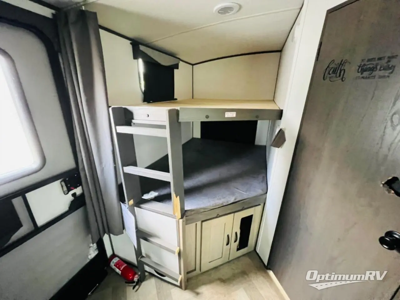 The kiddos will love having a set of double bunk beds to sleep on at night in this travel trailer! They can even invite a friend or two to tag along and sleep on the residential tri-fold sofa or dream dinette once they are converted. The dinette also has hidden seat storage for your needs, plus there is a walk-in pantry big enough to store everyone's favorite snacks. The chef can prepare their best meals either indoors with the three burner cooktop or head to the outdoor kitchen and fry the catch of the day on the two burner cooktop while staying protected by the 20' power awning with LED lights. Enjoy a good night's rest each night on the king bed with a Serta Comfort mattress in the front private bedroom!