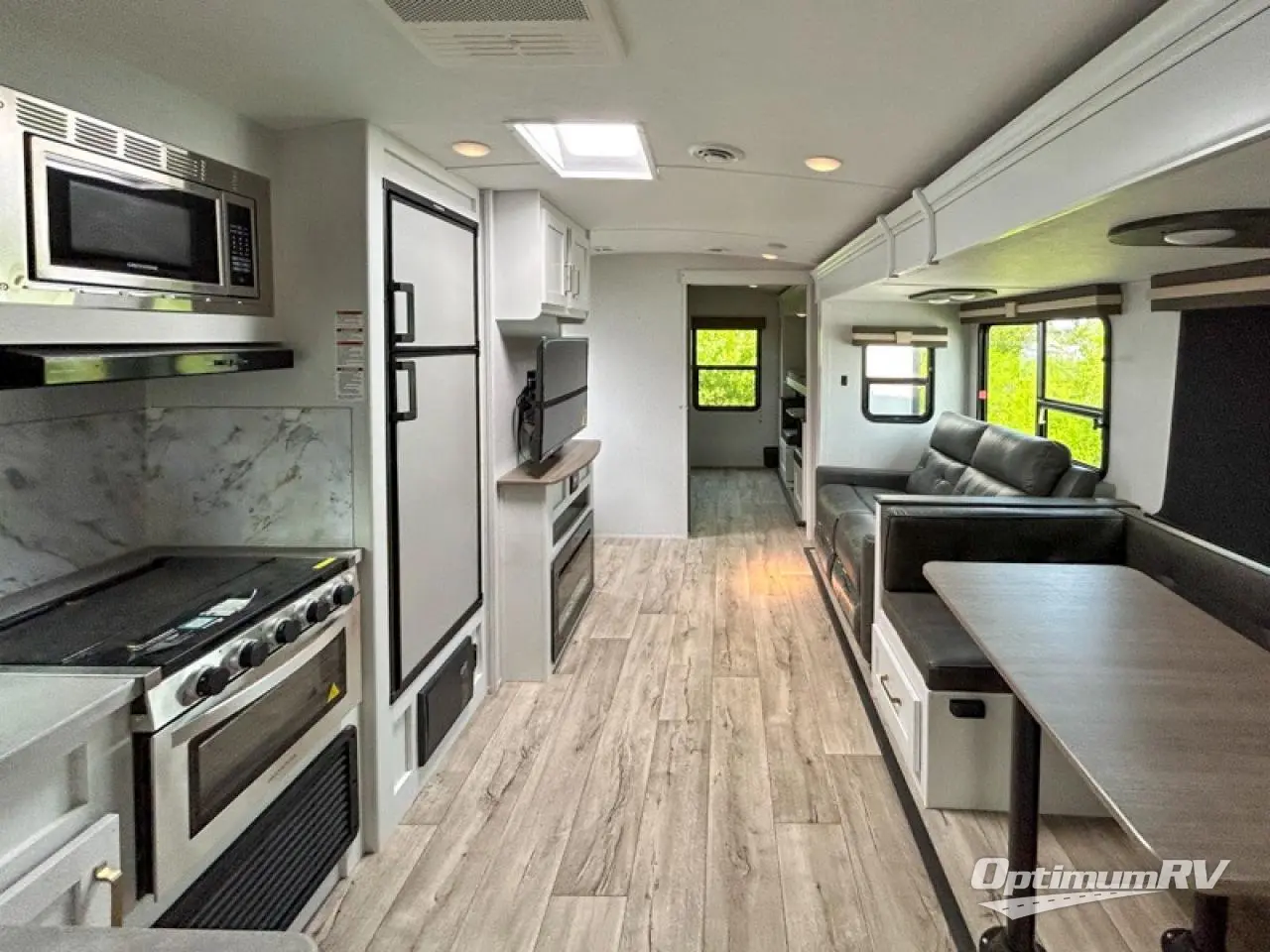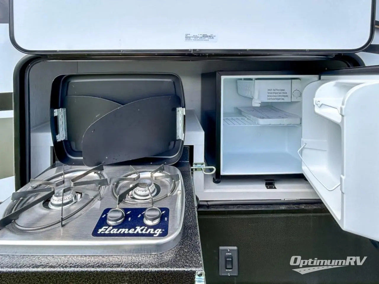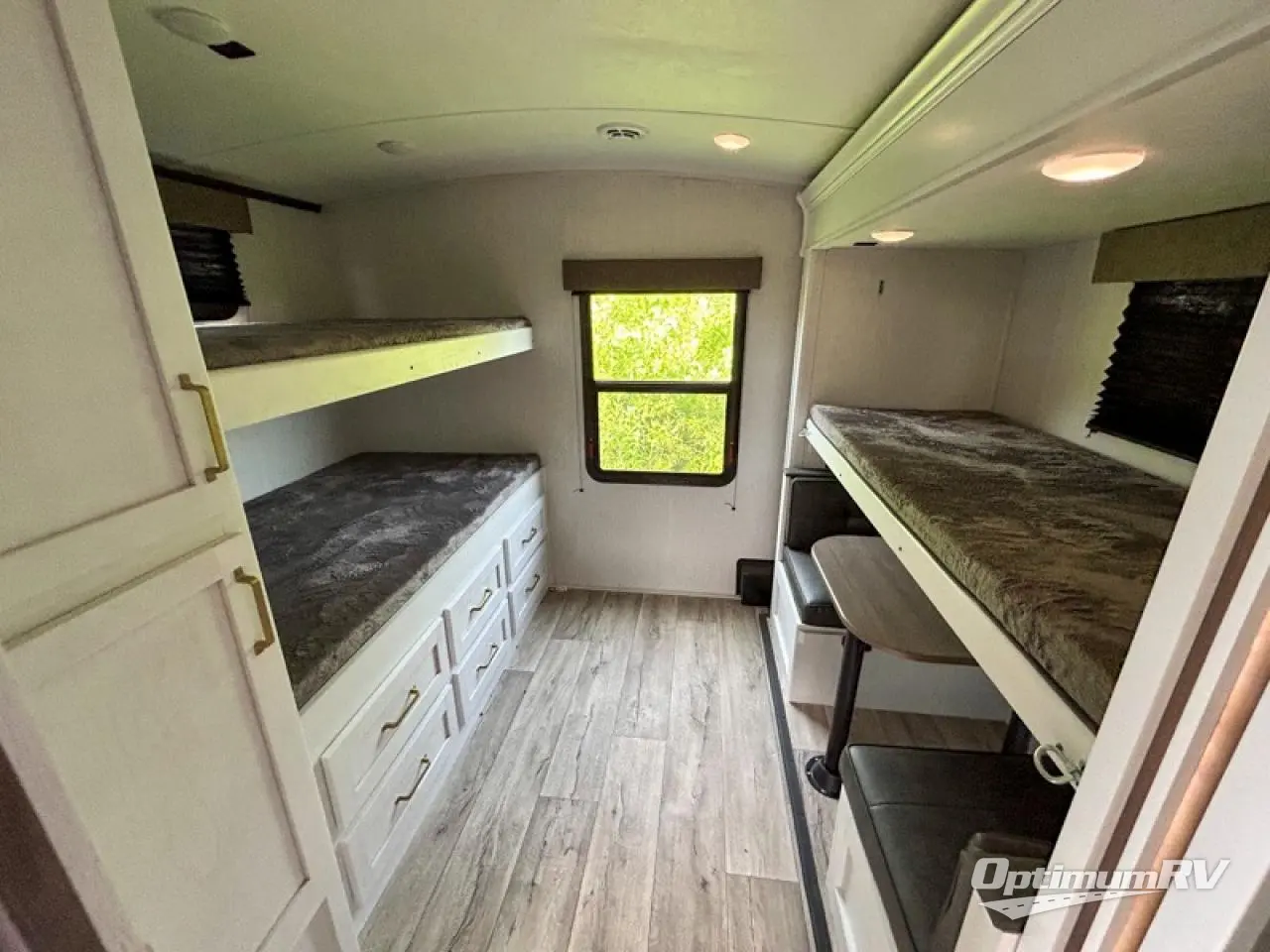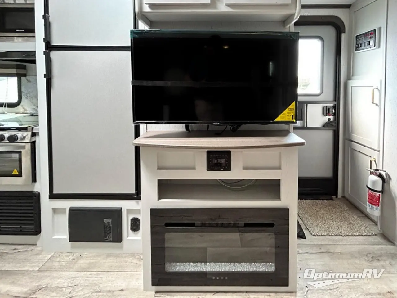 There are plenty of sleeping spaces for everyone in this travel trailer! From the rear private bunkhouse with a set of bunk beds along one side and a bunk bed above a sofa on the other to the front private bedroom with a king bed. You can even transform the tri-fold sofa and U-shaped dinette slide into extra sleeping spaces if needed. The walk-through bathroom has everything you will need to freshen up each morning. The chef will love cooking indoors with the glass top three burner cooktop with a 17" oven, yet may love cooking at the outdoor kitchen even more. Grab a snack from the walk-in pantry behind the entertainment center and watch your favorite movie on the 40" LED TV while a fire roars in the 30" glass fireplace!