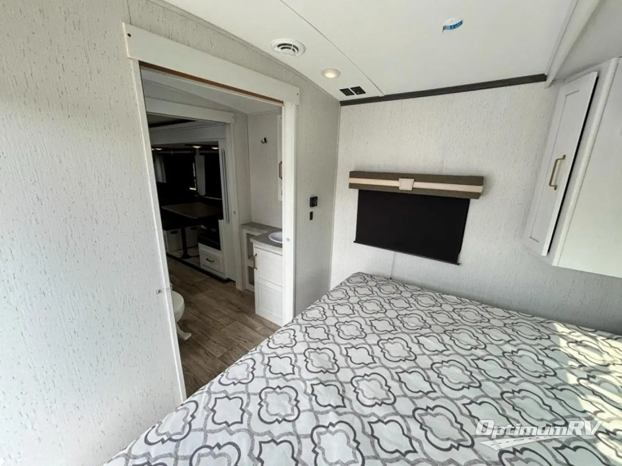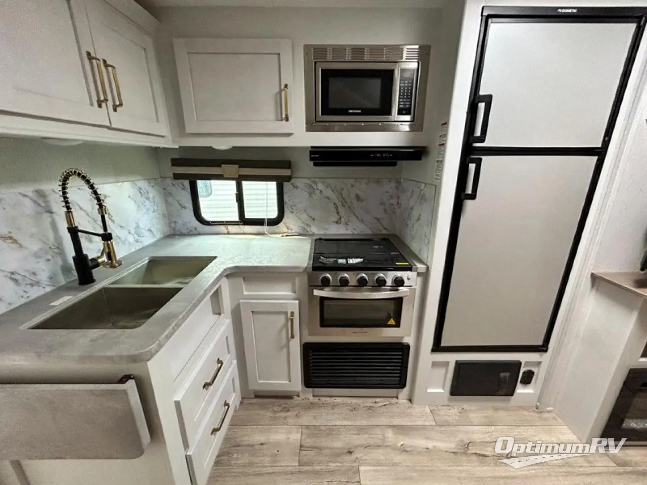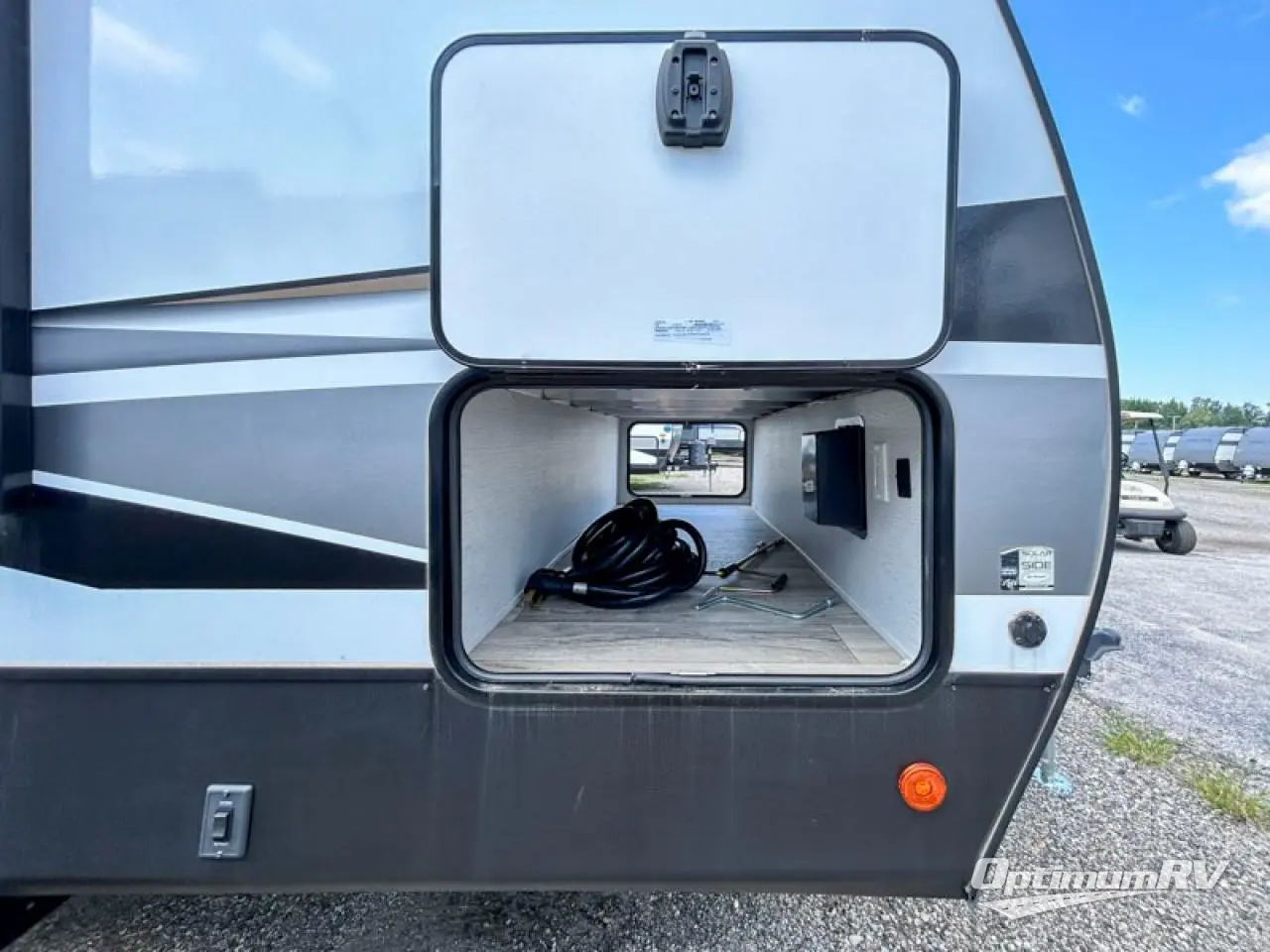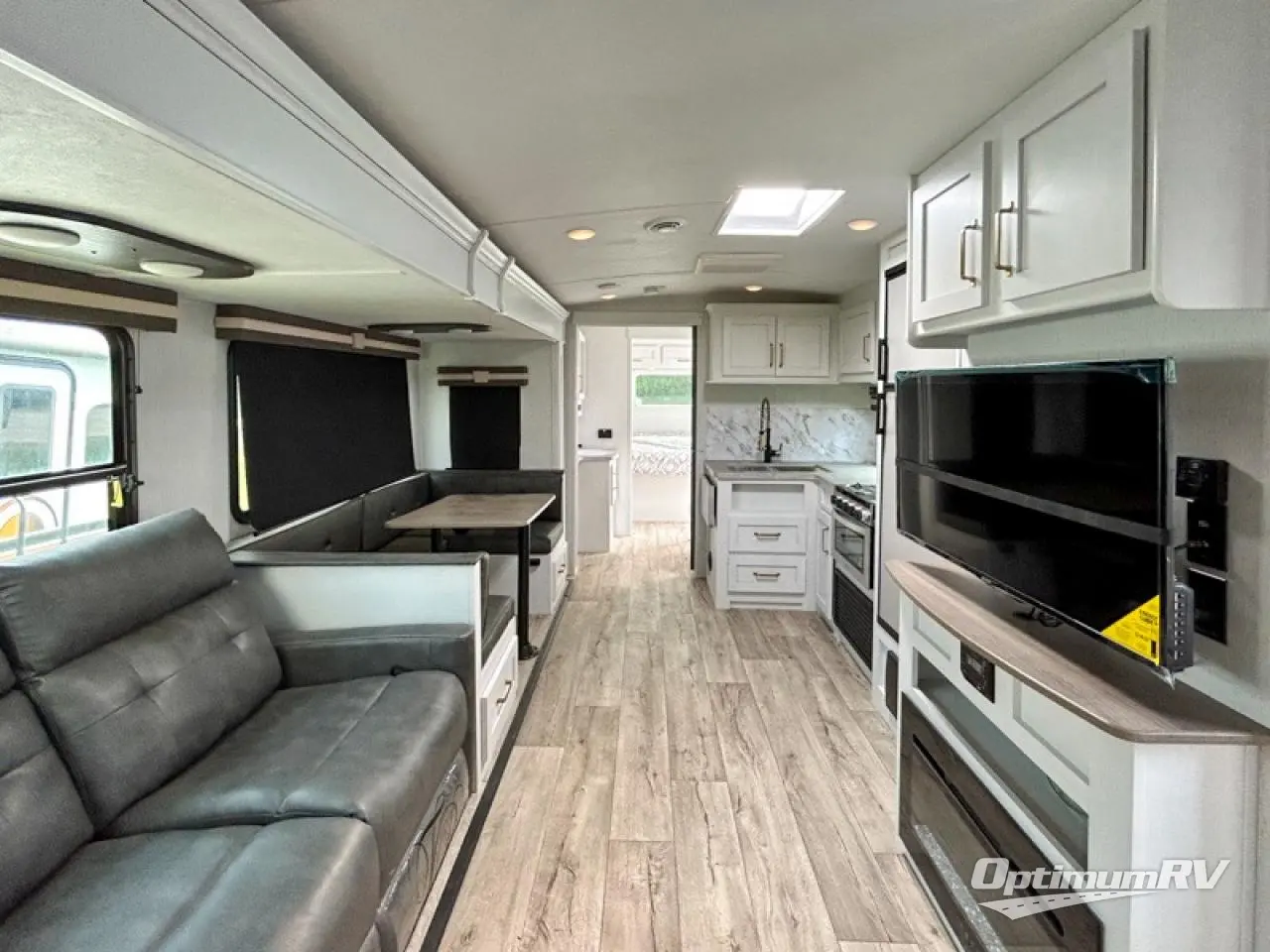 There are plenty of sleeping spaces for everyone in this travel trailer! From the rear private bunkhouse with a set of bunk beds along one side and a bunk bed above a sofa on the other to the front private bedroom with a king bed. You can even transform the tri-fold sofa and U-shaped dinette slide into extra sleeping spaces if needed. The walk-through bathroom has everything you will need to freshen up each morning. The chef will love cooking indoors with the glass top three burner cooktop with a 17" oven, yet may love cooking at the outdoor kitchen even more. Grab a snack from the walk-in pantry behind the entertainment center and watch your favorite movie on the 40" LED TV while a fire roars in the 30" glass fireplace!