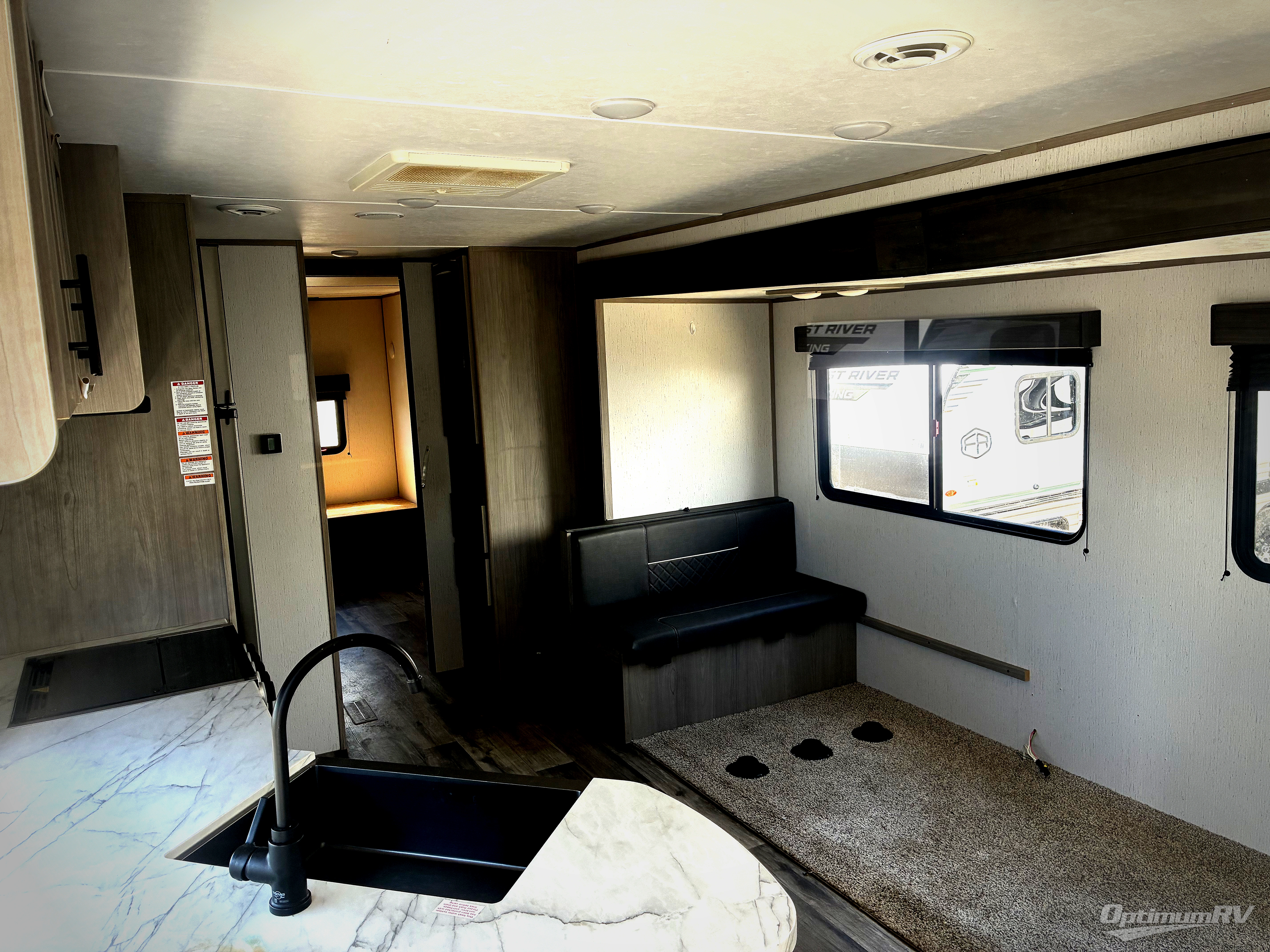 Spacious, inviting and comfortable, this trailer offers it all! You and your group will love the rear bunkhouse with four bunk beds, a slide out giving you more floor space, and privacy when you close the door. And there is a full bathroom just outside the bunkhouse for convenience and easy access when in the main area. You and another can sleep on the opposite side of the trailer in the front bedroom on a queen bed with access from each side and your own clothing storage. The cook will enjoy having a farm style sink with high rise faucet, and full amenities including a 10 cu. ft. refrigerator to store leftovers. There are many more features to enjoy such as the power tongue jack when setting up, the pass-through compartment for your larger outdoor gear, the outside shower to rinse off the dirt from your shoes, and the USB ports for all the electronics.