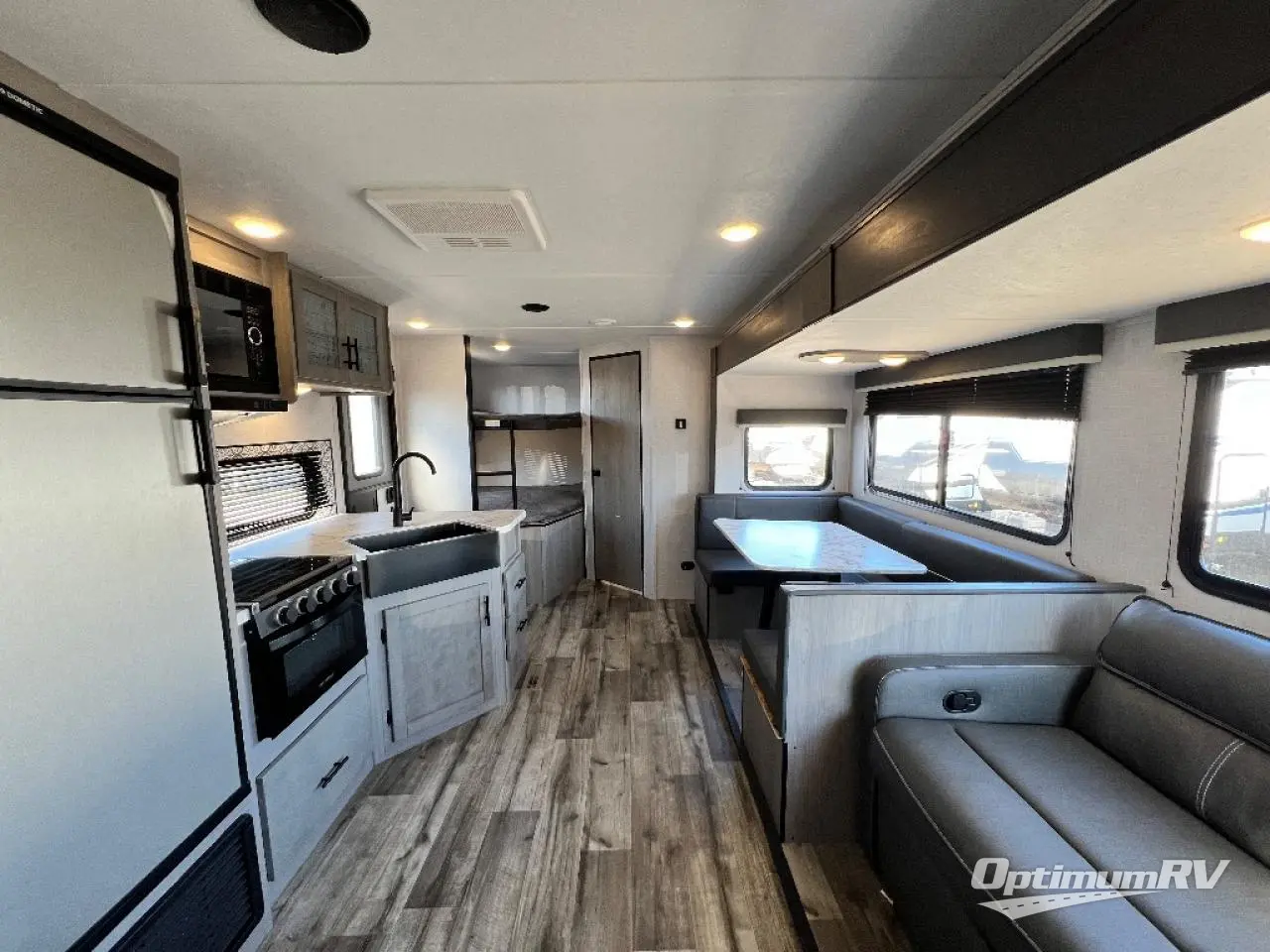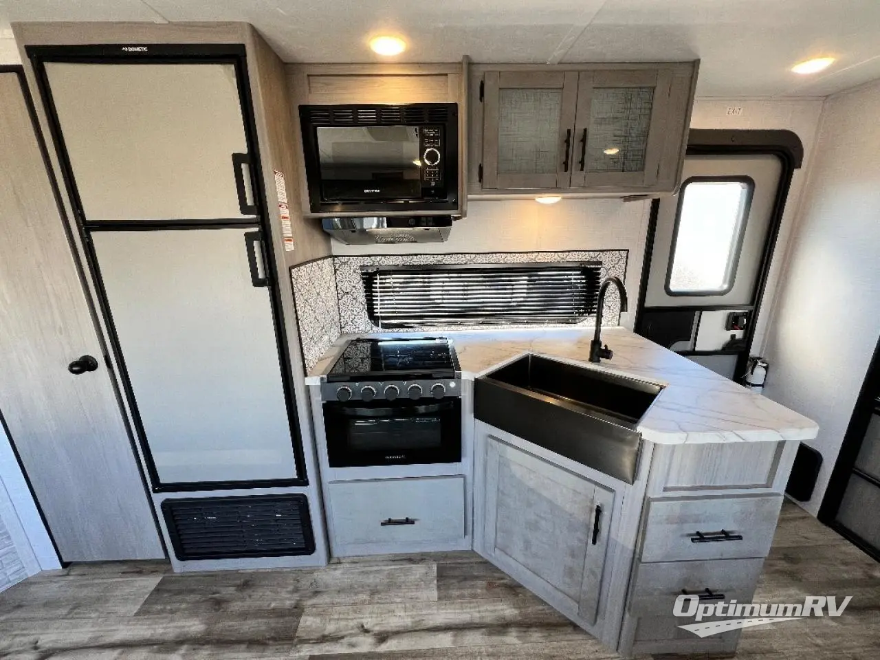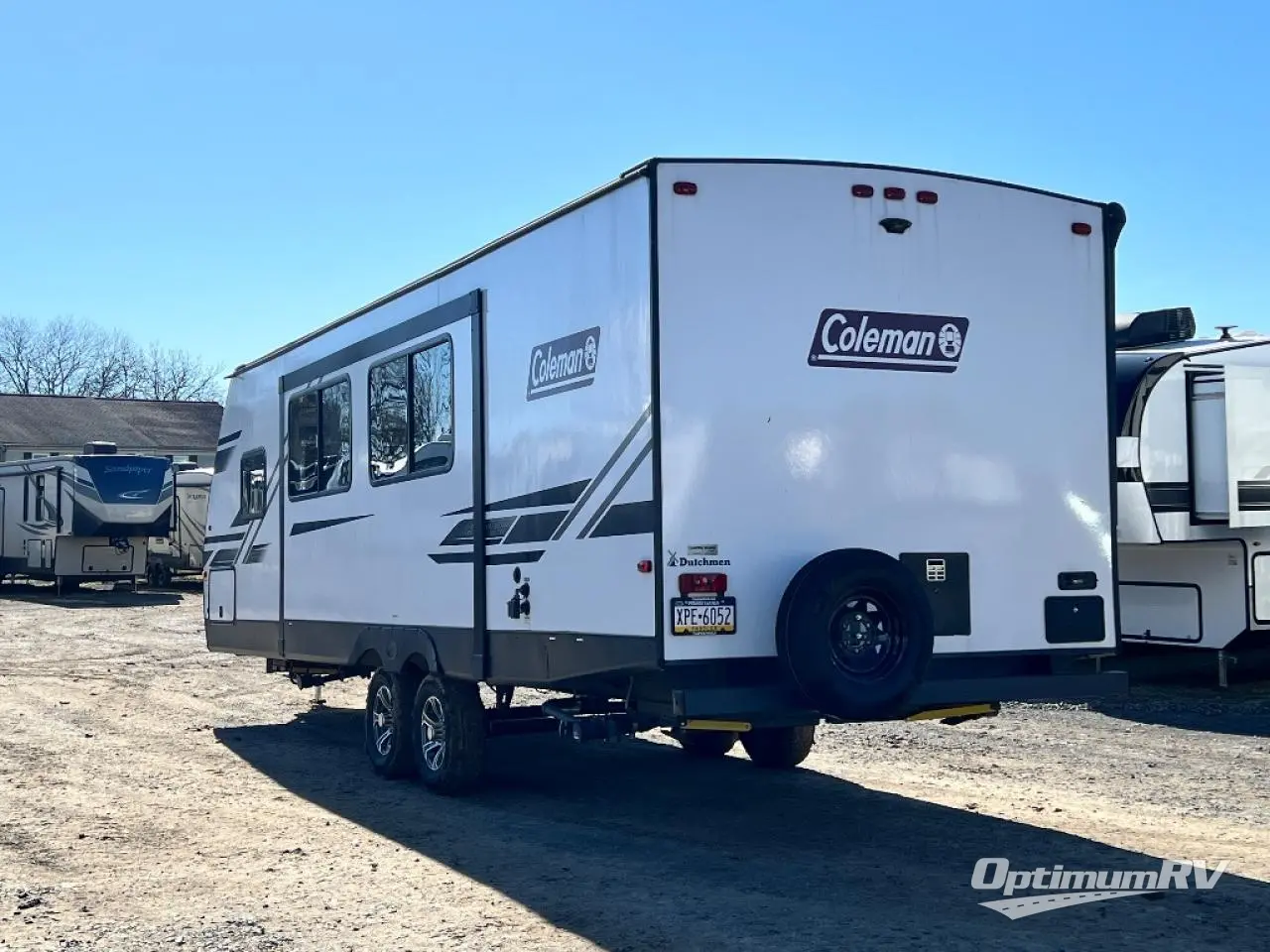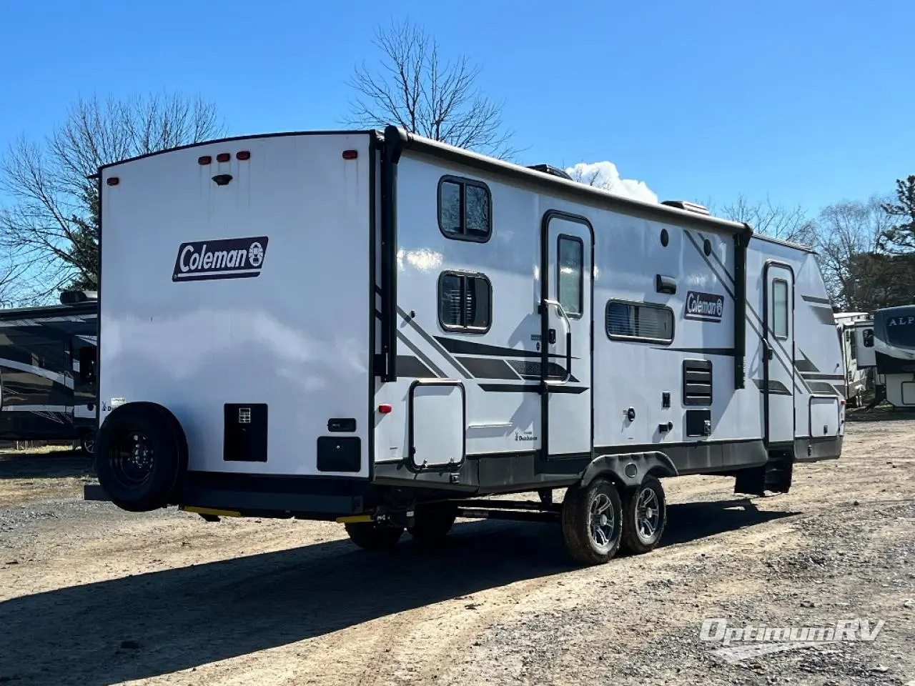 The Dutchmen Coleman Light travel trailer features an upgraded kitchen package with residential appliances, high-rise faucets, and a stainless steel farm-style sink. The fully enclosed underbelly allows all of your trailer's vital functions to be kept out of the freezing cold, and you'll have great stability as you enter your trailer by using the solid entry steps. Each model includes power stabilizer jacks, a power tongue jack, dual 20-LB propane tanks, a residential queen bed, and preparations for Wi-Fi 4G LTE. There is an aerodynamic front fiberglass cap, exterior speakers, solar charging connection, and aluminum wheels.