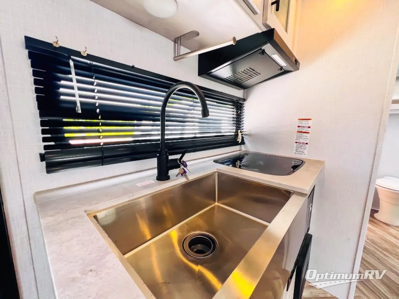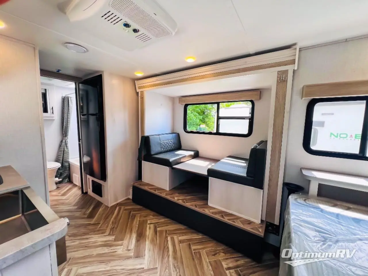 With a set of bunk beds, the whole family or friend gang can camp together in this travel trailer! And you will appreciate having a front queen bed to lay your head on at night. The two burner range is just waiting for you to prepare a delicious meal and the booth dinette is a great place to enjoy it at, plus it can be used as an extra sleeping space. The rear corner bathroom has a shower with a skylight above for added natural lighting as you get ready each morning!