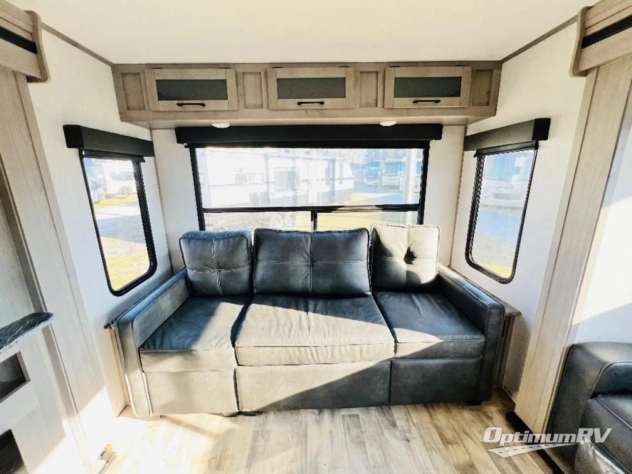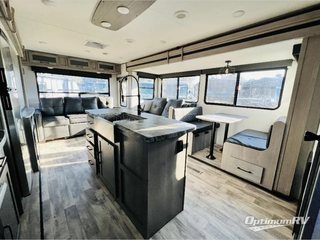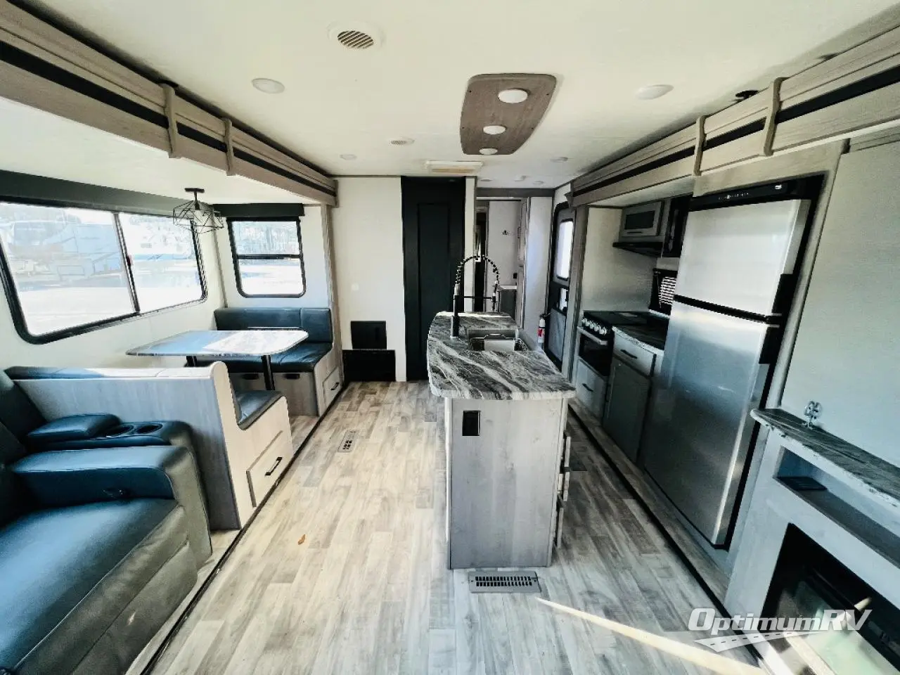 You will feel right at home in this spacious travel trailer that can sleep five people each night. The kitchen island includes a farm style sink, a three burner cooktop, plus a 10 cu. ft. refrigerator for perishables. There is also an outside kitchen, which will make the outdoor cook very happy! The pass-through storage will be perfect for bringing along fishing poles or hiking gear, and there is a 20' power awning with LED lights if you enjoy relaxing outdoors in the evenings. Get cleaned up in the walk-through bath before heading off to the front master bedroom each night. You'll love the slide out king bed, the bedroom fireplace, and the front bench seat to read a book or two!