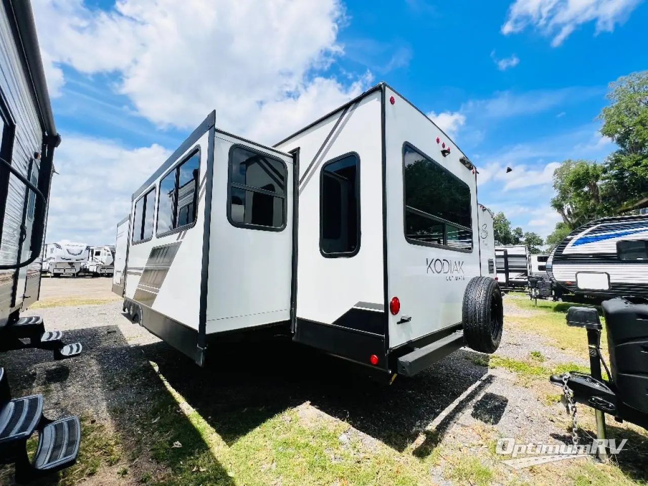 Each Kodiak Ultimate travel trailer by Dutchmen is constructed with a laminated crowned roof, a gel coat high gloss fiberglass exterior, and diamond plate front rock guard to protect your RV from rock and debris on the way to the campground. The hybrid aluminum entry steps are not only dependably, but they collapse and expand quickly so you can get on the road in no-time! These models feature HyperDeck flooring that includes fiberglass reinforced polypropolene and a fully enclosed underbelly, and the Bear Cave storage allows you to bring along all of your hiking and fishing gear. Some of the other interior features you are sure to love are the kitchen and bath skylights, the oversized dinette windows, night shades throughout, and more. Your next adventure starts with a Kodiak Ultimate travel trailer!
