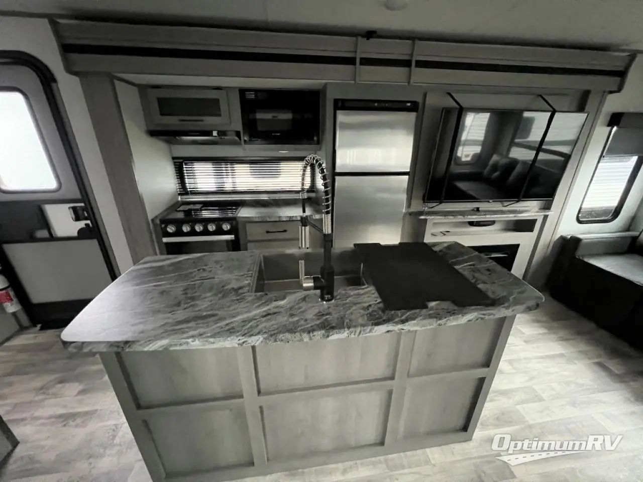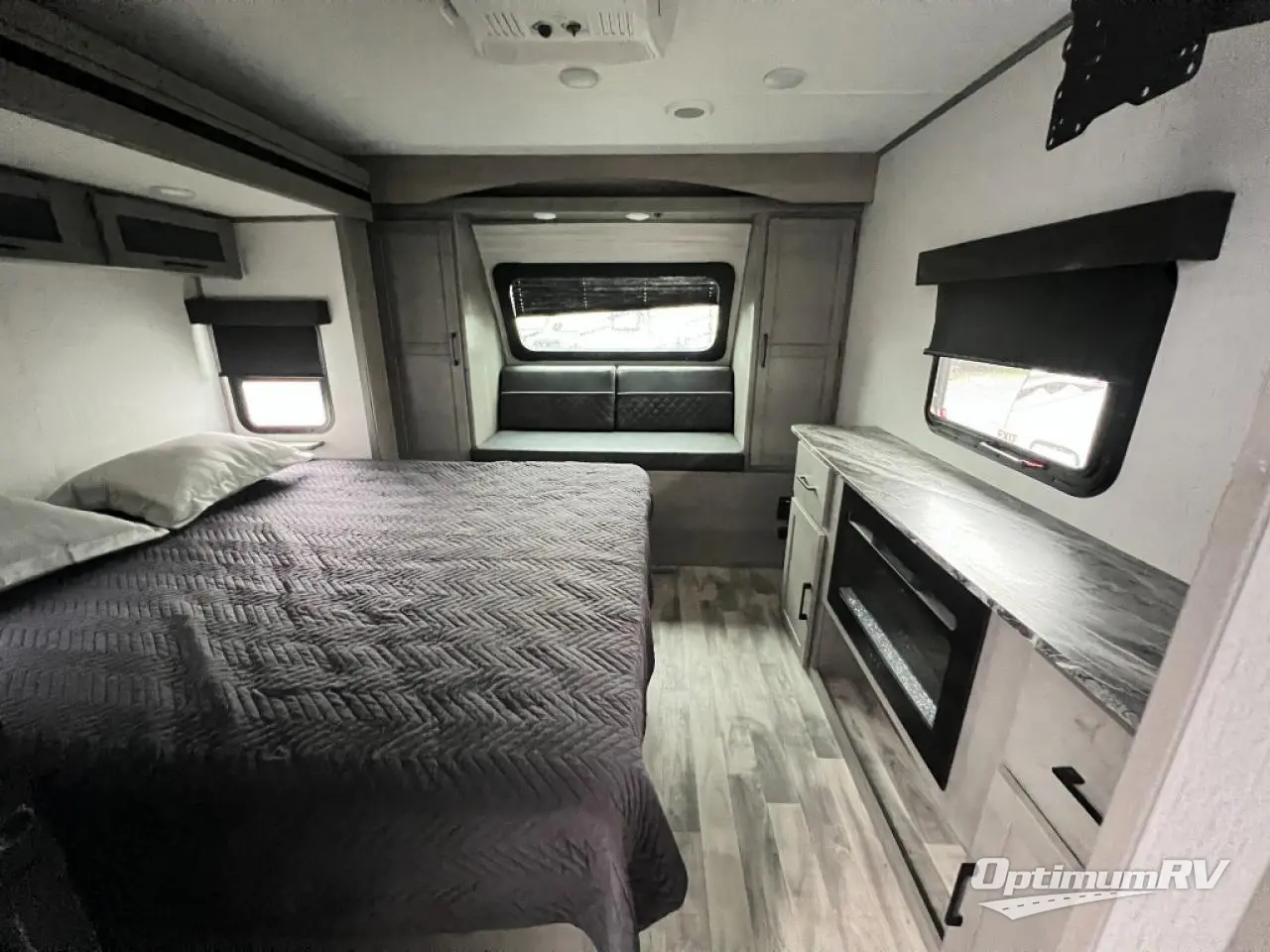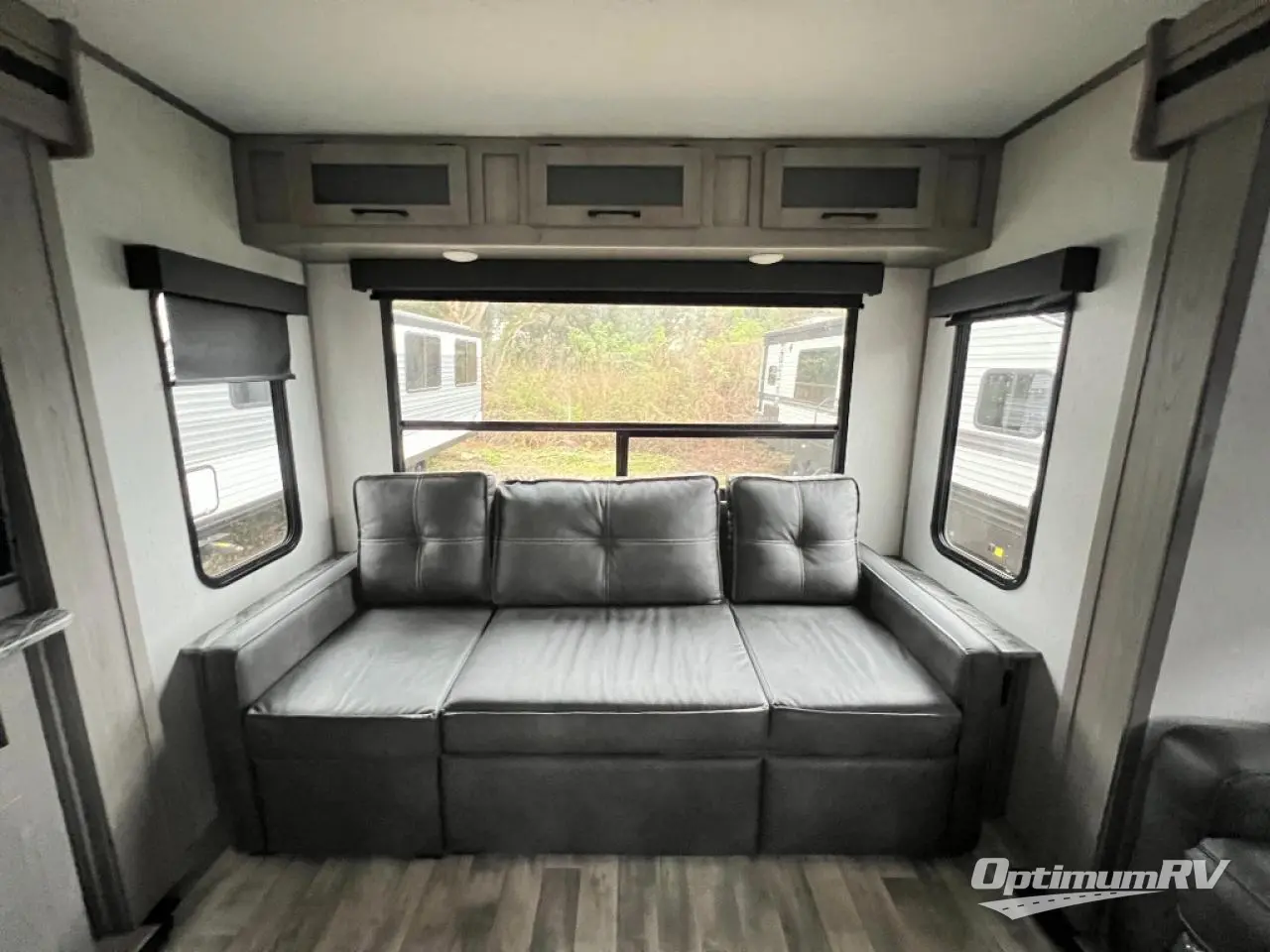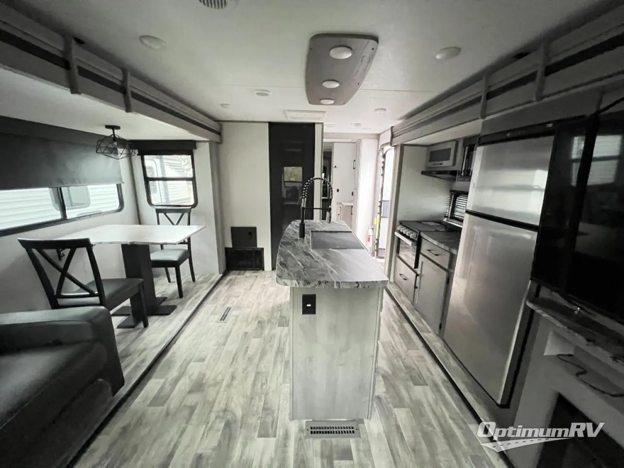 You will feel right at home in this spacious travel trailer that can sleep five people each night. The kitchen island includes a farm style sink, a three burner cooktop, plus a 10 cu. ft. refrigerator for perishables. There is also an outside kitchen, which will make the outdoor cook very happy! The pass-through storage will be perfect for bringing along fishing poles or hiking gear, and there is a 20' power awning with LED lights if you enjoy relaxing outdoors in the evenings. Get cleaned up in the walk-through bath before heading off to the front master bedroom each night. You'll love the slide out king bed, the bedroom fireplace, and the front bench seat to read a book or two!