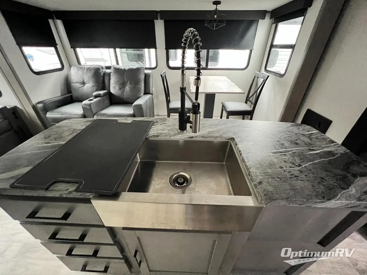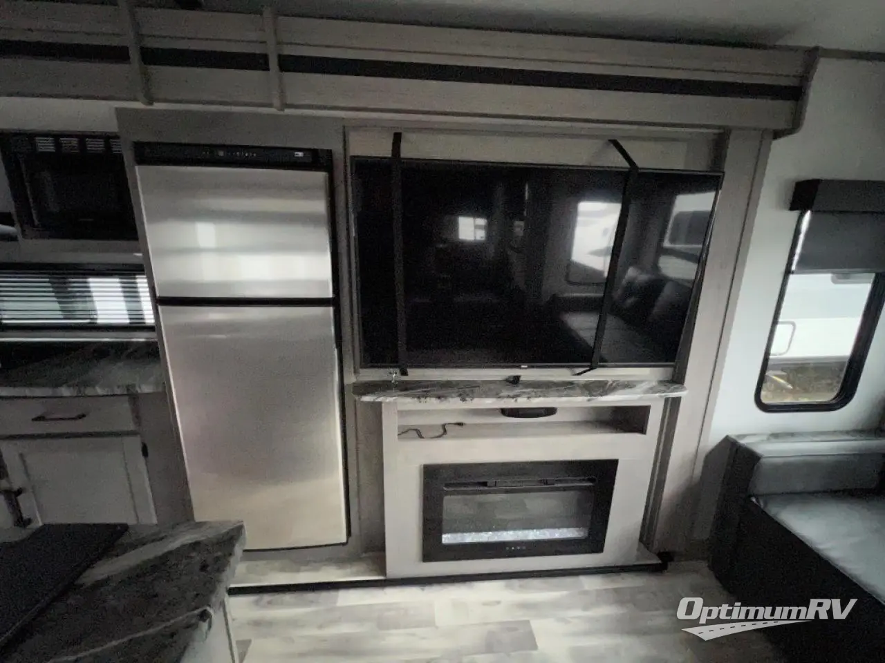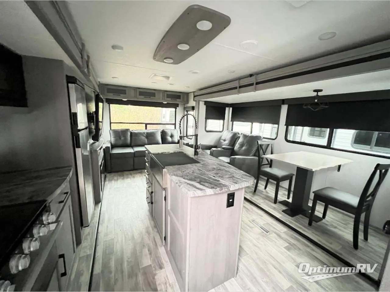 You will feel right at home in this spacious travel trailer that can sleep five people each night. The kitchen island includes a farm style sink, a three burner cooktop, plus a 10 cu. ft. refrigerator for perishables. There is also an outside kitchen, which will make the outdoor cook very happy! The pass-through storage will be perfect for bringing along fishing poles or hiking gear, and there is a 20' power awning with LED lights if you enjoy relaxing outdoors in the evenings. Get cleaned up in the walk-through bath before heading off to the front master bedroom each night. You'll love the slide out king bed, the bedroom fireplace, and the front bench seat to read a book or two!