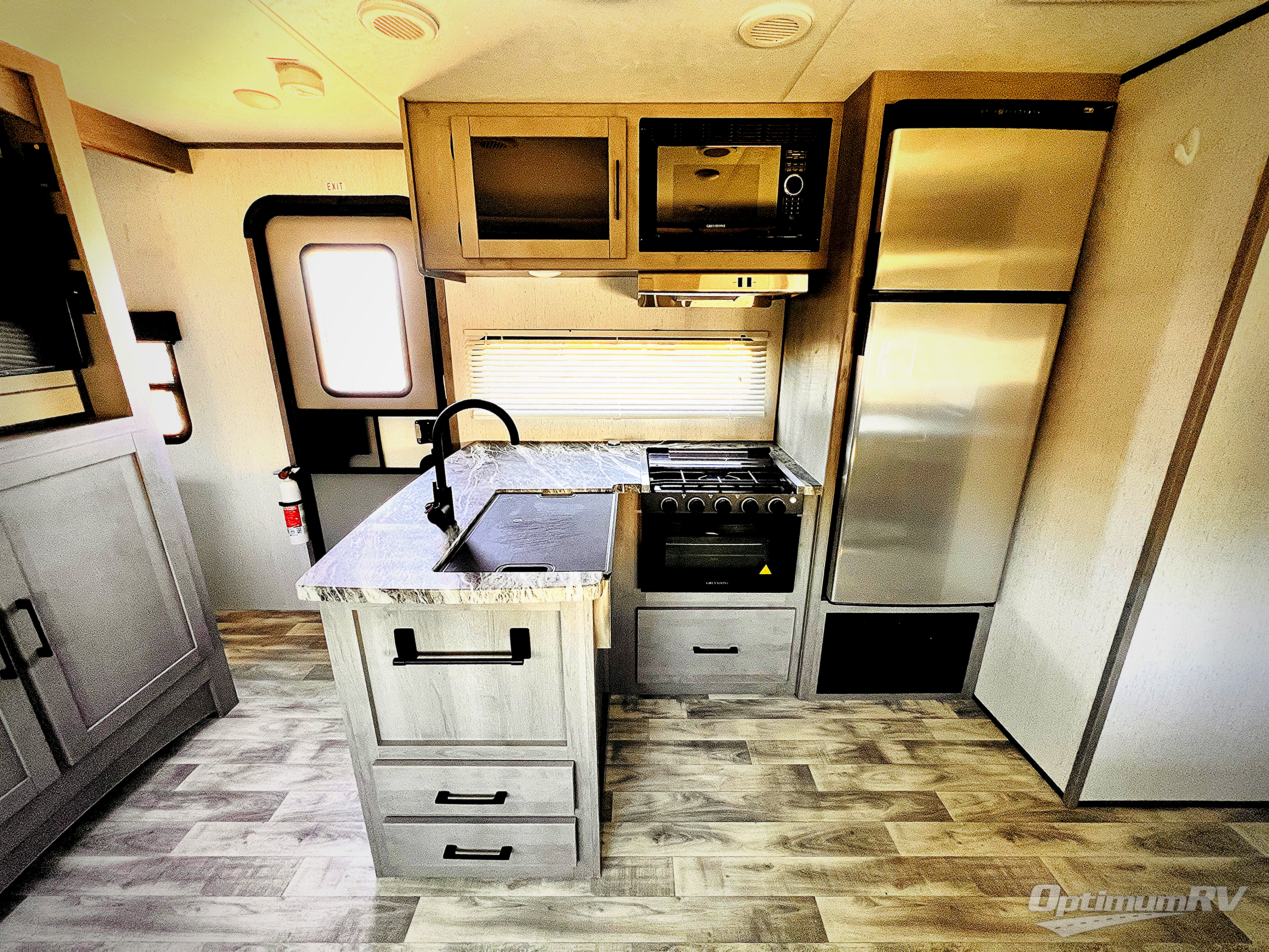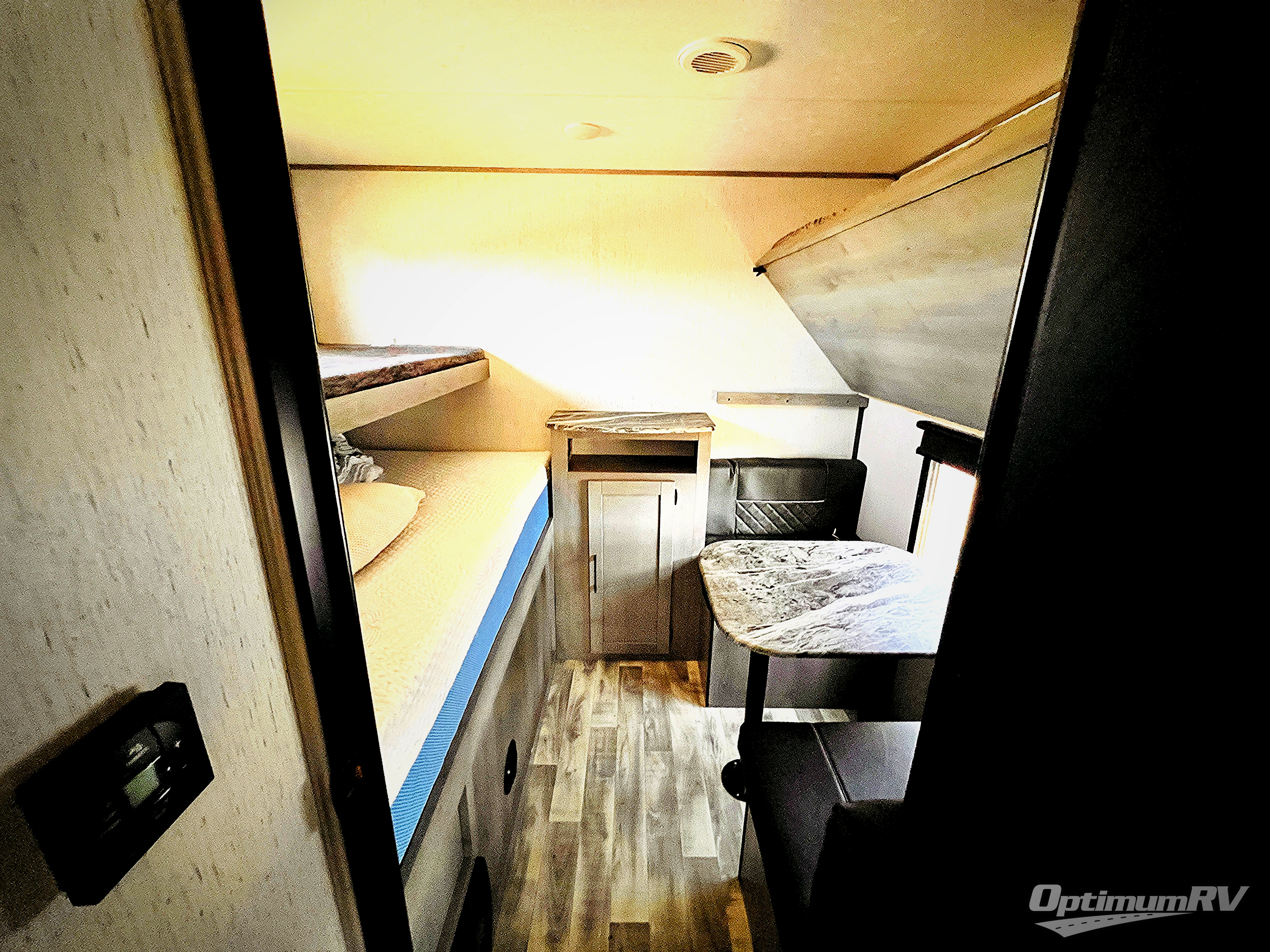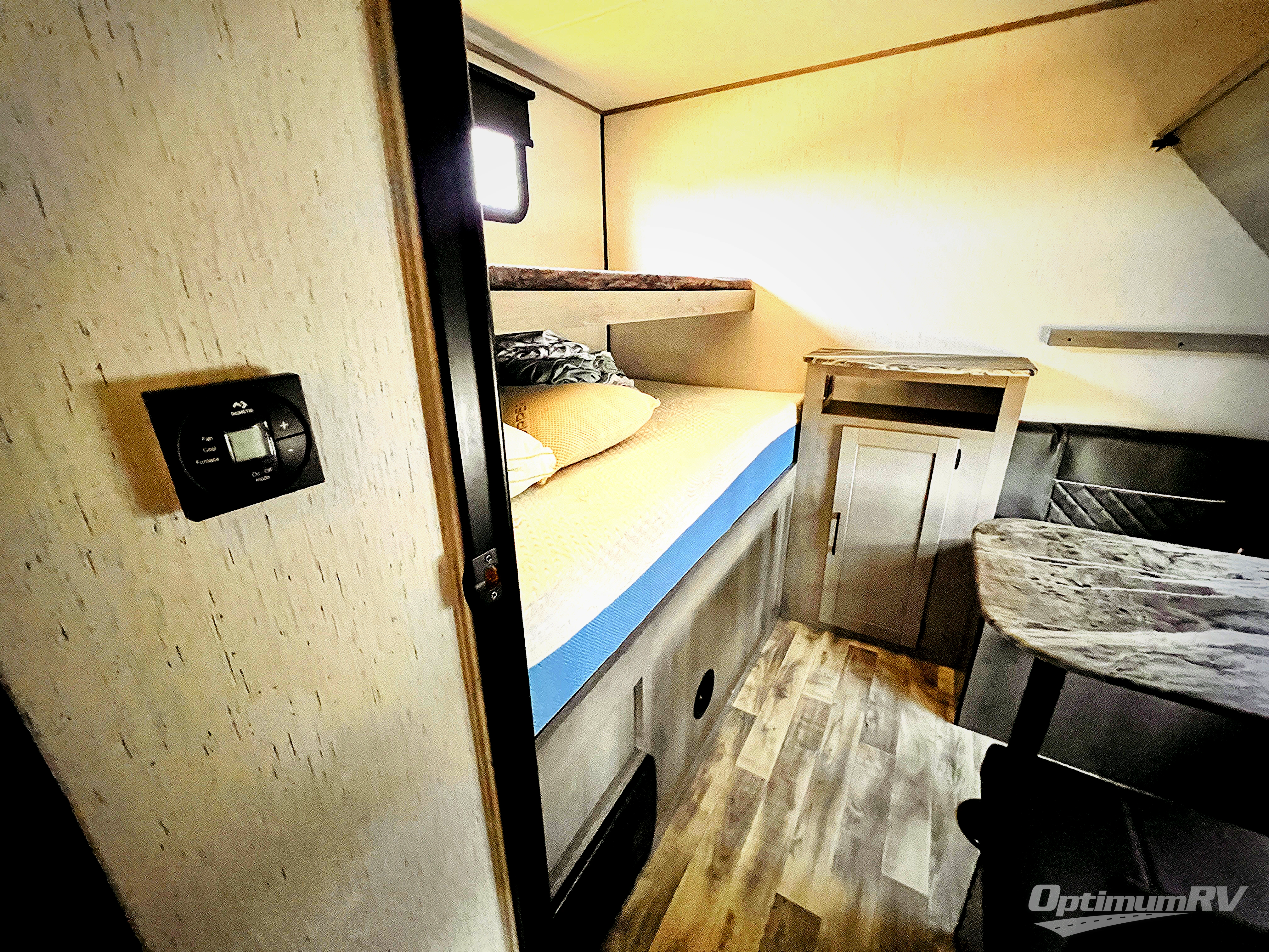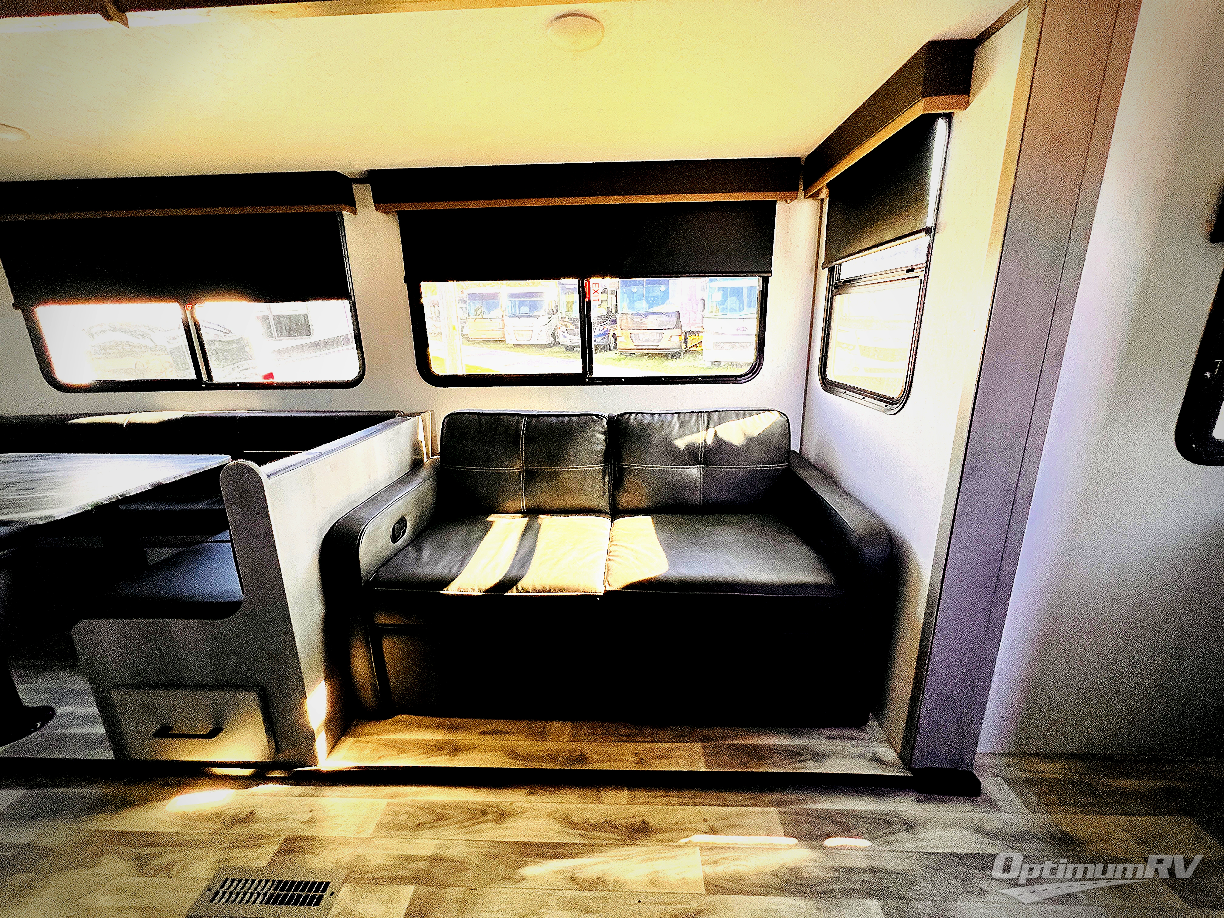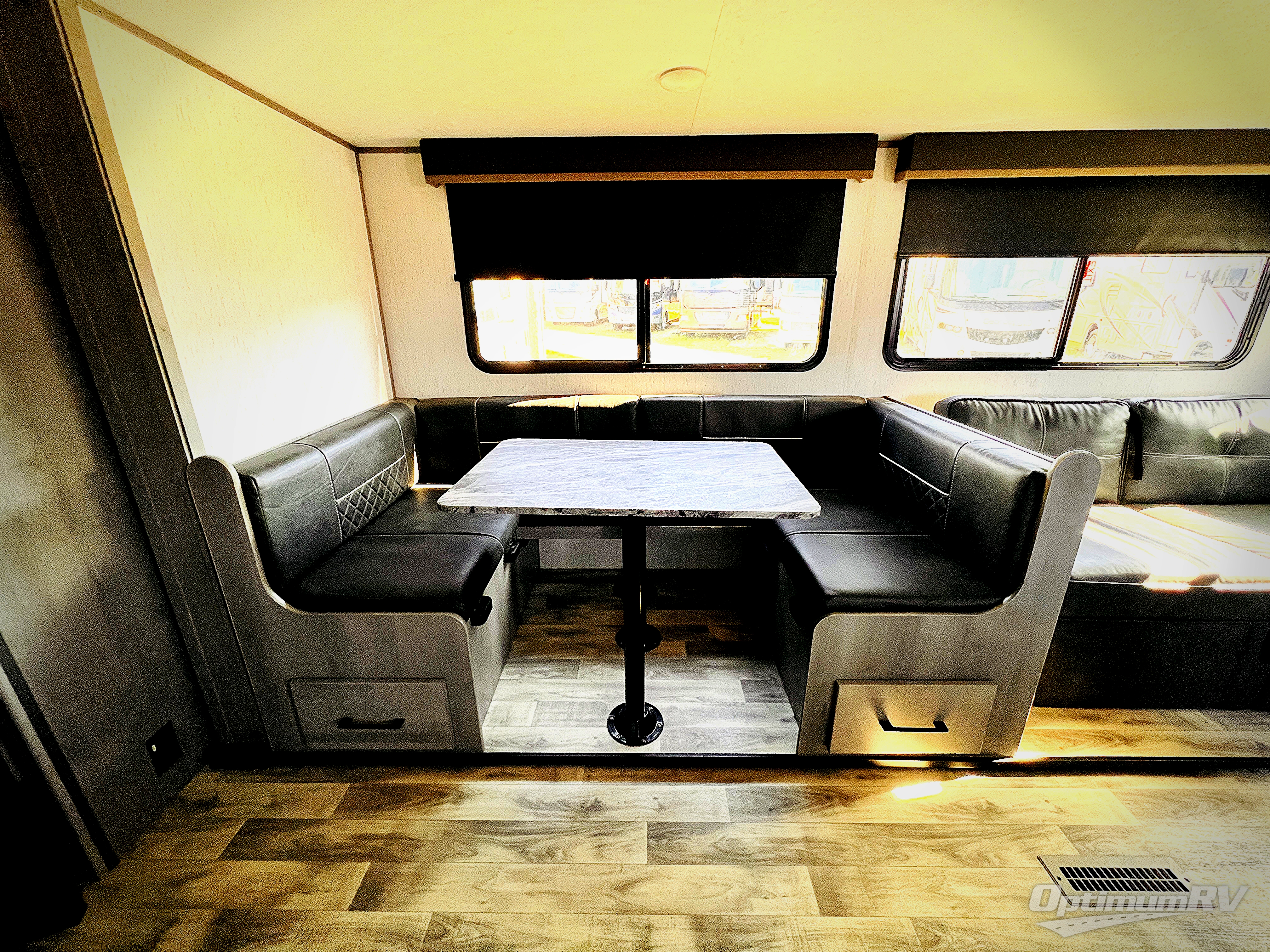 If you've been looking for a lightweight travel trailer with a large sleeping capacity, your search is over! This model can sleep nine comfortably between the queen bed, the furniture within the large slide out, and the private bunkhouse. Your group will love to visit under the 18' power awning with LED lights, especially while dinner is being made on the outside kitchen. If the weather isn't cooperating, just head indoors for game night around the U-shaped dinette!