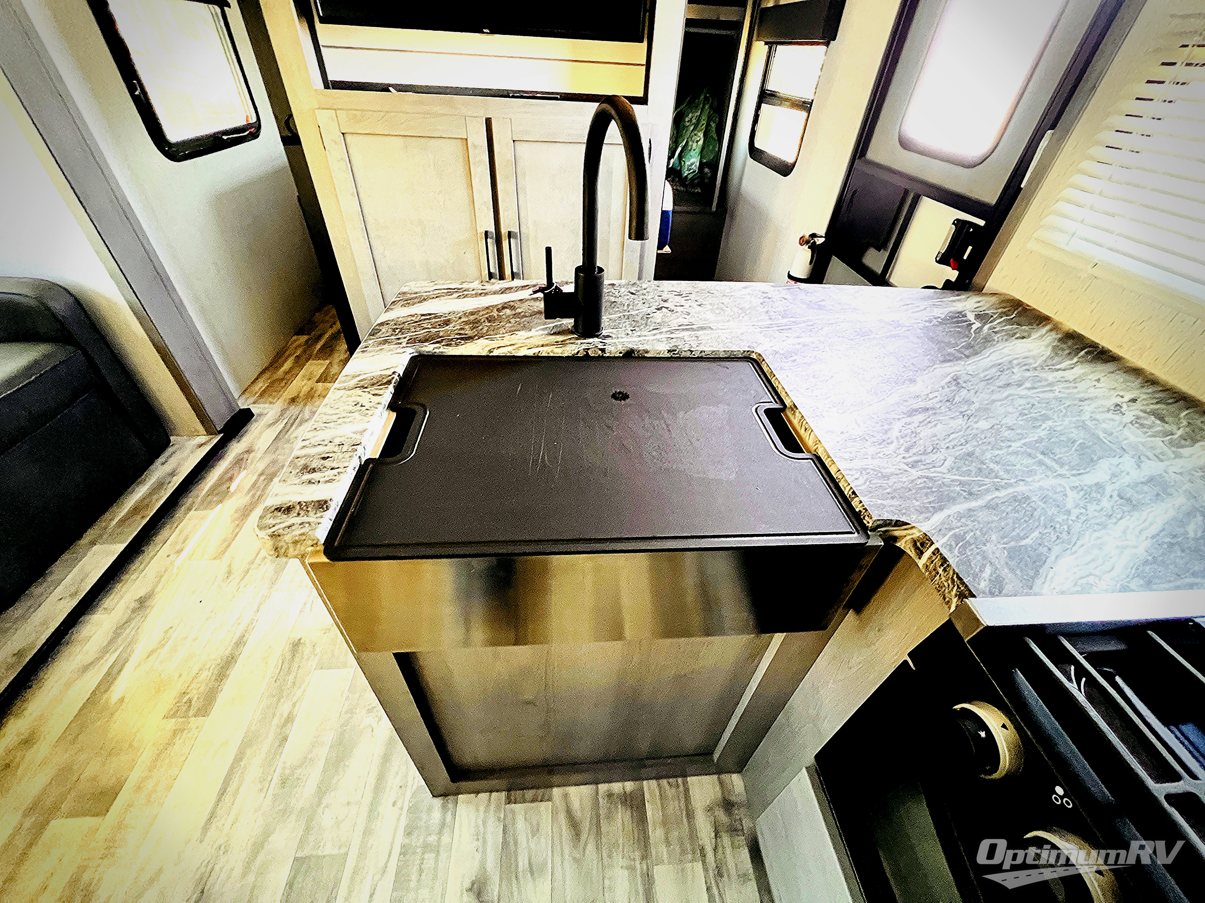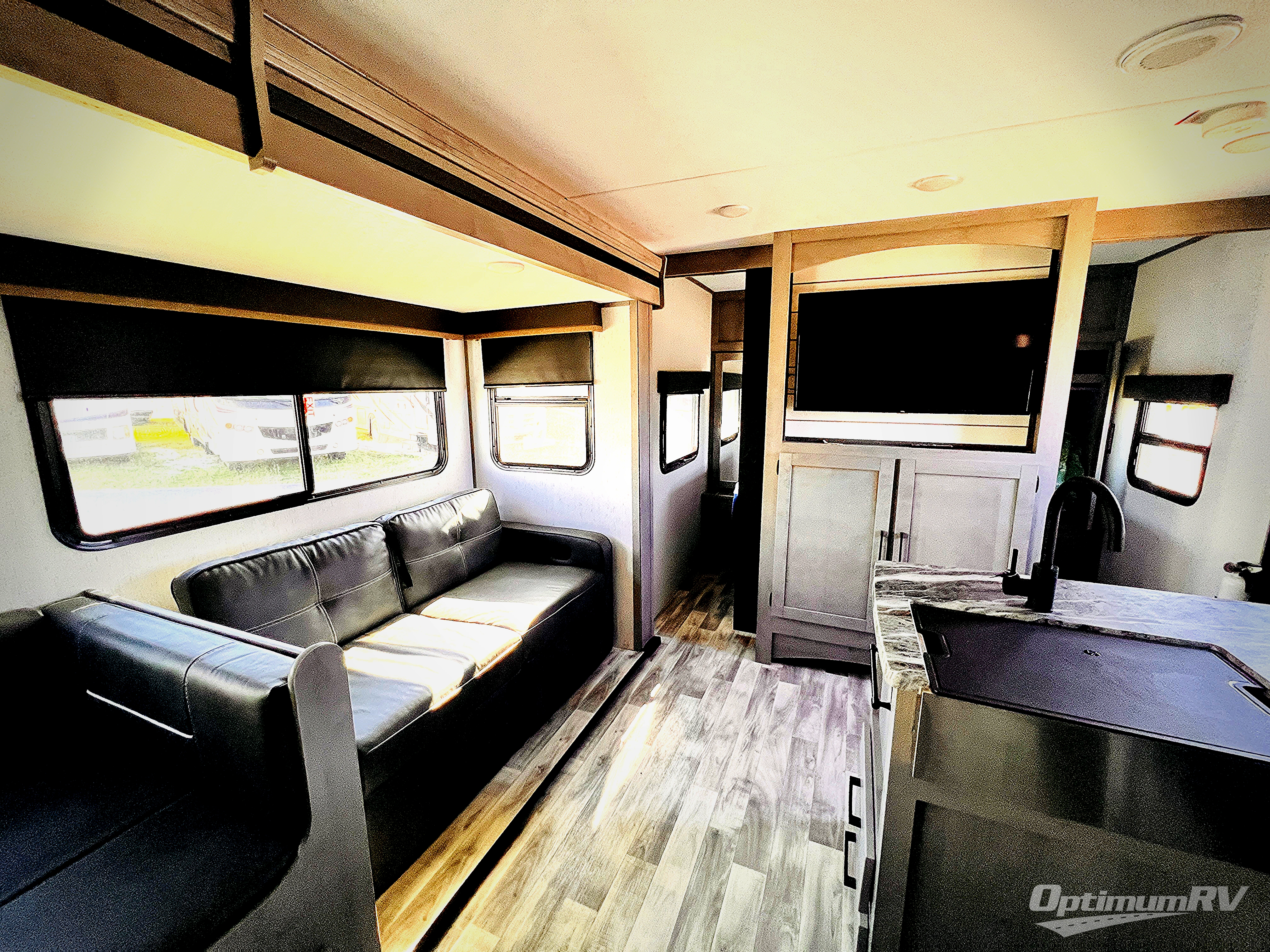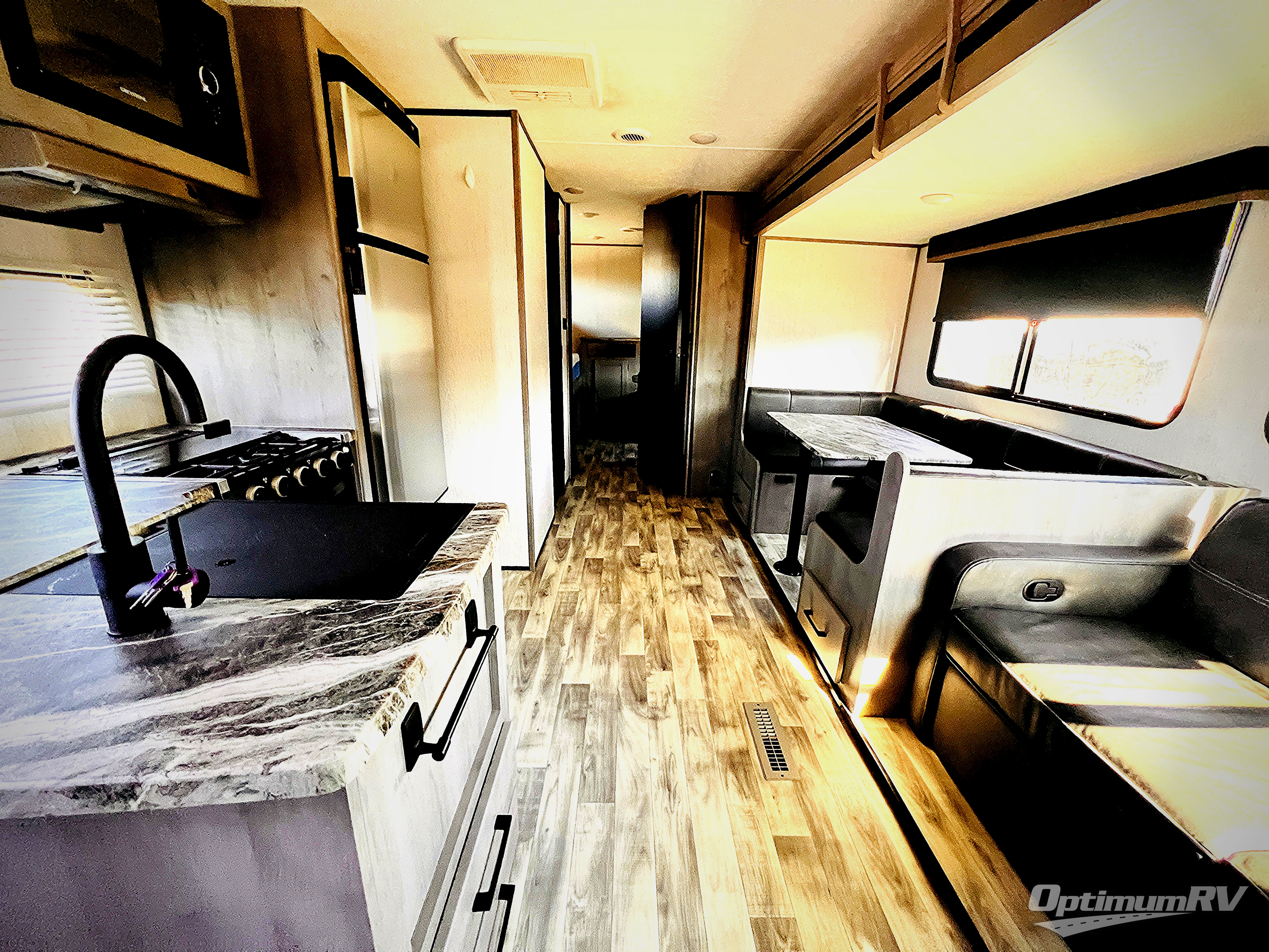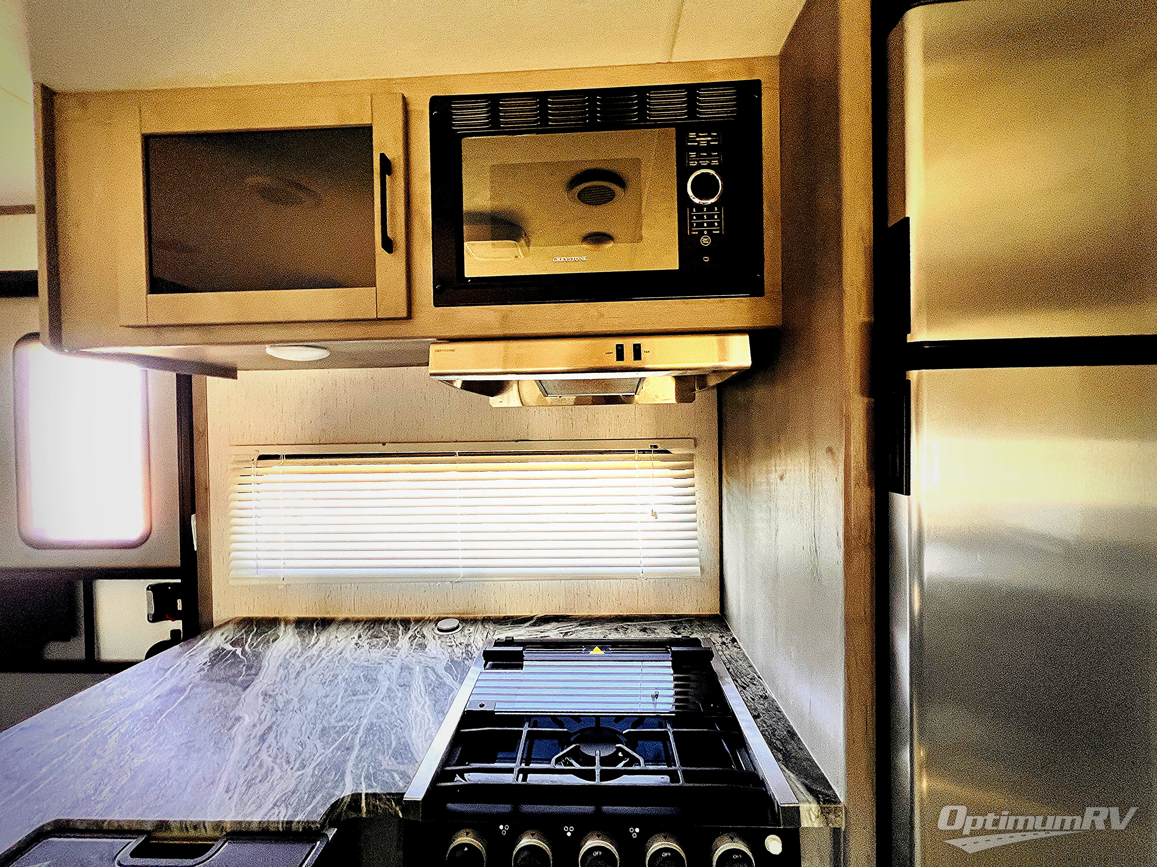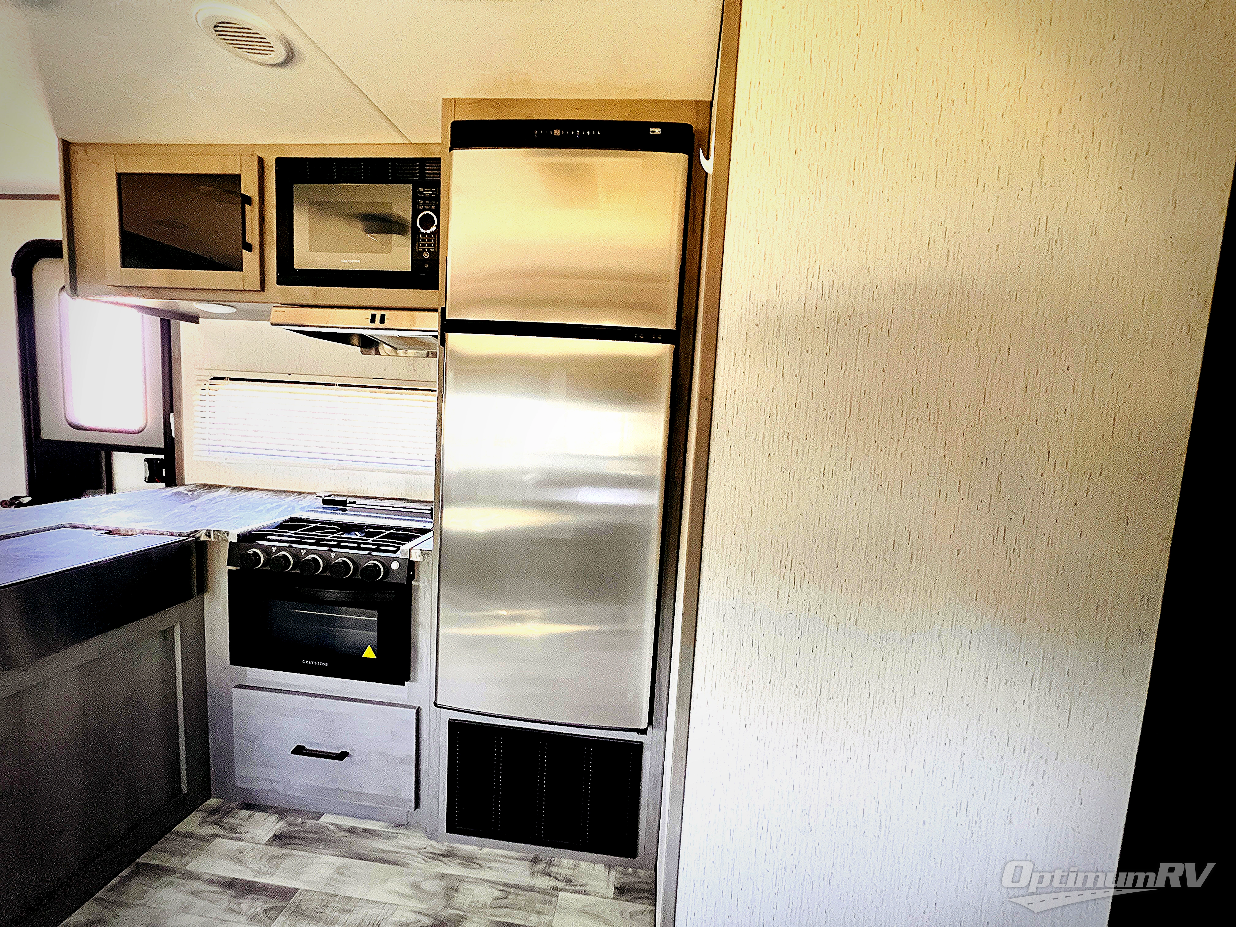 If you've been looking for a lightweight travel trailer with a large sleeping capacity, your search is over! This model can sleep nine comfortably between the queen bed, the furniture within the large slide out, and the private bunkhouse. Your group will love to visit under the 18' power awning with LED lights, especially while dinner is being made on the outside kitchen. If the weather isn't cooperating, just head indoors for game night around the U-shaped dinette!