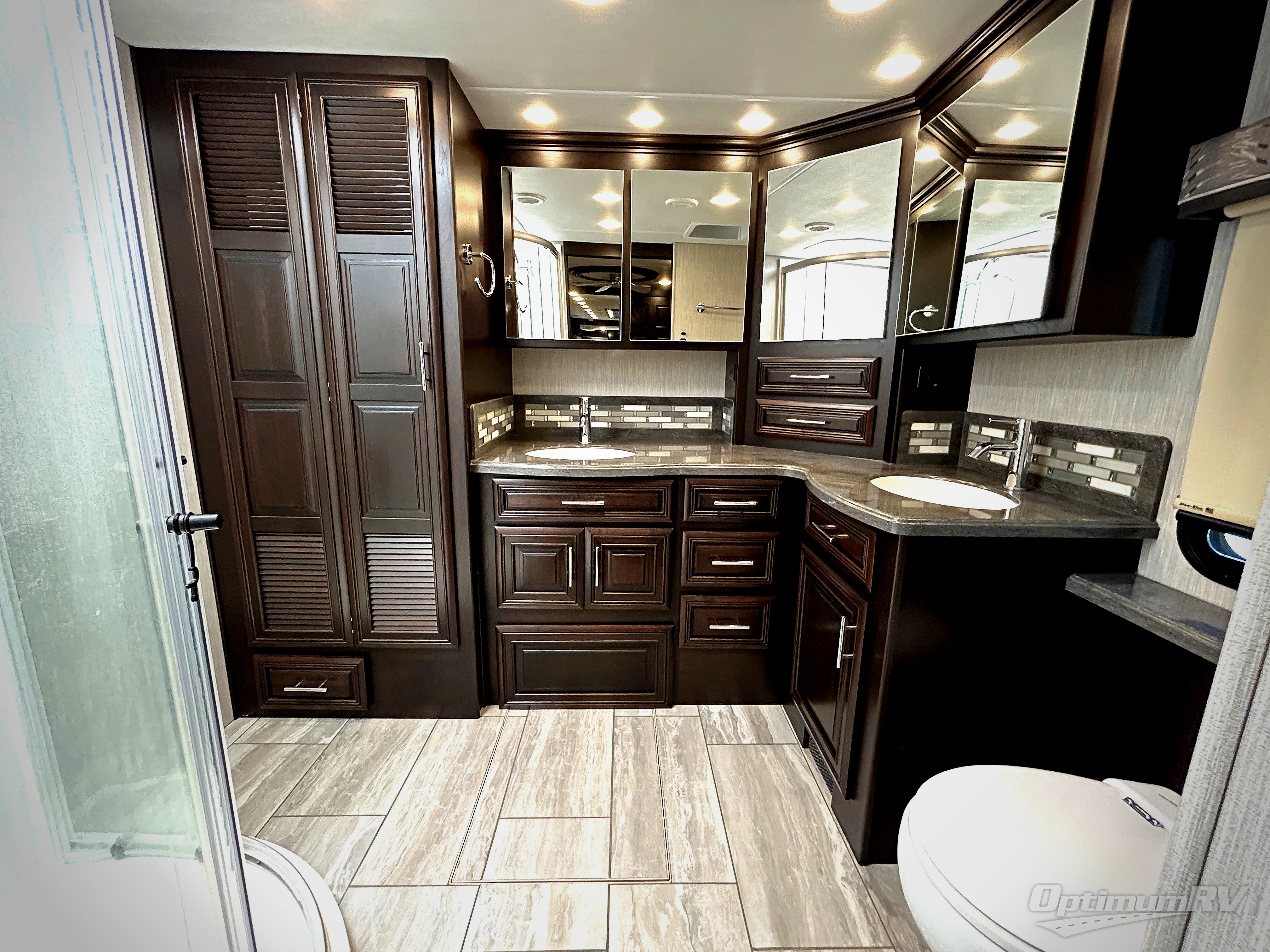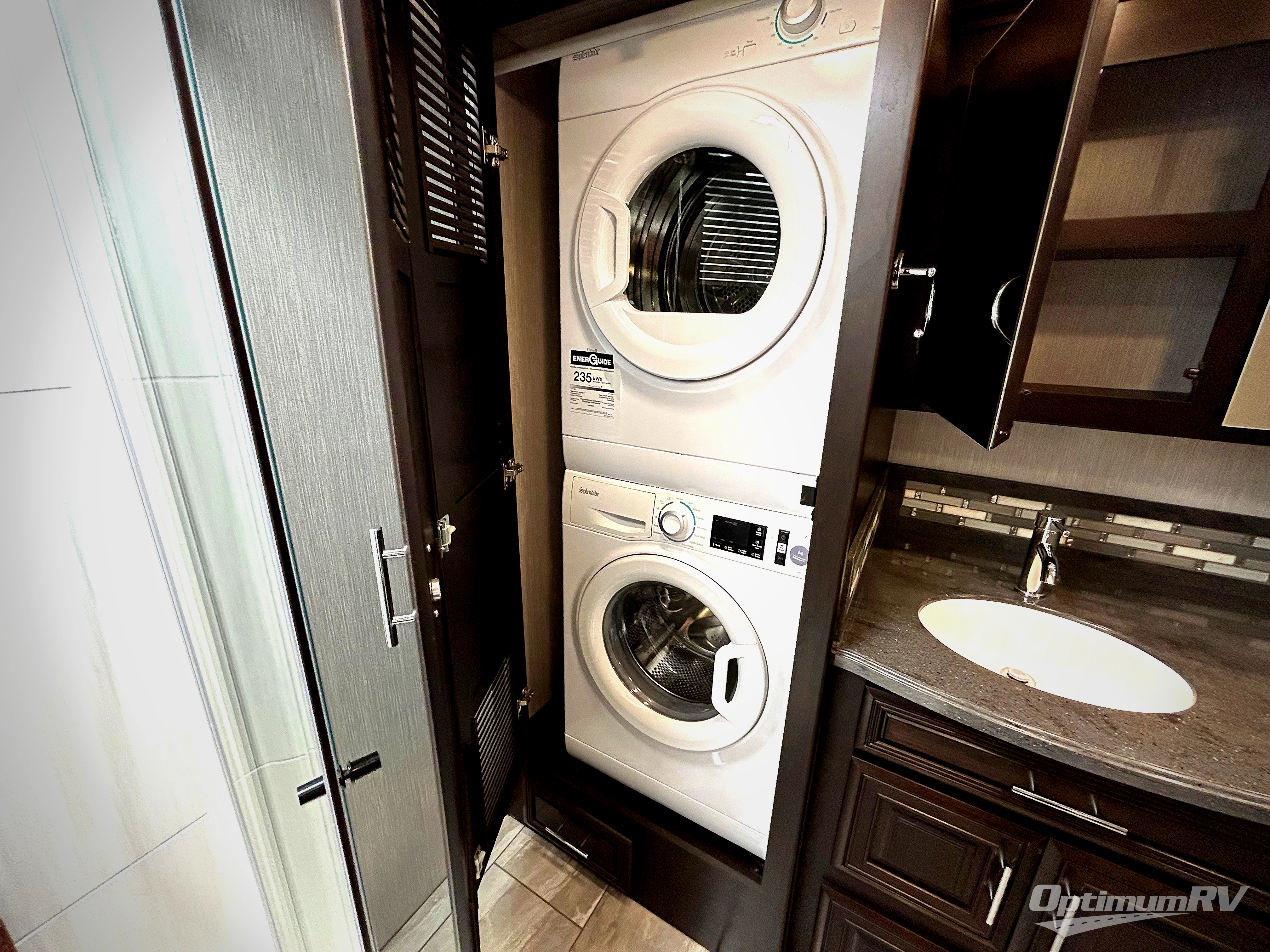 You will find luxury all throughout this motorhome! The bunk lift over cab has overhead cabinets and a 32" LED TV and the large wardrobe can turn into a set of 30" x 73" bunk beds with two LED TV's. You're going to feel right at home in the master suite with the king bed slide with a ceiling fan above it, a dresser next to a full height wardrobe, a safe for your valuables, and a 32" LED TV, plus its very own full rear bathroom. Inside the bathroom is a dual sink vanity, a radius shower to freshen up in, a linen closet with drawers, and an area prepped to add an optional washer and dryer. The second full bathroom has a shower and a mirrored vanity overhead above the sink and a porcelain china bowl toilet with foot flush. The kitchen has everything you will need to prepare your best home cooked meals and you can enjoy them at the booth dinette. The Villa Ultrafab hide-a-bed sofa offers a comfortable place to relax at night while enjoying the fireplace and watching a show with the 43" LED TV, but you can switch it out for the optional theater seating instead!