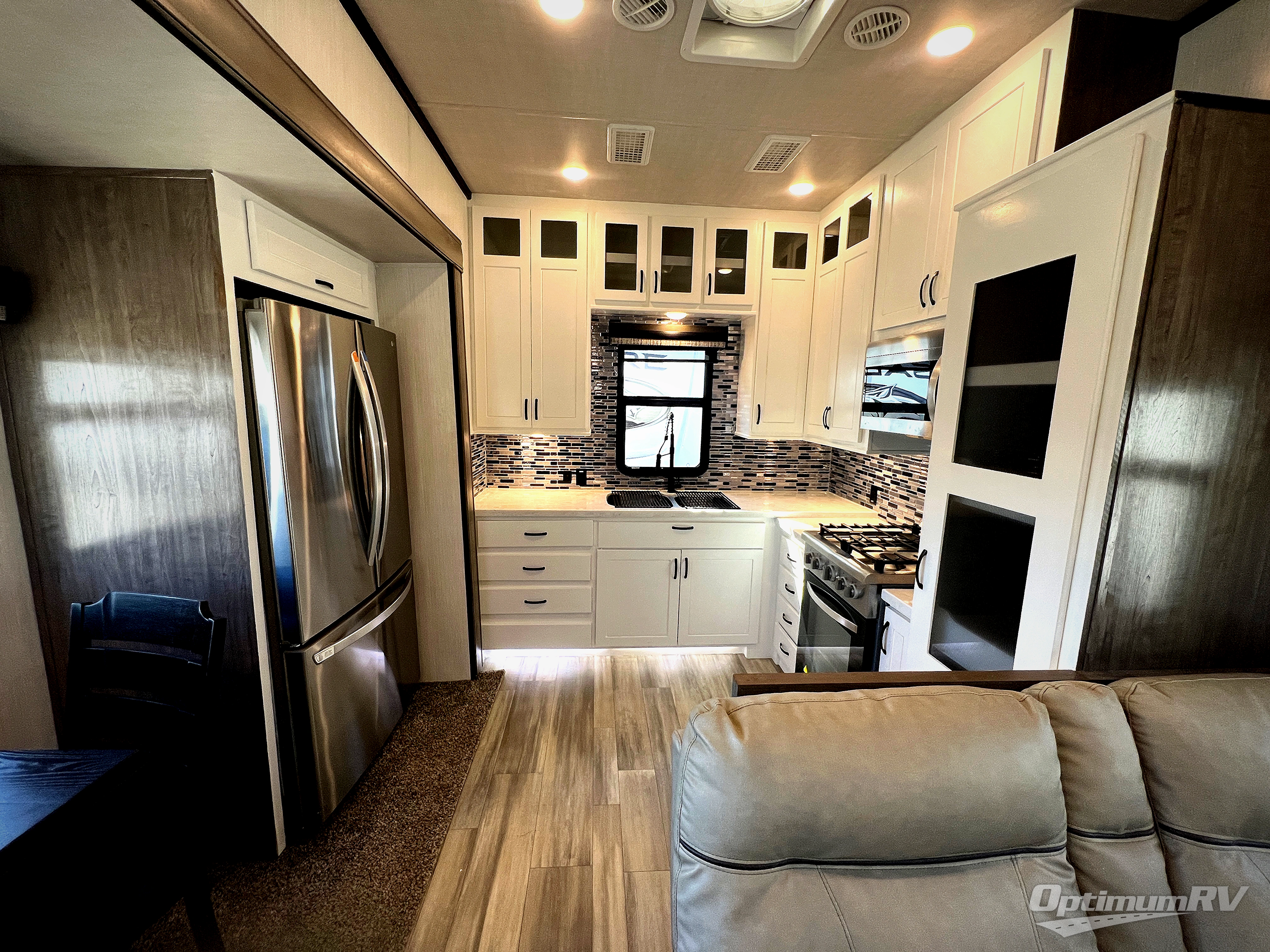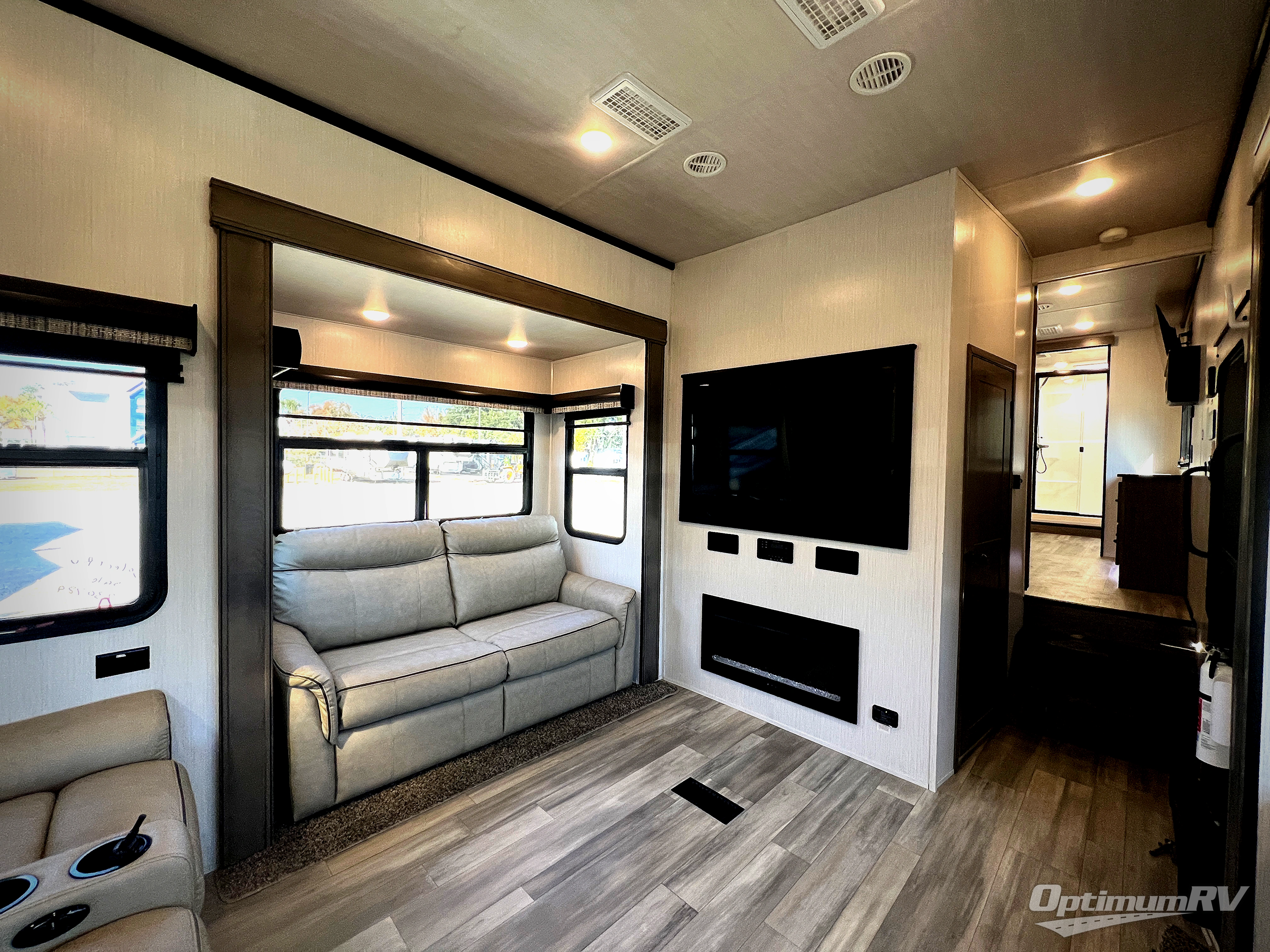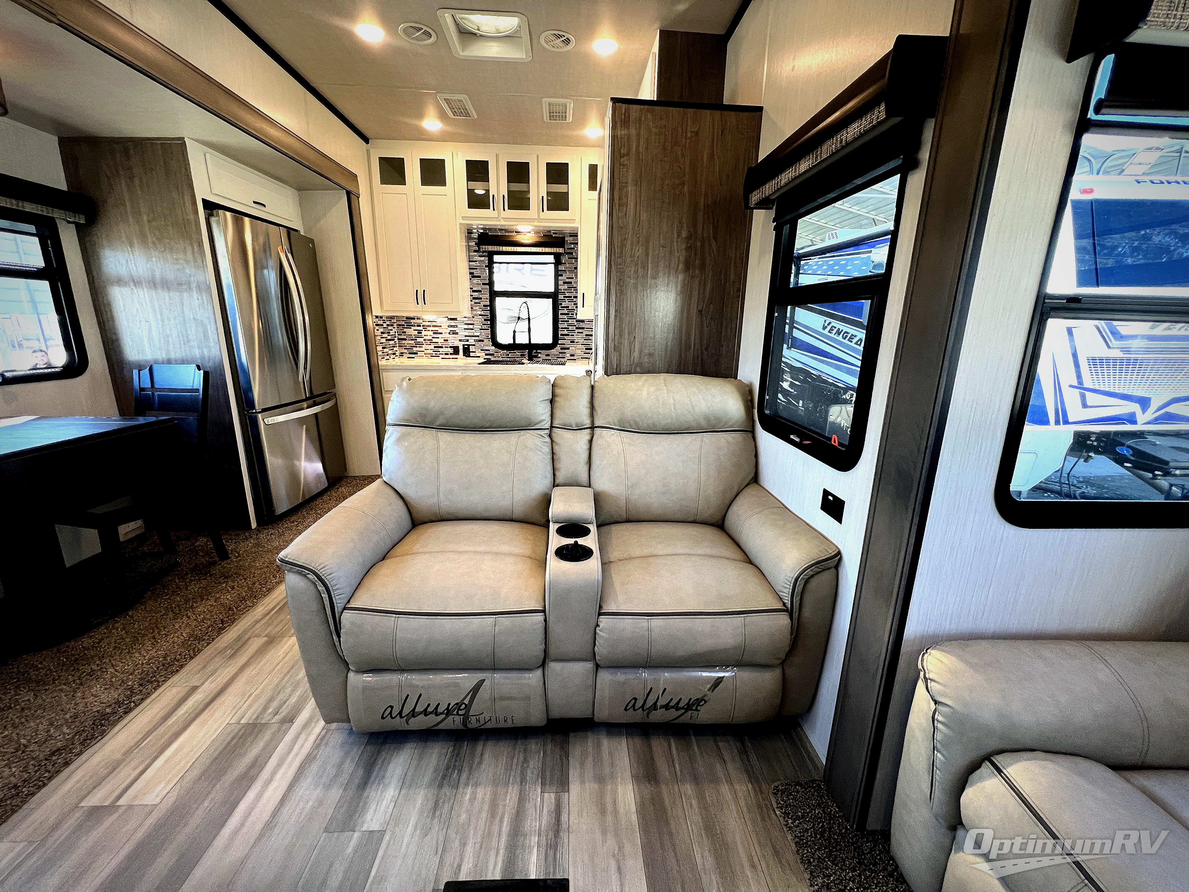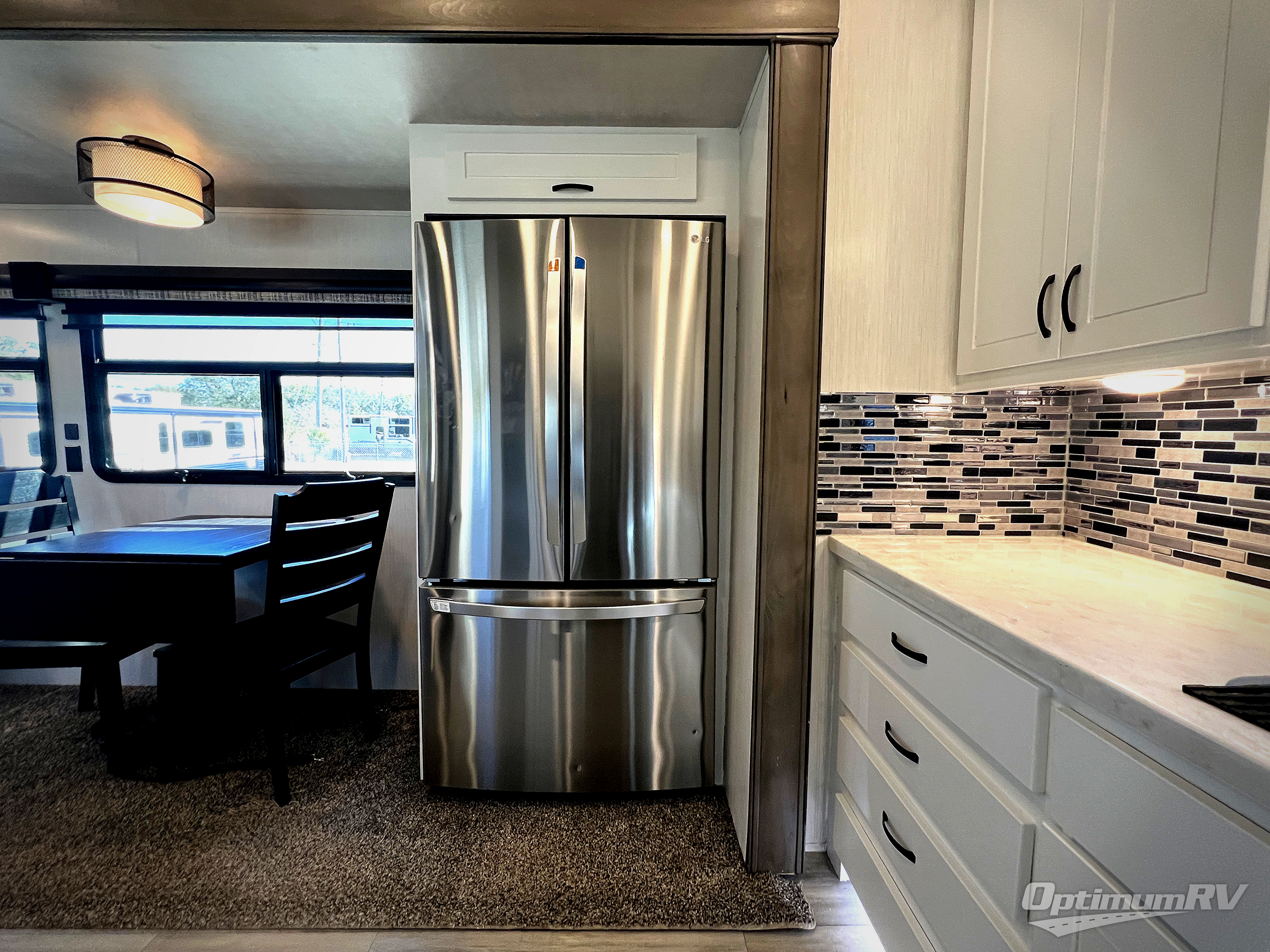 If you need to get some work done while you are camping in this fifth wheel then you will appreciate the desk with a chair! The rear kitchen has plenty of countertop space and a free standing 24" gas range for you to prepare your best meals, a 20 cu. ft. stainless steel electric refrigerator with ice maker to store any leftovers, and a free standing table to enjoy your meals then play card games. The hide-a-bed sofa slide opens up the living area which also has power theater seating with USB charging across from an entertainment center with a fireplace and 50" flat screen TV to watch your favorite movies. The half bathroom has an area prepped to add an optional washer and dryer so you can have clean clothes throughout your entire trip. Inside the master suite is a king bed slide and access to the front full bathroom which has a walk-in closet with a bench, a 48" x 30" shower with a seat, and a dual sink vanity for two to get ready at once. You can even choose to add the optional pull-out kitchen to cook your meals while breathing in fresh air!