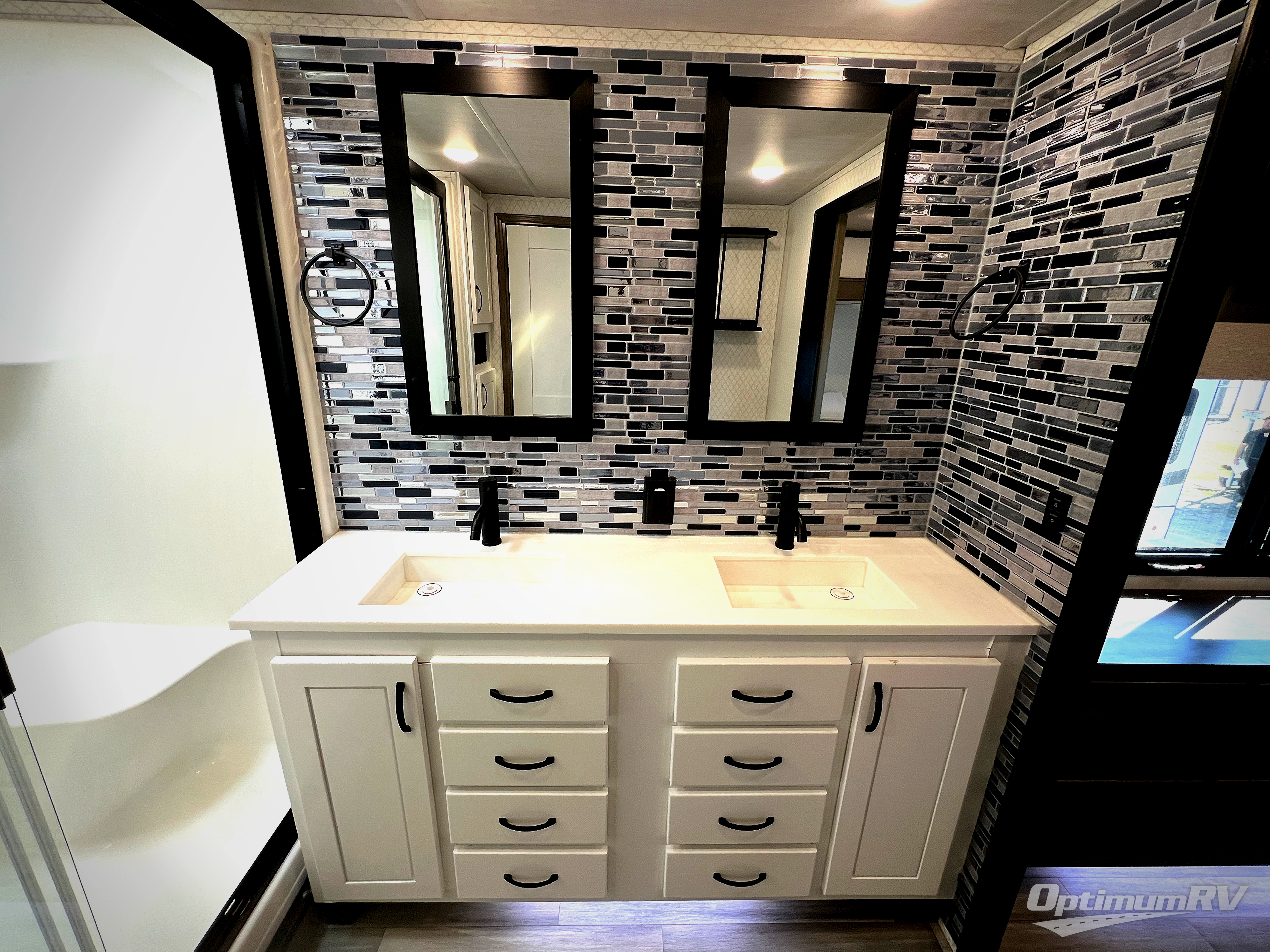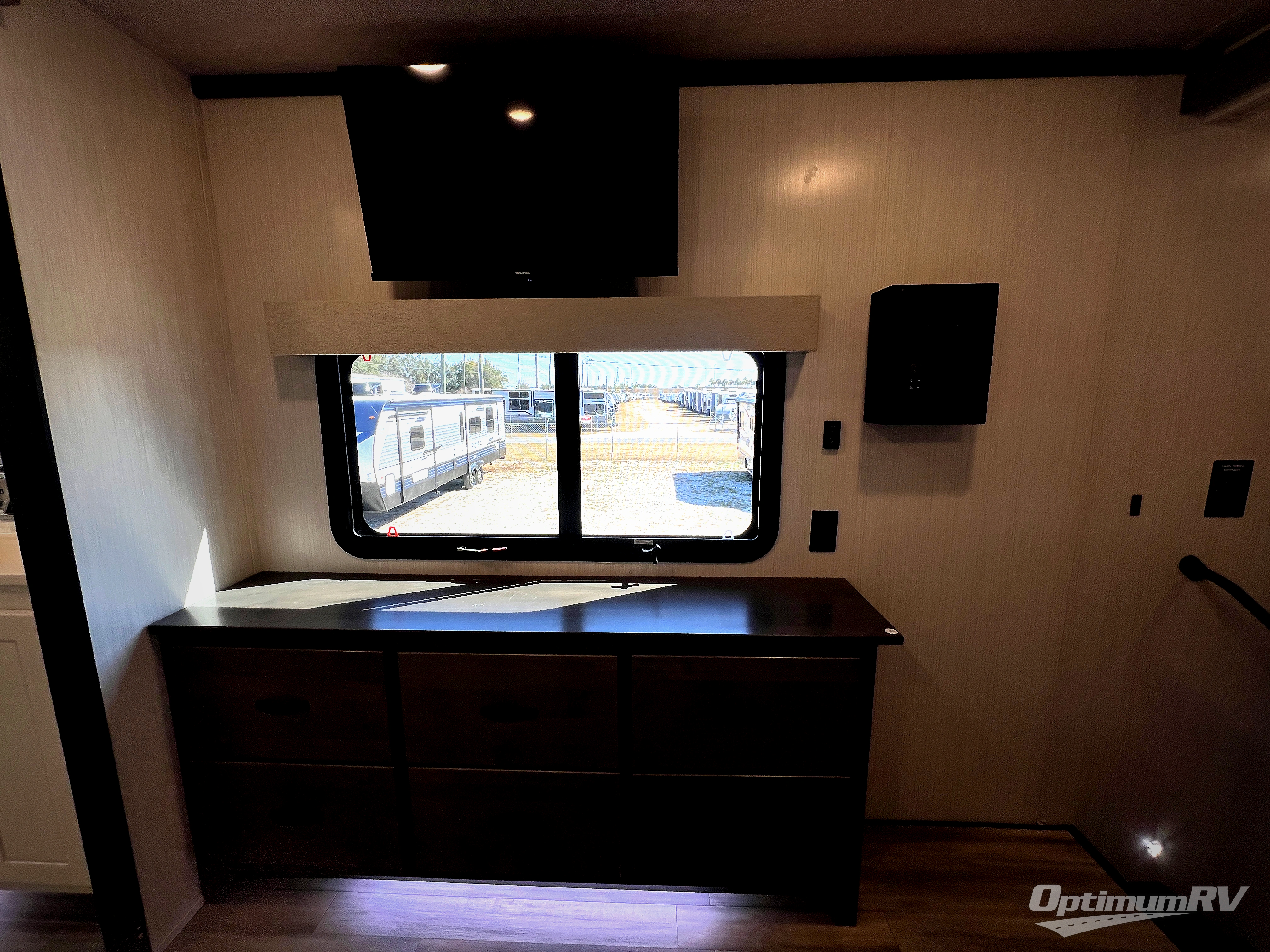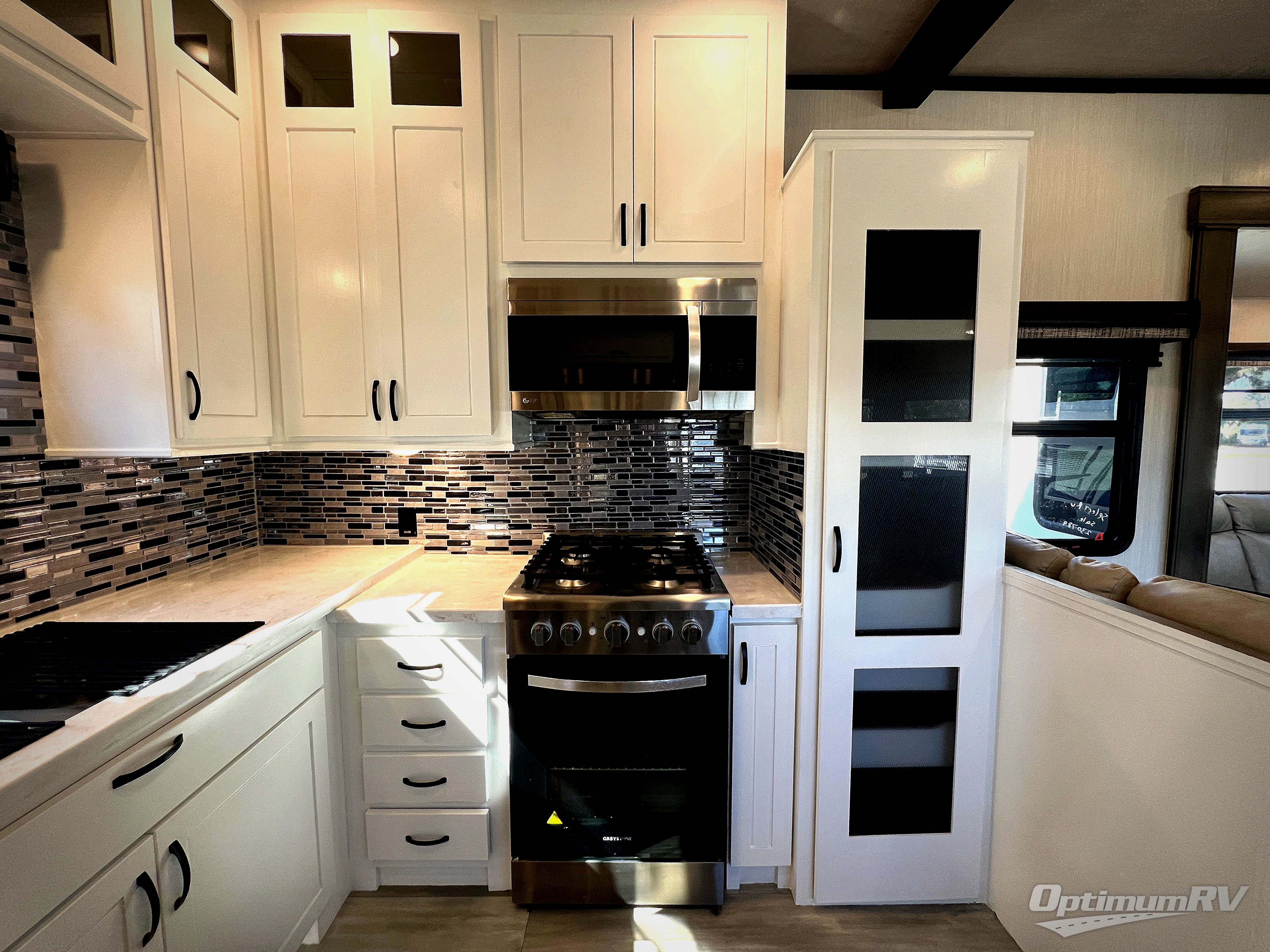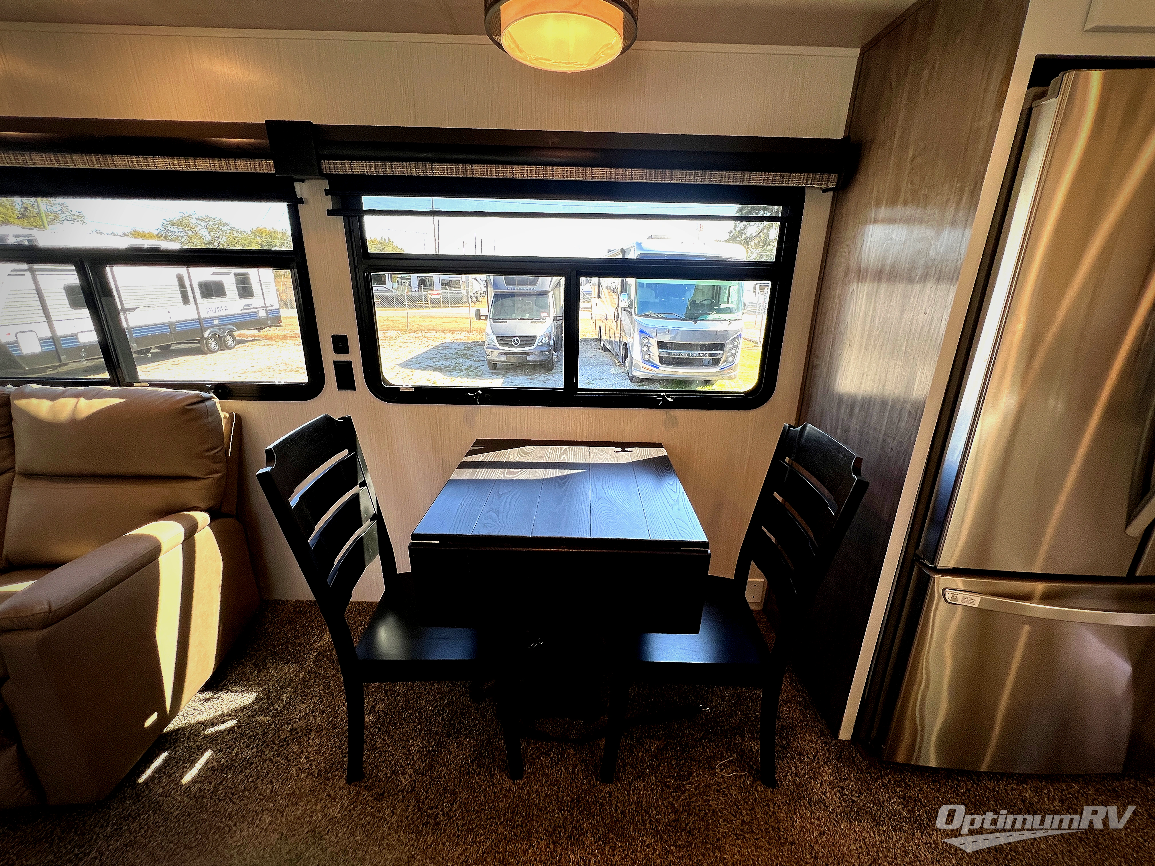 If you need to get some work done while you are camping in this fifth wheel then you will appreciate the desk with a chair! The rear kitchen has plenty of countertop space and a free standing 24" gas range for you to prepare your best meals, a 20 cu. ft. stainless steel electric refrigerator with ice maker to store any leftovers, and a free standing table to enjoy your meals then play card games. The hide-a-bed sofa slide opens up the living area which also has power theater seating with USB charging across from an entertainment center with a fireplace and 50" flat screen TV to watch your favorite movies. The half bathroom has an area prepped to add an optional washer and dryer so you can have clean clothes throughout your entire trip. Inside the master suite is a king bed slide and access to the front full bathroom which has a walk-in closet with a bench, a 48" x 30" shower with a seat, and a dual sink vanity for two to get ready at once. You can even choose to add the optional pull-out kitchen to cook your meals while breathing in fresh air!