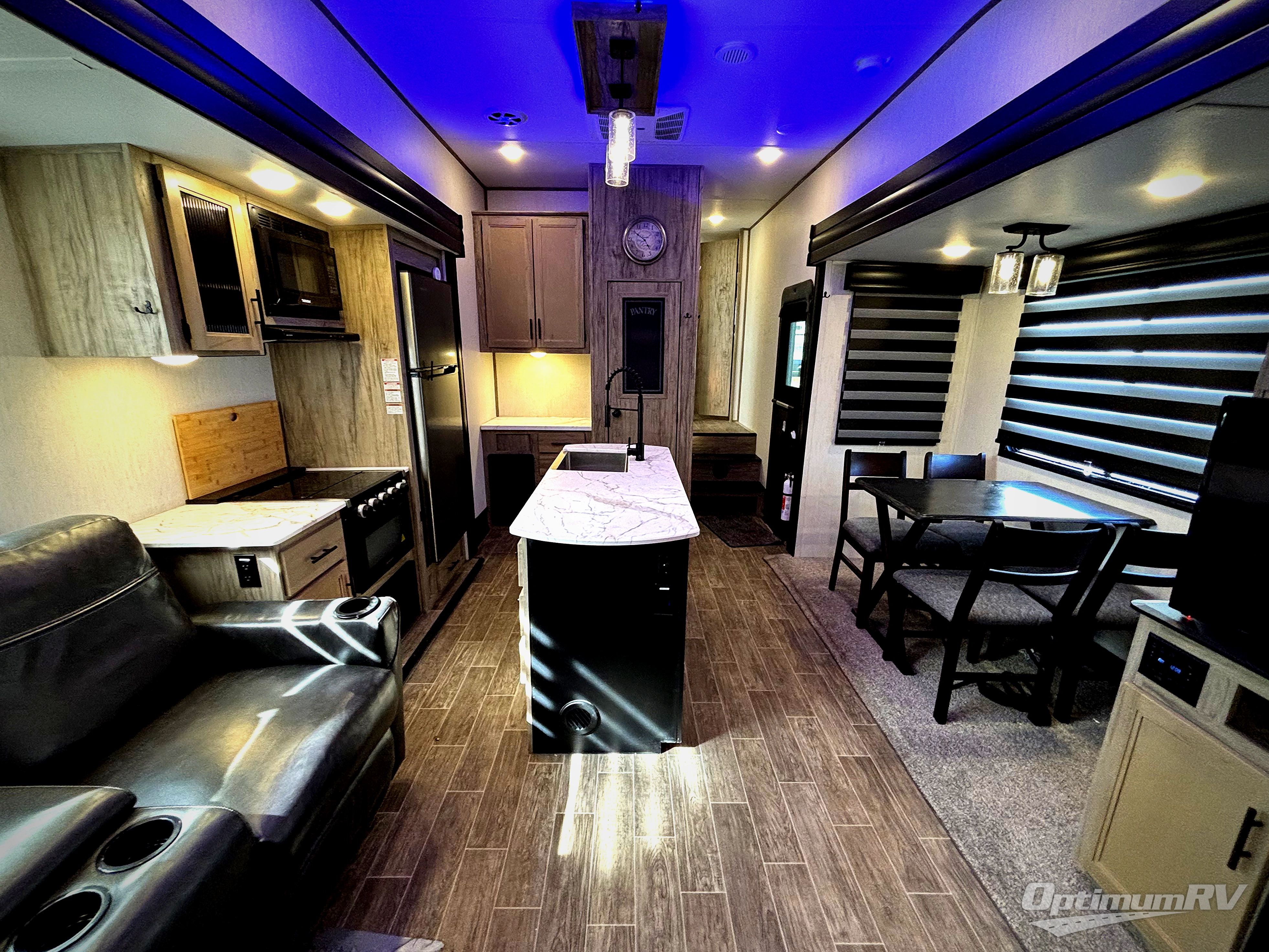 This Cherokee Arctic Wolf Suite fifth wheel is quite extraordinary and accommodating! It has a set of opposing slides in the main living area so that you can have more space to sit back on the theater seating and tri-fold sofa. You can switch on the fireplace to add some warmth to this space if it's a cool night, or if it is a hot afternoon, simply switch on the ceiling fan. The table with two fixed/two foldable chairs is going to be great for sitting down to eat a meal together, and after dinner, you can prepare coffee for everyone at the coffee bar. You'll also be able to grab dessert from the walk-in pantry to go with your coffee. The Juice Pack 50W solar panel will help your unit stay powered when you can't connect at a campsite, and the private bedroom up front is going to provide great relaxation with its king bed slide.