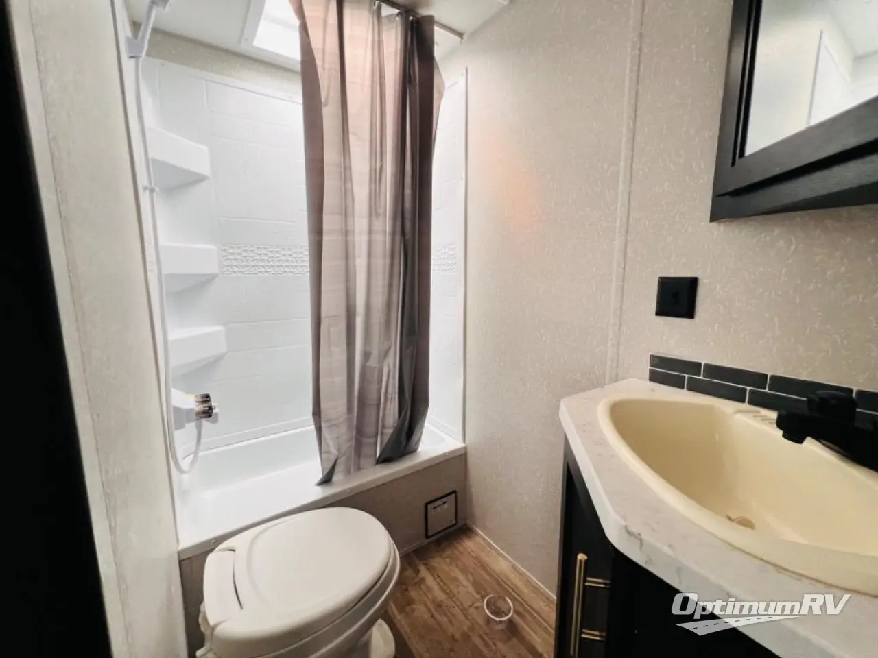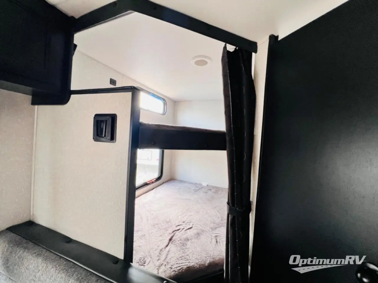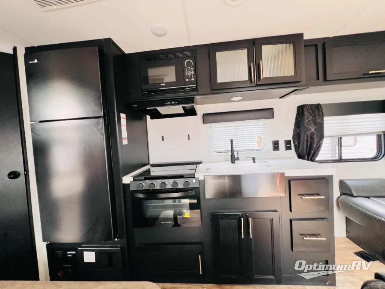 Enjoy cooking for nine in this Cherokee Grey Wolf travel trailer. With a three-burner cooktop, an overhead microwave, and an oven, you can easily cook just like home. The residential farm-style stainless steel sink makes cleaning your larger pots and pans quite simple, and the large overhead cabinets make storage an easy task as well. There is plenty of seating for the whole gang with the sofa and the booth dinette to play a game or two after you have enjoyed your delicious meal. Your kiddos are sure to love having their own set of double-size bunks conveniently located next to the rear bath, and you will love having your own front semi-private bedroom when you close the privacy curtain. You can also create some outdoor living space beneath the 15' power awning so that you can enjoy the great outdoors whether rain or shine!