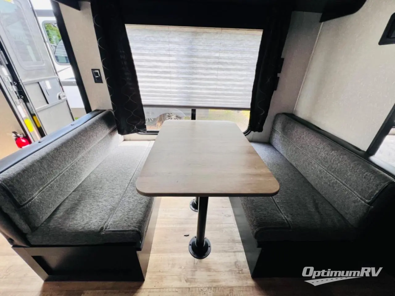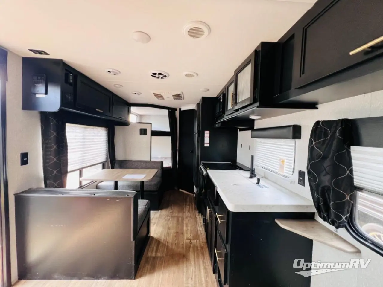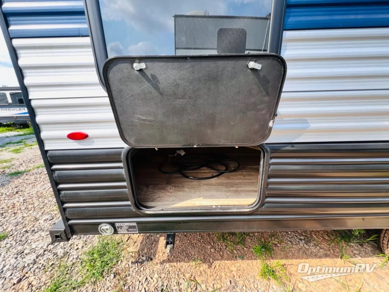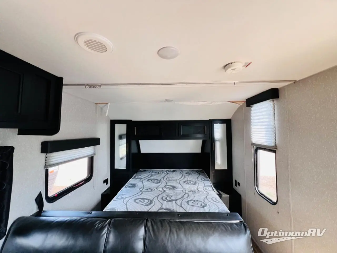 Enjoy cooking for nine in this Cherokee Grey Wolf travel trailer. With a three-burner cooktop, an overhead microwave, and an oven, you can easily cook just like home. The residential farm-style stainless steel sink makes cleaning your larger pots and pans quite simple, and the large overhead cabinets make storage an easy task as well. There is plenty of seating for the whole gang with the sofa and the booth dinette to play a game or two after you have enjoyed your delicious meal. Your kiddos are sure to love having their own set of double-size bunks conveniently located next to the rear bath, and you will love having your own front semi-private bedroom when you close the privacy curtain. You can also create some outdoor living space beneath the 15' power awning so that you can enjoy the great outdoors whether rain or shine!
